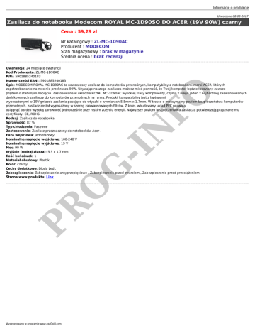 Informacje o produkcie Utworzono 08-03-2017 Zasilacz do notebooka Modecom ROYAL MC-1D90SO DO ACER (19V 90W) czarny Cena : 59,29 zł Nr katalogowy : ZL-MC-1D90AC Producent : MODECOM Stan magazynowy : brak w magazynie Średnia ocena : brak recenzji PR O G -I N FO Gwarancja: 24 miesiące gwarancji Kod Producenta: ZL-MC-1D90AC P/N:: 5901885240183 Numer części EAN:: 5901885240183 Opis: MODECOM ROYAL MC-1D90AC to nowoczesny zasilacz do komputerów przenośnych, kompatybilny z notebookami marki ACER, których zapotrzebowanie na moc nie przekracza 90W. Używając naszego zasilacza możesz mieć pewność, że Twój komputer będzie ładowany zawsze prądem o stabilnym napięciu. Zastosowane w układzie ROYAL MC-1D90AC wysokiej klasy komponenty, czynią z niego jeden z najbardziej zaawansowanych dedykowanych zasilaczy do komputerów przenośnych na rynku. Produkt kompatybilny jest z laptopami wyposażonymi w 19V gniazdo zasilania pasujące do wtyczki o wymiarach 5.5mm x 1.7mm. W trosce o maksymalny poziom bezpieczeństwa komputerów przenośnych, zasilacz został wyposażony w szereg zaawansowanych filtrów. Z kolei, wbudowany układ PFC pozwala osiągnąć bardzo wysoką sprawność jednocześnie przy niskim zużyciu energii. Najwyższy poziom bezpieczeństwa zasilacza potwierdzają przyznane mu certyfikaty: CE, ROHS. Rodzaj: Zasilacz do notebooka Sprawność: 87 % Typ chłodzenia: Pasywne Zastosowanie: Zasilacz przeznaczony do notebooków Acer . Faza wejściowa: Jednofazowy Nominalne napięcie wejściowe: 100-240 V Nominalne napięcie wyjściowe: 19 V Moc: 90 W Wyjście (rodzaj złącza): 5.5 x 1.7 mm Ilość końcówek: 1 Materiał obudowy: Plastik Kolor: czarny Cechy dodatkowe: Dioda Led . Zabezpieczenia: Zabezpieczenie antyprzepięciowe , Zabezpieczenie przed zwarciem , Zabezpieczenie przed przeciążeniem Strona www produktu: Link Wygenerowano w programie www.oscGold.com