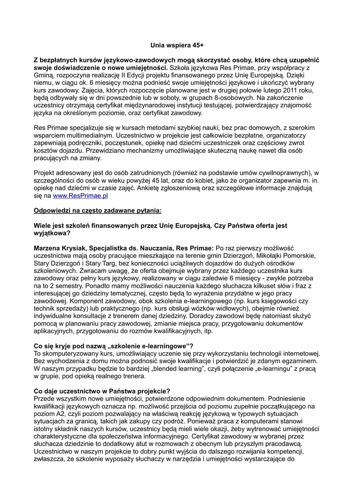 Unia wspiera 45+ Z bezpłatnych kursów językowo-zawodowych mogą skorzystać osoby, które chcą uzupełnić swoje doświadczenie o nowe umiejętności. Szkoła językowa Res Primae, przy współpracy z Gminą, rozpoczyna realizację II Edycji projektu finansowanego przez Unię Europejską. Dzięki niemu, w ciągu ok. 6 miesięcy można podnieść swoje umiejętności językowe i ukończyć wybrany kurs zawodowy. Zajęcia, których rozpoczęcie planowane jest w drugiej połowie lutego 2011 roku, będą odbywały się w dni powszednie lub w soboty, w grupach 8-osobowych. Na zakończenie uczestnicy otrzymają certyfikat międzynarodowej instytucji testującej, potwierdzający znajomość języka na określonym poziomie, oraz certyfikat zawodowy. Res Primae specjalizuje się w kursach metodami szybkiej nauki, bez prac domowych, z szerokim wsparciem multimedialnym. Uczestnictwo w projekcie jest całkowicie bezpłatne, organizatorzy zapewniają podręczniki, poczęstunek, opiekę nad dziećmi uczestniczek oraz częściowy zwrot kosztów dojazdu. Przewidziano mechanizmy umożliwiające skuteczną naukę nawet dla osób pracujących na zmiany. Projekt adresowany jest do osób zatrudnionych (również na podstawie umów cywilnoprawnych), w szczególności do osób w wieku powyżej 45 lat, oraz do kobiet, jako że organizator zapewnia m. in. opiekę nad dziećmi w czasie zajęć. Ankietę zgłoszeniową oraz szczegółowe informacje znajdują się na www.ResPrimae.pl Odpowiedzi na często zadawane pytania: Wiele jest szkoleń finansowanych przez Unię Europejską. Czy Państwa oferta jest wyjątkowa? Marzena Krysiak, Specjalistka ds. Nauczania, Res Primae: Po raz pierwszy możliwość uczestnictwa mają osoby pracujące mieszkające na terenie gmin Dzierzgoń, Mikołajki Pomorskie, Stary Dzierzgoń i Stary Targ, bez konieczności uciążliwych dojazdów do dużych ośrodków szkoleniowych. Zwracam uwagę, że oferta obejmuje wybrany przez każdego uczestnika kurs zawodowy oraz pełny kurs językowy, realizowany w ciągu zaledwie 6 miesięcy - zwykle potrzeba na to 2 semestry. Ponadto mamy możliwości nauczenia każdego słuchacza kilkuset słów i fraz z interesującej go dziedziny tematycznej, często będą to wyrażenia przydatne w jego pracy zawodowej. Komponent zawodowy, obok szkolenia e-learningowego (np. kurs księgowości czy technik sprzedaży) lub praktycznego (np. kurs obsługi wózków widłowych), obejmie również indywidualne konsultacje z trenerem danej dziedziny. Doradcy zawodowi będę natomiast służyć pomocą w planowaniu pracy zawodowej, zmianie miejsca pracy, przygotowaniu dokumentów aplikacyjnych, przygotowaniu do rozmów kwalifikacyjnych, itp. Co się kryje pod nazwą „szkolenie e-learningowe”? To skomputeryzowany kurs, umożliwiający uczenie się przy wykorzystaniu technologii internetowej. Bez wychodzenia z domu można podnosić swoje kwalifikacje i potwierdzić je zdanym egzaminem. W naszym przypadku będzie to bardziej „blended learning”, czyli połączenie „e-learningu” z pracą w grupie, pod opieką realnego trenera. Co daje uczestnictwo w Państwa projekcie? Przede wszystkim nowe umiejętności, potwierdzone odpowiednim dokumentem. Podniesienie kwalifikacji językowych oznacza np. możliwość przejścia od poziomu zupełnie początkującego na poziom A2, czyli poziom pozwalający na właściwą reakcję językową w typowych sytuacjach sytuacjach za granicą, takich jak zakupy czy podróż. Ponieważ praca z komputerami stanowi istotny składnik naszych kursów, uczestnicy będą mieli wiele okazji, żeby wytrenować umiejętności charakterystyczne dla społeczeństwa informacyjnego. Certyfikat zawodowy w wybranej przez słuchacza dziedzinie to dodatkowy atut w rozmowach z obecnym lub przyszłym pracodawcą. Uczestnictwo w naszym projekcie to dobry punkt wyjścia do dalszego rozwijania kompetencji, zwłaszcza, że szkolenie wyposaży słuchaczy w narzędzia i umiejętności wystarczające do samodzielnej nauki języka w przyszłości. Znowu prace domowe, testy, odpytywanie... nie da się tego uniknąć? Na pewno nie będziemy wzywać rodziców do szkoły... Prace domowe to czuły punkt współczesnych kursów językowych. Na przestrzeni kilku ostatnich lat naszej działalności udało nam się wypracować własne programy laboratorium językowego i sposoby uczenia prowadzące średnio zdolnego ucznia na kolejny poziom zaawansowania bez prac domowych. Pozostawiamy je dla chętnych i dla osób odpornych na wiedzę. Na dowód tego wprowadziliśmy gwarancję skuteczności, która oznacza, że uczeń chodzący regularnie na zajęcia i robiący na nich zasadniczo to, co trzeba, zda egzamin końcowy. Jakby nie zdał, to uczyłby się za darmo do skutku. Poza tym nasze zajęcia są ciekawe, nastawione na rozmowę, wymianę doświadczeń, oparte na najlepszych materiałach istniejących na rynku. Czego oczekują Państwo od przyszłych uczestników projektu? Wiary w siebie, we własne możliwości. Najczęstszym problemem w tej grupie wiekowej jest strategia „Lepiej nic nie powiem, bo pewnie się pomylę!”, gdy tymczasem warto przyjąć „A powiem, co mi tam, być może się pomylę, ale przynajmniej sobie porozmawiam!”. Dorosły kursant peszy się często łatwiej niż dziecko. A przecież gdyby przyjął wskazaną strategię rozwoju i motywację podobną do tej, która dała mu pracę i to, co w życiu osiągnął do tej pory, bez trudu pokonałby dalekie przestrzenie i w tej dziedzinie. Warto też mieć na uwadze pełną perspektywę całego szkolenia, które będzie trwać ok. 6 miesięcy. Wprawdzie będą możliwości odrabiania opuszczonych zajęć, ale zasadniczo warunki postawione przez sponsora, czyli Unię Europejską nie pozwalają na uczestnictwo tymczasowe lub nieregularne. Dlatego zachęcamy do uczestnictwa w całości projektu i dołożymy starań, żeby było ono również miłym sposobem spędzenia wolnego czasu. Mam nadzieję, ż