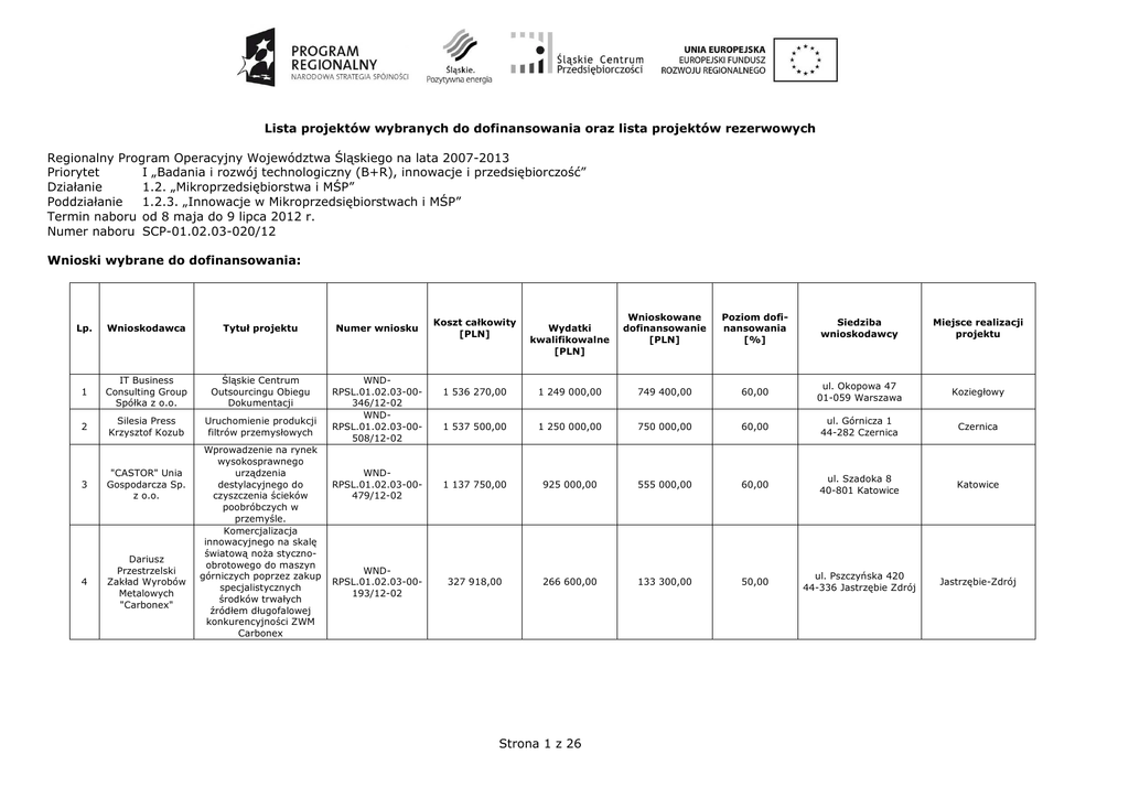 Lista projektów wybranych do dofinansowania oraz lista projektów rezerwowych Regionalny Program Operacyjny Województwa Śląskiego na lata 2007-2013 Priorytet I „Badania i rozwój technologiczny (B+R), innowacje i przedsiębiorczość” Działanie 1.2. „Mikroprzedsiębiorstwa i MŚP” Poddziałanie 1.2.3. „Innowacje w Mikroprzedsiębiorstwach i MŚP” Termin naboru od 8 maja do 9 lipca 2012 r. Numer naboru SCP-01.02.03-020/12 Wnioski wybrane do dofinansowania: Lp. Wnioskodawca Tytuł projektu Numer wniosku 1 IT Business Consulting Group Spółka z o.o. Śląskie Centrum Outsourcingu Obiegu Dokumentacji 2 Silesia Press Krzysztof Kozub Uruchomienie produkcji filtrów przemysłowych WNDRPSL.01.02.03-00346/12-02 WNDRPSL.01.02.03-00508/12-02 3 "CASTOR" Unia Gospodarcza Sp. z o.o. 4 Dariusz Przestrzelski Zakład Wyrobów Metalowych "Carbonex" Wprowadzenie na rynek wysokosprawnego urządzenia destylacyjnego do czyszczenia ścieków poobróbczych w przemyśle. Komercjalizacja innowacyjnego na skalę światową noŜa stycznoobrotowego do maszyn górniczych poprzez zakup specjalistycznych środków trwałych źródłem długofalowej konkurencyjności ZWM Carbonex Koszt całkowity [PLN] Wydatki kwalifikowalne [PLN] Wnioskowane dofinansowanie [PLN] Poziom dofinansowania [%] Siedziba wnioskodawcy Miejsce realizacji projektu 1 536 270,00 1 249 000,00 749 400,00 60,00 ul. Okopowa 47 01-059 Warszawa Koziegłowy 1 537 500,00 1 250 000,00 750 000,00 60,00 ul. Górnicza 1 44-282 Czernica Czernica WNDRPSL.01.02.03-00479/12-02 1 137 750,00 925 000,00 555 000,00 60,00 ul. Szadoka 8 40-801 Katowice Katowice WNDRPSL.01.02.03-00193/12-02 327 918,00 266 600,00 133 300,00 50,00 ul. Pszczyńska 420 44-336 Jastrzębie Zdrój Jastrzębie-Zdrój Strona 1 z 26 5 F.P.H.U. TOPACTIV s.c. Oliwia Krzywoń, Tomasz Krzywoń 6 HYDROMONT Magdalena Redkiewicz 7 Przedsiębiorstwo Produkcyjno Handlowo Usługowe "MAXPOL" Export - Import Spaczyński Marek 8 Goliard Spółka z ograniczoną odpowiedzialności ą 9 "Gasket" Spółka z ograniczoną odpowiedzialności ą 10 "Reich-CK" Spółka z ograniczoną odpowiedzialności ą 11 Przedsiębiorstwo Robót GeologicznoWiertniczych GraŜyna Janik, Roman Kuś Spółka Jawna Gniazdo technologiczne do produkcji elementów bram i ogrodzeń z profili aluminiowych oraz stalowych bazujące na cięciu strumieniem wody sposobem na podniesienie innowacyjności spółki Top-Activ Wzrost konkurencyjności firmy poprzez wprowadzenie do oferty 5 nowych, innowacyjnych w skali świata produktów w obszarze akcesoriów iniekcyjnych do długiego podawania. Zakup nowych środków trwałych przez Przedsiębiorstwo Produkcyjno - Handlowo Usługowe MAXPOL Export - Import Spaczyński Marek w celu rozwoju działalności innowacyjnej Innowacyjny zautomatyzowany system pakowania makaronu nitki walcowanej typu krajanka Dwa kroki do sukcesu jedna nowa technologia Wzrost konkurencyjności spółki działającej na rynku międzynarodowym poprzez wprowadzenie do oferty trzech innowacyjnych produktów oraz rozszerzenie posiadanej bazy maszyn i urządzeń. Rozwój Przedsiębiorstwa Robót GeologicznoWiertniczych poprzez wdroŜenie innowacyjnej technologii TOP-Jet dla potrzeb modyfikacji parametrów geotechnicznych gruntów w budownictwie WNDRPSL.01.02.0300-425/12-02 1 537 500,00 1 250 000,00 750 000,00 60,00 ul. Spółdzielcza 9 43-436 Górki Wielkie Górki Wielkie 31,25 78,13 WNDRPSL.01.02.0300-402/12-03 349 812,00 284 000,00 170 400,00 60,00 ul. Szyby Rycerskie 41-909 Bytom Bytom 30,95 77,38 WNDRPSL.01.02.0300-271/12-02 1 529 618,16 1 205 735,00 723 441,00 60,00 ul. Mickiewicza 34 42-160 Krzepice Krzepice 30,525 76,31 WNDRPSL.01.02.0300-068/12-02 1 845 000,00 1 500 000,00 750 000,00 50,00 ul. Dworcowa 18 42-240 Rudniki Łojki 30,325 75,81 Bielsko-Biała 30,3 75,75 WNDRPSL.01.02.0300-121/12-02 1 845 000,00 1 500 000,00 750 000,00 50,00 ul. Wypoczynkowa 10 43-382 BielskoBiała WNDRPSL.01.02.0300-395/12-03 1 835 197,52 1 491 630,50 749 991,82 50,28 ul. Ptakowicka 2 41-936 Bytom Bytom 30,15 75,38 WNDRPSL.01.02.0300-537/12-02 1 872 060,00 1 500 000,00 750 000,00 50,00 ul. 23 Stycznia 15 41-260 Sławków Sosnowiec 30,1 75,25 Strona 2 z 26 12 Przedsiębiorstwo ProdukcyjnoUsługowoHandlowe "Sigma-Li" Spółka Jawna Wiejacha 13 Future Processing sp. z o.o. 14 15 Krono-Plast Januszka, Kurowski, Tadeusiak Spółka Jawna Przedsiębiorstwo Usługowo Handlowe "EKOM" Zdzisław Janota 16 COLORIS - ANNA KONIOR 17 "EMSI Hightech" Spółka z ograniczoną odpowiedzialności ą 18 OPA-ROW Spółka z ograniczoną odpowiedzialności ą 19 ELHAND Transformatory Sp. z o.o. Wprowadzenie innowacyjnych produktów w Spółce Sigma-Li szansą na osiągnięcie pozycji lidera w branŜy instalacyjnej. WdroŜenie innowacyjnych usług w oparciu o opracowany we własnym zakresie system GeoAdvert WNDRPSL.01.02.0300-014/12-01 1 640 103,53 1 333 417,50 666 708,75 50,00 ul. Spółdzielcza 15C 43-440 Goleszów Goleszów 29,95 74,88 WNDRPSL.01.02.0300-111/12-02 1 844 864,70 1 499 890,00 749 945,00 50,00 ul. Rokitnicka 67 41-936 Bytom Gliwice 29,9 74,75 Wzrost konkurencyjności Kronoplast poprzez wdroŜenie innowacyjnego produktu. WNDRPSL.01.02.0300-565/12-02 1 555 030,00 1 261 000,00 749 916,70 59,47 ul. Ks. I Skorupki 1 42-100 Kłobuck Kłobuck 29,75 74,38 Zakup instalacji do odzysku odpadów komunalnych w Ogrodzonej WNDRPSL.01.02.0300-179/12-02 4 518 011,40 1 601 180,00 749 992,72 46,84 ul. Tulipanów 3 43-246 Zabłocie Ogrodzona 29,55 73,88 WNDRPSL.01.02.0300-318/12-01 923 617,00 737 900,00 442 740,00 60,00 ul. Południowa 7 43-365 Wilkowice Wilkowice 29,4 73,50 Siemianowice Śląskie 29,325 73,31 Inwestycja rozwojowa firmy COLORIS - ANNA KONIOR prowadząca do wprowadzenia w niej innowacji procesowej. Wzrost konkurencyjności spółki poprzez wprowadzenie do produkcji innowacyjnego w skali kraju produktu w postaci robota-asystenta do trzymania toru wizyjnego podczas operacji laparoskopowych. Wzrost konkurencyjności rynkowej oraz rozwój komplek