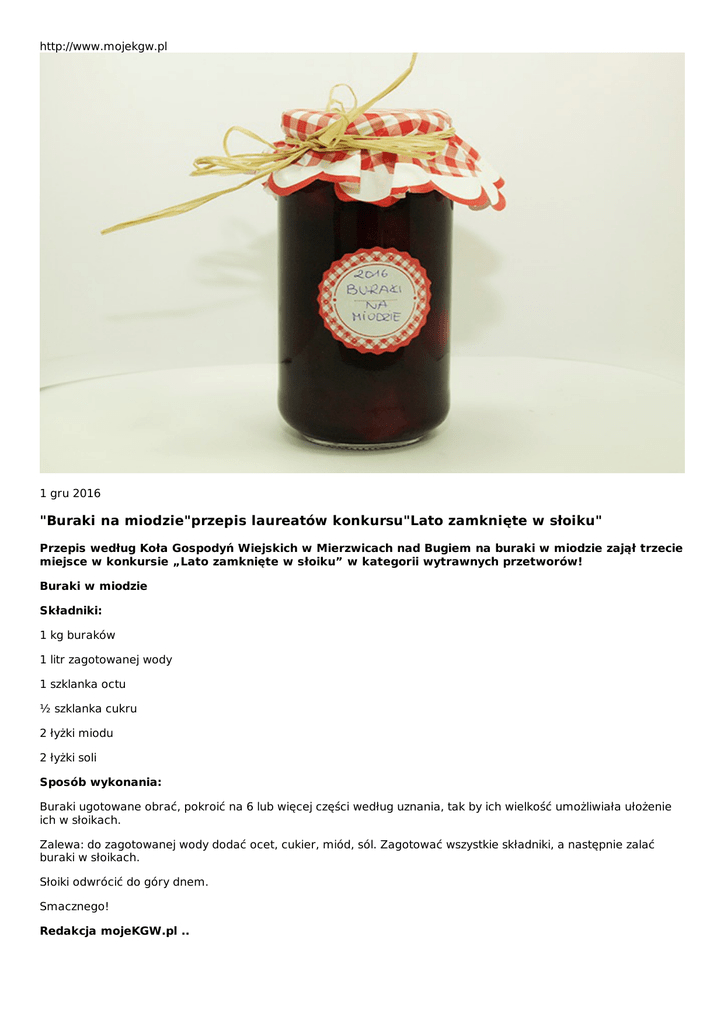 http://www.mojekgw.pl 1 gru 2016 "Buraki na miodzie"przepis laureatów konkursu"Lato zamknięte w słoiku" Przepis według Koła Gospodyń Wiejskich w Mierzwicach nad Bugiem na buraki w miodzie zajął trzecie miejsce w konkursie „Lato zamknięte w słoiku” w kategorii wytrawnych przetworów! Buraki w miodzie Składniki: 1 kg buraków 1 litr zagotowanej wody 1 szklanka octu ½ szklanka cukru 2 łyżki miodu 2 łyżki soli Sposób wykonania: Buraki ugotowane obrać, pokroić na 6 lub więcej części według uznania, tak by ich wielkość umożliwiała ułożenie ich w słoikach. Zalewa: do zagotowanej wody dodać ocet, cukier, miód, sól. Zagotować wszystkie składniki, a następnie zalać buraki w słoikach. Słoiki odwrócić do góry dnem. Smacznego! Redakcja mojeKGW.pl ..