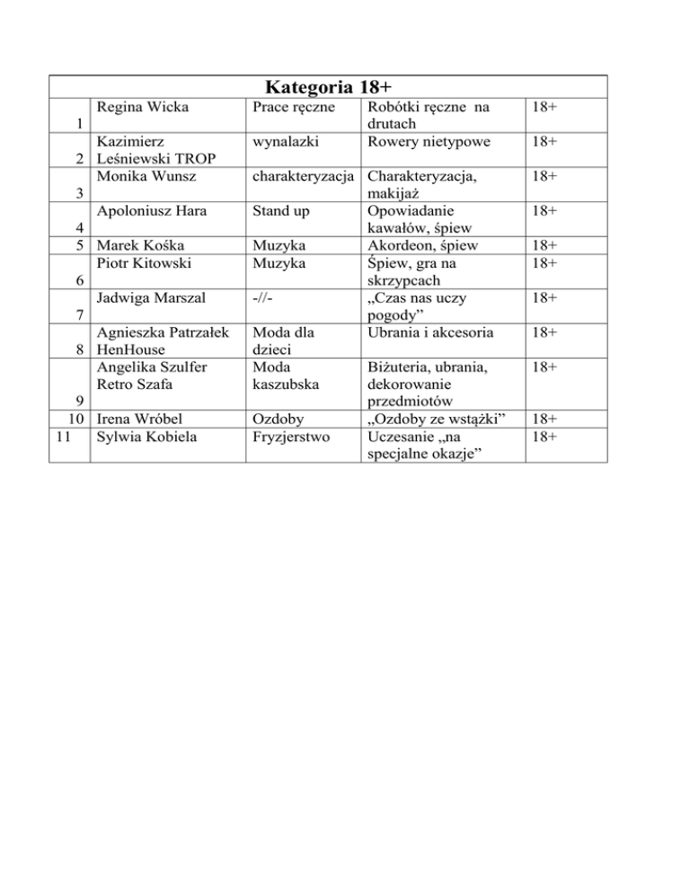 Kategoria 18+ Regina Wicka Prace ręczne 1 Kazimierz 2 Leśniewski TROP Monika Wunsz 3 Apoloniusz Hara 4 5 Marek Kośka Piotr Kitowski 6 Jadwiga Marszal 7 Agnieszka Patrzałek 8 HenHouse Angelika Szulfer Retro Szafa 9 10 Irena Wróbel 11 Sylwia Kobiela wynalazki Robótki ręczne na drutach Rowery nietypowe charakteryzacja Charakteryzacja, makijaż Stand up Opowiadanie kawałów, śpiew Muzyka Akordeon, śpiew Muzyka Śpiew, gra na skrzypcach -//„Czas nas uczy pogody” Moda dla Ubrania i akcesoria dzieci Moda Biżuteria, ubrania, kaszubska dekorowanie przedmiotów Ozdoby „Ozdoby ze wstążki” Fryzjerstwo Uczesanie „na specjalne okazje” 18+ 18+ 18+ 18+ 18+ 18+ 18+ 18+ 18+ 18+ 18+