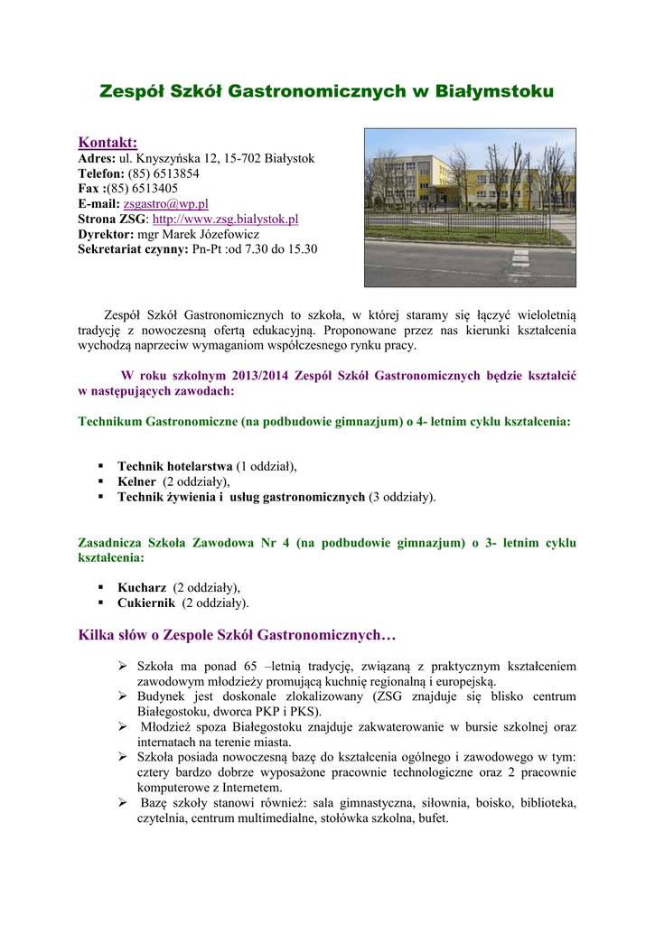 Zespół Szkół Gastronomicznych w Białymstoku Kontakt: Adres: ul. Knyszyńska 12, 15-702 Białystok Telefon: (85) 6513854 Fax :(85) 6513405 E-mail: [email protected] Strona ZSG: http://www.zsg.bialystok.pl Dyrektor: mgr Marek Józefowicz Sekretariat czynny: Pn-Pt :od 7.30 do 15.30 Zespół Szkół Gastronomicznych to szkoła, w której staramy się łączyć wieloletnią tradycję z nowoczesną ofertą edukacyjną. Proponowane przez nas kierunki kształcenia wychodzą naprzeciw wymaganiom współczesnego rynku pracy. W roku szkolnym 2013/2014 Zespół Szkół Gastronomicznych będzie kształcić w następujących zawodach: Technikum Gastronomiczne (na podbudowie gimnazjum) o 4- letnim cyklu kształcenia: Technik hotelarstwa (1 oddział), Kelner (2 oddziały), Technik żywienia i usług gastronomicznych (3 oddziały). Zasadnicza Szkoła Zawodowa Nr 4 (na podbudowie gimnazjum) o 3- letnim cyklu kształcenia: Kucharz (2 oddziały), Cukiernik (2 oddziały). Kilka słów o Zespole Szkół Gastronomicznych… Szkoła ma ponad 65 –letnią tradycję, związaną z praktycznym kształceniem zawodowym młodzieży promującą kuchnię regionalną i europejską. Budynek jest doskonale zlokalizowany (ZSG znajduje się blisko centrum Białegostoku, dworca PKP i PKS). Młodzież spoza Białegostoku znajduje zakwaterowanie w bursie szkolnej oraz internatach na terenie miasta. Szkoła posiada nowoczesną bazę do kształcenia ogólnego i zawodowego w tym: cztery bardzo dobrze wyposażone pracownie technologiczne oraz 2 pracownie komputerowe z Internetem. Bazę szkoły stanowi również: sala gimnastyczna, siłownia, boisko, biblioteka, czytelnia, centrum multimedialne, stołówka szkolna, bufet. Zajęcia prowadzi doświadczona i życzliwa kadra nauczycielska, rzetelnie przygotowująca do egzaminów maturalnych oraz potwierdzających kwalifikacje zawodowe, dbająca również o dobro i bezpieczeństwo uczniów (Honorowy Certyfikat Bezpieczeństwa- ,,Szkoła Bezpieczna i Przyjazna Uczniom’’). Uczniowie mogą korzystać z profesjonalnej pomocy pedagoga i psychologa szkolnego, którzy prowadzą program profilaktyki zachowań problemowych. Młodzież ma możliwość doskonalenia swoich umiejętności i podnoszenia kwalifikacji zawodowych poprzez korzystanie z projektów współfinansowanych przez Unię Europejską. Pozwalają one na uzupełnienie oferty edukacyjnej o dodatkowe zajęcia wyrównawcze, kursy gastronomiczne, pokazy prowadzone przez sławnych mistrzów kulinarnych, wycieczki zawodowe oraz doradztwo zawodowe. Od kilku lat szkoła organizuje praktyki zagraniczne dla uczniów i absolwentów min. we Francji, Hiszpanii, w Niemczech i Włoszech. Nasi uczniowie odnoszą liczne sukcesy w turniejach zawodowych i olimpiadach na szczeblu ogólnopolskim i wojewódzkim. Zdobywają również czołowe miejsca na szczeblu międzynarodowym, ogólnopolskim i wojewódzkim w różnych zawodach sportowych. Młodzież ma szansę rozwijać swoje zainteresowania w wielu kołach przedmiotowych, artystycznych i sportowych. Nasza szkoła daje możliwości.... Nasi absolwenci są cenionymi i poszukiwanymi pracownikami: szefami kuchni, kucharzami, kelnerami, hotelarzami i cukiernikami w renomowanych hotelach i restauracjach na terenie kraju i za granicą. Praktyki zawodowe: w Centrum Kształcenia Praktycznego Nr 3 ZSG oraz w licznych hotelach i zakładach gastronomicznych na terenie miasta, kraju oraz krajach Unii Europejskiej.