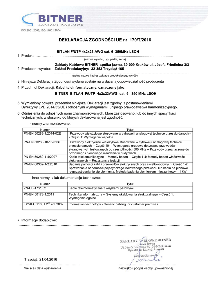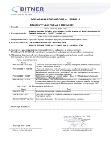 DEKLARACJA ZGODNOŚCI UE nr 170/T/2016 BiTLAN F/UTP 4x2x23 AWG cat. 6 350MHz LSOH 1. Produkt: ………….............................................................................................................................. (nazwa wyrobu, typ, partia, seria) Zakłady Kablowe BITNER spółka jawna, 30-009 Kraków ul. Józefa Friedleina 3/3 Zakład Produkcyjny: 32-353 Trzyciąż 165 2. Producent wyrobu: ............................................................................................................................................................................ (pełna nazwa i adres zakładu produkującego wyrób) 3. Niniejsza Deklaracja Zgodności wydana zostaje na wyłączną odpowiedzialność producenta 4. Przedmiot Deklaracji: Kabel teleinformatyczny, oznaczony jako: BITNER BiTLAN F/UTP 4x2x23AWG cat. 6 350 MHz LSOH 5. Wymieniony powyżej przedmiot niniejszej Deklaracji jest zgodny z postanowieniami Dyrektywy LVD 2014/35/UE i odnośnymi wymaganiami unijnego prawodawstwa harmonizacyjnego. 6. Odniesienia do odnośnych norm zharmonizowanych, które zastosowano, lub do innych specyfikacji technicznych, w stosunku do których deklarowana jest zgodność: - normy zharmonizowane: Numer PN-EN 50288-1:2014-02E Tytuł Przewody wielożyłowe stosowane w cyfrowej i analogowej technice przesyłu danych - Część 1: Wymagania wspólne PN-EN 50288-10-1:2013E Przewody elektryczne wielożyłowe stosowane w cyfrowej i analogowej technice przesyłu danych -- Część 10-1: Wymagania grupowe dotyczące przewodów ekranowanych testowanych do częstotliwości 500 MHz -- Przewody przeznaczone do poziomego i pionowego układania w budynkach Kable telekomunikacyjne -- Metody badań -- Część 1-4: Metody badań właściwości elektrycznych -- Rezystancja izolacji Badania palności kabli i przewodów elektrycznych oraz światłowodowych. Część 1-2: Sprawdzanie odporności pojedynczego izolowanego przewodu lub kabla na pionowe rozprzestrzenianie się płomienia. Metoda badania płomieniem mieszankowym 1 kW PN-EN 50289-1-4:2007 PN-EN 60332-1-2:2010 - inne normy i / lub dokumentacje techniczne: Numer ZN-CB-17:2002 Tytuł Kable teleinformatyczne z wiązkami parowymi PN-EN 50173-1:2011 Technika informatyczna -- Systemy okablowania strukturalnego – Część 1: Wymagania ogólne ISO/IEC 11801 2 nd ed.:2002 Information technology - Generic cabling for customer premises 7. Informacje dodatkowe: ................................................................................................................................................................. Trzyciąż 21.04.2016 ..................................................... Miejsce i data wystawienia .................................................. nazwisko i podpis osoby upoważnionej