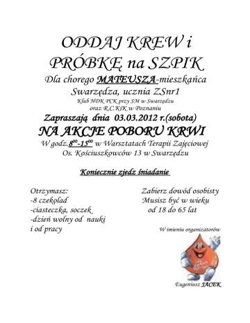 ODDAJ KREW i PRÓBKĘ na SZPIK Dla chorego MATEUSZA-mieszkańca Swarzędza, ucznia ZSnr1 Klub HDK PCK przy SM w Swarzędzu oraz R.C.KiK w Poznaniu Zapraszają dnia 03.03.2012 r.(sobota) NA AKCJE POBORU KRWI W godz.800-1500 w Warsztatach Terapii Zajęciowej Os. Kościuszkowców 13 w Swarzędzu Koniecznie zjedz śniadanie Otrzymasz: -8 czekolad -ciasteczka, soczek -dzień wolny od nauki i od pracy Zabierz dowód osobisty Musisz być w wieku od 18 do 65 lat W imieniu organizatorów Eugeniusz JACEK