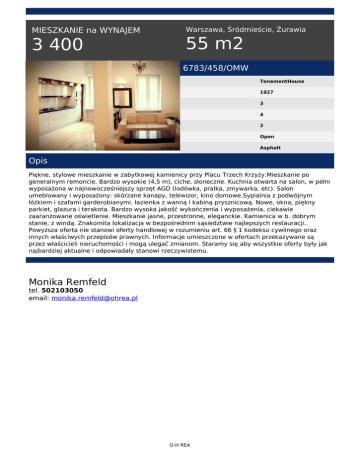 MIESZKANIE na WYNAJEM 3 400 Warszawa, Śródmieście, Żurawia 55 m2 6783/458/OMW TenementHouse 1927 3 4 2 Open Asphalt Opis Piękne, stylowe mieszkanie w zabytkowej kamienicy przy Placu Trzech Krzyży.Mieszkanie po generalnym remoncie. Bardzo wysokie (4,5 m), ciche, słoneczne. Kuchnia otwarta na salon, w pełni wyposażona w najnowocześniejszy sprzęt AGD (lodówka, pralka, zmywarka, etc). Salon umeblowany i wyposażony: skórzane kanapy, telewizor, kino domowe.Sypialnia z podwójnym łóżkiem i szafami garderobianymi. łazienka z wanną i kabiną prysznicową. Nowe, okna, piękny parkiet, glazura i terakota. Bardzo wysoka jakość wykończenia i wyposażenia, ciekawie zaaranżowane oświetlenie. Mieszkanie jasne, przestronne, eleganckie. Kamienica w b. dobrym stanie, z windą. Znakomita lokalizacja w bezpośrednim sąsiedztwie najlepszych restauracji.. Powyższa oferta nie stanowi oferty handlowej w rozumieniu art. 66 § 1 kodeksu cywilnego oraz innych właściwych przepisów prawnych. Informacje umieszczone w ofertach przekazywane są przez właścicieli nieruchomości i mogą ulegać zmianom. Staramy się aby wszystkie oferty były jak najbardziej aktualne i odpowiadały stanowi rzeczywistemu. Monika Remfeld tel. 502103050 email: [email protected] O-H REA Powered by TCPDF (www.tcpdf.org)