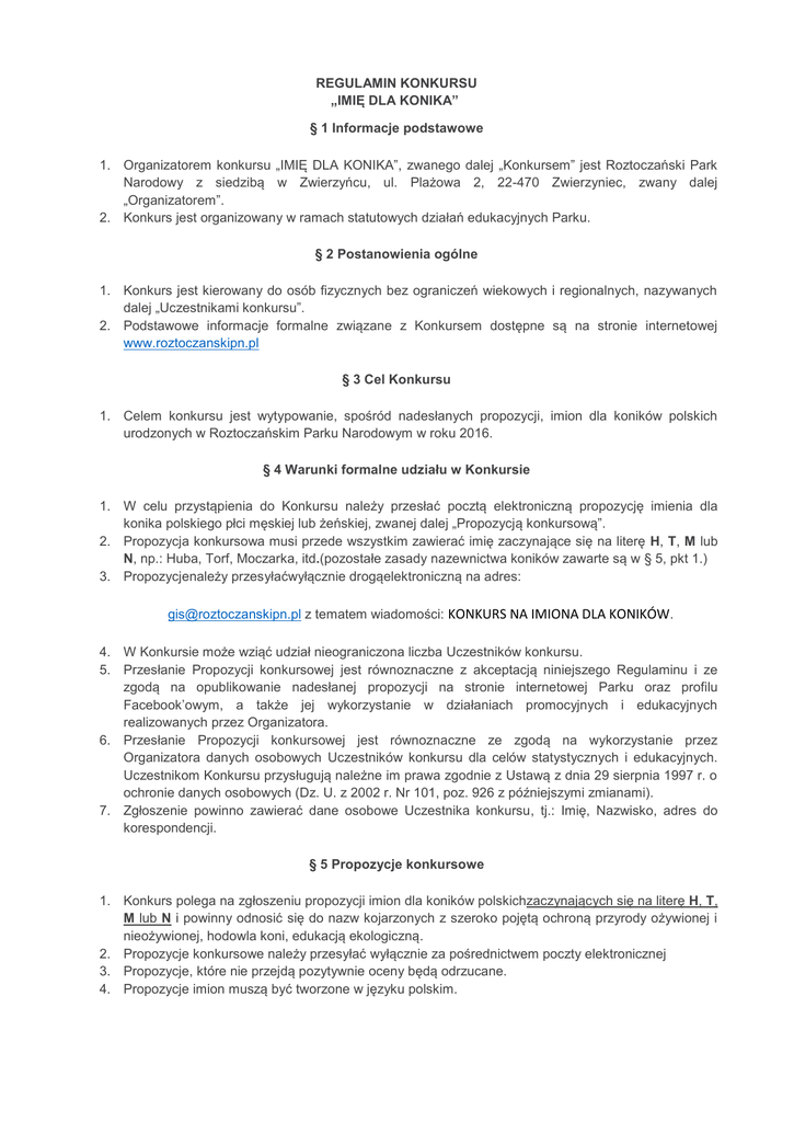 REGULAMIN KONKURSU „IMIĘ DLA KONIKA” § 1 Informacje podstawowe 1. Organizatorem konkursu „IMIĘ DLA KONIKA”, zwanego dalej „Konkursem” jest Roztoczański Park Narodowy z siedzibą w Zwierzyńcu, ul. Plażowa 2, 22-470 Zwierzyniec, zwany dalej „Organizatorem”. 2. Konkurs jest organizowany w ramach statutowych działań edukacyjnych Parku. § 2 Postanowienia ogólne 1. Konkurs jest kierowany do osób fizycznych bez ograniczeń wiekowych i regionalnych, nazywanych dalej „Uczestnikami konkursu”. 2. Podstawowe informacje formalne związane z Konkursem dostępne są na stronie internetowej www.roztoczanskipn.pl § 3 Cel Konkursu 1. Celem konkursu jest wytypowanie, spośród nadesłanych propozycji, imion dla koników polskich urodzonych w Roztoczańskim Parku Narodowym w roku 2016. § 4 Warunki formalne udziału w Konkursie 1. W celu przystąpienia do Konkursu należy przesłać pocztą elektroniczną propozycję imienia dla konika polskiego płci męskiej lub żeńskiej, zwanej dalej „Propozycją konkursową”. 2. Propozycja konkursowa musi przede wszystkim zawierać imię zaczynające się na literę H, T, M lub N, np.: Huba, Torf, Moczarka, itd.(pozostałe zasady nazewnictwa koników zawarte są w § 5, pkt 1.) 3. Propozycjenależy przesyłaćwyłącznie drogąelektroniczną na adres: [email protected] z tematem wiadomości: KONKURS NA IMIONA DLA KONIKÓW. 4. W Konkursie może wziąć udział nieograniczona liczba Uczestników konkursu. 5. Przesłanie Propozycji konkursowej jest równoznaczne z akceptacją niniejszego Regulaminu i ze zgodą na opublikowanie nadesłanej propozycji na stronie internetowej Parku oraz profilu Facebook’owym, a także jej wykorzystanie w działaniach promocyjnych i edukacyjnych realizowanych przez Organizatora. 6. Przesłanie Propozycji konkursowej jest równoznaczne ze zgodą na wykorzystanie przez Organizatora danych osobowych Uczestników konkursu dla celów statystycznych i edukacyjnych. Uczestnikom Konkursu przysługują należne im prawa zgodnie z Ustawą z dnia 29 sierpnia 1997 r. o ochronie danych osobowych (Dz. U. z 2002 r. Nr 101, poz. 926 z późniejszymi zmianami). 7. Zgłoszenie powinno zawierać dane osobowe Uczestnika konkursu, tj.: Imię, Nazwisko, adres do korespondencji. § 5 Propozycje konkursowe 1. Konkurs polega na zgłoszeniu propozycji imion dla koników polskichzaczynających się na literę H, T, M lub N i powinny odnosić się do nazw kojarzonych z szeroko pojętą ochroną przyrody ożywionej i nieożywionej, hodowla koni, edukacją ekologiczną. 2. Propozycje konkursowe należy przesyłać wyłącznie za pośrednictwem poczty elektronicznej 3. Propozycje, które nie przejdą pozytywnie oceny będą odrzucane. 4. Propozycje imion muszą być tworzone w języku polskim. 5. Warunkiem przyjęcia propozycji jest przesłanie, w wiadomości mailowej z Propozycją konkursową, oświadczenia Uczestnika konkursu, a w przypadku osób nieletnich rodzica/opiekuna prawnego wyrażającego zgodę na przetwarzanie danych osobowych w związku z udziałem w Konkursie. § 6 Harmonogram Konkursu i postanowienia organizacyjne 1. Ogłoszenie o rozpoczęciu Konkursu oraz regulamin Konkursu zostaną zamieszczone na stronie internetowej www.roztoczanskipn.pl oraz na profilu RPN na Facebook’u. 2. Konkurs trwa od 25 marca 2016 r. do 30kwietnia 2016 r. 3. Ostateczną decyzję o przyjęciu propozycji do Konkursu podejmuje Organizator. 4. Ogłoszenie wyników Konkursu nastąpi w dniu 06 maja 2016 r. przez wywieszenie listy na stronie internetowej www.roztoczanskipn.pl oraz na profilu RPN na Facebook’u. 5. Nagrody i wyróżnienia zostaną przesłane pocztą na adres wskazany przez Uczestnika konkursu w mailu z propozycją imienia dla konika. 6. Organizator zastrzega sobie prawo do zmian w przypadku gdy liczba zgłoszeń będzie niewystarczająca do przeprowadzenia konkursu. § 7 Ocena propozycji konkursowych 1. Nad przebiegiem Konkursu czuwa Komisja Konkursowa, zwana dalej „Komisją”, powołana przez Organizatora. 2. Komisja Konkursowa ocenia propozycje nadesłane w ramach Konkursu oraz przyznaje nagrody i wyróżnienia. Praca Komisji jest niezależna, a jej decyzje są ostateczne Komisja podejmuje decyzje zwykłą większością głosów. Każdy z członków Komisji dysponuje jednym głosem. 3. Do oceny przekazane zostaną Propozycje konkursowe spełniające wszystkie warunki udziału w Konkursie wymienione w niniejszym regulaminie. Oceny tej dokonuje Organizator. 4. Prace Komisji dokumentuje protokół przygotowany po dokonaniu oceny propozycji konkursowych. Protokół zawiera również informację o przyznaniu nagród regulaminowych. Protokół w całości zostaje następnie przedłożony Organizatorowi. § 8 Nagrody 1. Komisja nagrodzi Propozycje konkursowe wybrane w Konkursie. 2. Nagrodami w Konkursie są: zestawy wydawnictw książkowych, mapowych, kubki, koszulki, gadżety będące w posiadaniu Organizatora. 3. Liczba i rodzaj nagród może – w wyjątkowych przypadkach – ulec zmianie (zwiększeniu) w wyniku decyzji Komisji Konkursowej. Organizator zobowiązuje się przekazać taką decyzję w najkrótszym możliwym terminie od jej podjęcia. § 9 Postanowienia końcowe 1. Organizator zastrzega sobie prawo do wprowadzania zmian w regulaminie Konkursu w uzasadnionych przypadkach w trakcie jego trwania. 2. Wszelkie zmiany wprowadzone do regulaminu stają się obowiązujące w momencie ich opublikowania na stronie internetowej Organizatora. 3. Organizator zastrzega sobie prawo wykluczenia z udziału w Konkursie uczestnika działającego sprzecznie z niniejszym regulaminem, w tym nie przyznania mu nagrody. 4. Organizator zastrzega sobie prawo anulowania w całości lub w części decyzji Komisji Konkursowej w przypadku stwierdzenia rażących nieprawidłowości w pracy Komisji lub jej członków, w tym zmianę oceny prac konkursowych.