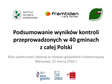 Podsumowanie wyników kontroli przeprowadzonych w 40 gminach z całej Polski Rola społeczności lokalnej w rozwoju gospodarki niskoemisyjnej Warszawa, 22 marca 2016 r. UDZIAŁ SPOŁECZEŃSTWA W TWORZENIU PGN INFORMOWANIE I ANGAŻOWANIE Agata Golec, Fundacja Instytut na rzecz Ekorozwoju Wspólne TWORZENIE dokumentu INFORMACJA Wspólne TWORZENIE dokumentu INFORMACJA ZROZUMIENIE Wspólne TWORZENIE dokumentu INFORMACJA ZROZUMIENIE Wspólne TWORZENIE dokumentu POMYSŁY INFORMACJA ZROZUMIENIE Wspólne TWORZENIE dokumentu POMYSŁY DYSKUSJA INFORMOWANIE www 35 gmin INFORMOWANIE www 35 gmin media lokalne połowa gmin INFORMOWANIE www 35 gmin media lokalne połowa gmin INFORMOWANIE ulotki – 16 gmin www 35 gmin media lokalne połowa gmin INFORMOWANIE ulotki – 16 gmin spotkania informacyjne – 10 gmin ANGAŻOWANIE • ankiety dla mieszkańców 28 gmin ANGAŻOWANIE • ankiety dla mieszkańców 28 gmin • pytania dotyczące planowanych inwestycji – 19 gmin Rekomendacje metoda narady obywatelskiej UDZIAŁ SPOŁECZEŃSTWA W TWORZENIU PGN KONSULTACJE SPOŁECZNE PROJEKTU PGN dr Marta Maja Wiśniewska, Fundacja Greenmind Uspołecznianie opracowania PGN • w 35% gmin projekty planów nie były konsultowane społecznie, nie zapewniono możliwości składania uwag i wniosków; • w wielu gminach (>60%) podjęto decyzję o odstąpieniu od przeprowadzeniu strategicznej oceny oddziaływania na środowisko PGN. Konsultacje społeczne PGN i ich Prognoz oddziaływania na środowisko konsultacje społeczne (ogółem) Liczba gmin prowadzących konsultacje społeczne w związku z pracami nad PGN w tym: PGN wraz z Prognozą w tym: sama Prognoza 0 10 20 30 40 Przejrzystość procesu konsultacji Raport z konsultacji społecznych PGN opracowało 8 kontrolowanych gmin, które zdecydowały się przeprowadzić konsultacje społeczne i połowa z tych, które konsultacje prowadziły w ramach oceny strategicznej. Angażowanie w proces konsultacji Tylko 20% gmin, które przeprowadziły konsultacje projektów PGN wyszło poza standardowe minimum, tj. poza ogłoszenie ich rozpoczęcia w Biuletynie Informacji Publicznej lub na stronie internetowej urzędu. Sposoby informowania o konsultacjach PGN informacja na stronie urzędu lub w BIP liczba gmin stosujących określony sposób informowania o konsultacjach dodatkowe informowanie (media, ulotki, plakaty) spotkania informacyjnokonsultacyjne 0 10 20 30 40 Utrudnienia dla uczestników procesu Wersji elektronicznej konsultowanego dokumentu nie udostępniło blisko 30% gmin prowadzących konsultacje. Rekomendacje (1) Na etapie aktualizacji planów gospodarki niskoemisyjnej należy przeprowadzić: • konsultacje społeczne projektu zaktualizowanych planów; • strategiczne oceny oddziaływania na środowisko realizowania tych planów. Rekomendacje (2) W procesie aktualizacji PGN i konsultacji z tym związanych należy wykorzystać wszystkie dostępne sposoby informowania, komunikowania się, wymiany informacji (także te niestandardowe, tj. spotkania, warsztaty, debaty, wyjazdy studyjne). Rekomendacje (3) • wszelkie informacje związane z tworzeniem PGN powinny być dostępne co najmniej na stronie lub BIP urzędu gminy, w jednym miejscu dedykowanym PGN • konsultacjom społecznym aktualizacji PGN musi towarzyszyć informacja zwrotna do ich uczestników POZIOM ZAANGAŻOWANIA URZĘDU GMINY W PROCES OPRACOWANIA PGN Adriana Skajewska, Stowarzyszenie LGD Zielone Sąsiedztwo Wyznaczniki zaangażowania gminy 1. Decyzja o przygotowaniu PGN podjęta w sposób partycypacyjny, po wcześniejszej konsultacji. 2. Opracowanie PGN przez pracowników gminy lub przy niewielkim wsparciu konsultantów zewnętrznych. 3. Dyskusja nad treścią opracowanego PGN na komisjach lub sesji Rady Gminy. Podejmowanie decyzji Najczęściej organ wykonawczy decyzję o przygotowaniu PGN podejmował bez konsultacji, samodzielnie, kierując się interesem gminy w sensie ogólnym oraz możliwością ubiegania się o środki unijne w ramach programów operacyjnych na lata 2014-2020. Przyjęty sposób pracy nad treścią PGN 1. Wszystkie przebadane gminy (40) zleciły opracowanie PGN specjalistycznym podmiotom zewnętrznym. 2. Formy oraz poziom współpracy z wykonawcami Planu: - bieżące konsultacje w urzędzie, spotkania z mieszkańcami, prezentacje, - zespoły robocze do opracowania PGN, - szkolenia dla pracowników gminy zaangażowanych w późniejsze wdrażanie planów. Udział przedstawicieli Rady Gminy Gotowy projekt PGN w zdecydowanej większości gmin zaprezentowano w trakcie posiedzenia komisji rady gminy lub bezpośrednio na sesji rady gminy. Rekomendacje 1. Decyzja o rozpoczęciu pracy nad PGN podjęta ze świadomością celu oraz korzyści, w sposób partycypacyjny. 2. Praca prowadzona w zespołach roboczych. 3. Konsultacje treści PGN w Radzie Gminy przed jego formalnym przyjęciem. 4. Zaplanowanie kampanii edukacyjnej informującej o korzyściach z posiadania i wdrażania Planu. UDZIAŁ SPOŁECZEŃSTWA W OPRACOWANIU, WDRAŻANIU I MONITORINGU REALIZACJI PGN OPRACOWANIE I WDRAŻANIE Agata Golec, Fundacja Instytut na rzecz Ekorozwoju Wspólne WDRAŻANIE dokumentu UZNANIE ROLI W TWORZENIU Wspólne WDRAŻANIE dokumentu UZNANIE ROLI W TWORZENIU ROLA W STRUKTURACH Wspólne WDRAŻANIE dokumentu UZNANIE ROLI W TWORZENIU ROLA W STRUKTURACH Wspólne WDRAŻANIE dokumentu REALIZACJA DZIAŁAŃ UZNANIE ROLI W TWORZENIU ROLA W STRUKTURACH Wspólne WDRAŻANIE dokumentu REALIZACJA DZIAŁAŃ EDUKACJA MIESZKAŃCY W PGN 13 gmin MIESZKAŃCY W PGN 13 gmin MIESZKAŃCY W PGN 33 gminy 13 gmin 4 gminy MIESZKAŃCY W PGN 33 gminy 13 gmin 4 gminy MIESZKAŃCY W PGN 33 gminy 40 gmin Rekomendacje włączanie mieszkańców w realizację działań UDZIAŁ SPOŁECZEŃSTWA W OPRACOWANIU, WDRAŻANIU I MONITORINGU REALIZACJI PGN MONITORING I EWALUACJA dr Marta Maja Wiśniewska, Fundacja Greenmind Monitoring w dokumencie PGN Części poświęcone ocenie wdrażania PGN mają najczęściej charakter luźnych propozycji raczej niż ins
