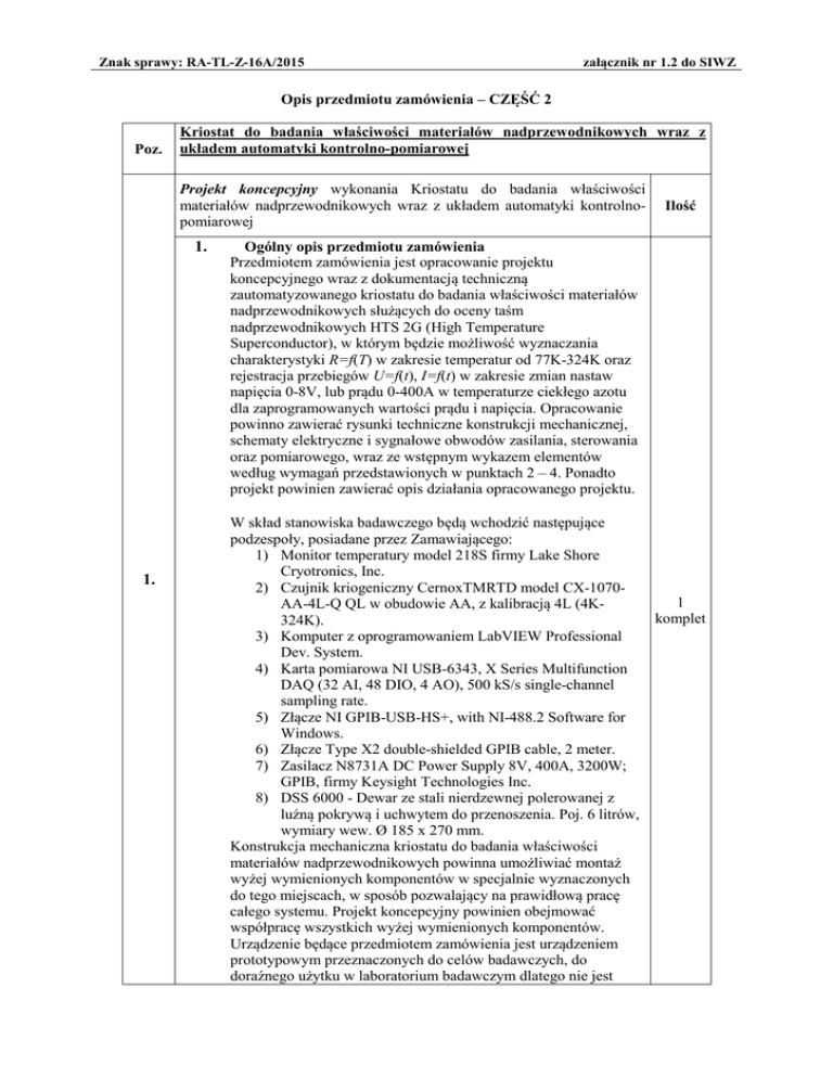 Znak sprawy: RA-TL-Z-16A/2015 załącznik nr 1.2 do SIWZ Opis przedmiotu zamówienia – CZĘŚĆ 2 Poz. Kriostat do badania właściwości materiałów nadprzewodnikowych wraz z układem automatyki kontrolno-pomiarowej Projekt koncepcyjny wykonania Kriostatu do badania właściwości materiałów nadprzewodnikowych wraz z układem automatyki kontrolnopomiarowej 1. 1. Ilość Ogólny opis przedmiotu zamówienia Przedmiotem zamówienia jest opracowanie projektu koncepcyjnego wraz z dokumentacją techniczną zautomatyzowanego kriostatu do badania właściwości materiałów nadprzewodnikowych służących do oceny taśm nadprzewodnikowych HTS 2G (High Temperature Superconductor), w którym będzie możliwość wyznaczania charakterystyki R=f(T) w zakresie temperatur od 77K-324K oraz rejestracja przebiegów U=f(t), I=f(t) w zakresie zmian nastaw napięcia 0-8V, lub prądu 0-400A w temperaturze ciekłego azotu dla zaprogramowanych wartości prądu i napięcia. Opracowanie powinno zawierać rysunki techniczne konstrukcji mechanicznej, schematy elektryczne i sygnałowe obwodów zasilania, sterowania oraz pomiarowego, wraz ze wstępnym wykazem elementów według wymagań przedstawionych w punktach 2 – 4. Ponadto projekt powinien zawierać opis działania opracowanego projektu. W skład stanowiska badawczego będą wchodzić następujące podzespoły, posiadane przez Zamawiającego: 1) Monitor temperatury model 218S firmy Lake Shore Cryotronics, Inc. 2) Czujnik kriogeniczny CernoxTMRTD model CX-1070AA-4L-Q QL w obudowie AA, z kalibracją 4L (4K324K). 3) Komputer z oprogramowaniem LabVIEW Professional Dev. System. 4) Karta pomiarowa NI USB-6343, X Series Multifunction DAQ (32 AI, 48 DIO, 4 AO), 500 kS/s single-channel sampling rate. 5) Złącze NI GPIB-USB-HS+, with NI-488.2 Software for Windows. 6) Złącze Type X2 double-shielded GPIB cable, 2 meter. 7) Zasilacz N8731A DC Power Supply 8V, 400A, 3200W; GPIB, firmy Keysight Technologies Inc. 8) DSS 6000 - Dewar ze stali nierdzewnej polerowanej z luźną pokrywą i uchwytem do przenoszenia. Poj. 6 litrów, wymiary wew. Ø 185 x 270 mm. Konstrukcja mechaniczna kriostatu do badania właściwości materiałów nadprzewodnikowych powinna umożliwiać montaż wyżej wymienionych komponentów w specjalnie wyznaczonych do tego miejscach, w sposób pozwalający na prawidłową pracę całego systemu. Projekt koncepcyjny powinien obejmować współpracę wszystkich wyżej wymienionych komponentów. Urządzenie będące przedmiotem zamówienia jest urządzeniem prototypowym przeznaczonych do celów badawczych, do doraźnego użytku w laboratorium badawczym dlatego nie jest 1 komplet Znak sprawy: RA-TL-Z-16A/2015 załącznik nr 1.2 do SIWZ wymagane oznakowanie CE (deklarację zgodności CE) dla sprzętu zgodnego z wymogami określonymi w ustawie z dnia 30 sierpnia 2002 roku o systemie oceny zgodności (Dz. U. z 2002 r., nr 166, poz. 1360 z p. zm.). 2. Wymagania dotyczące konstrukcji mechanicznej 1) Ze względu na wykorzystanie w stanowisku badawczym substancji (ciekły azot) zagrażających życiu bądź zdrowiu obsługi i osób postronnych oraz sprzętu sterującopomiarowego należy spełnić wymienione poniżej wytyczne dotyczące konstrukcji mechanicznej. Ponadto, ze względu na pracę przy niskich temperaturach, konstrukcja kriostatu powinna spełniać rygorystyczne wymogi, również szczegółowo omówione w punkcie 2. 2) Stanowisko badawcze powinno składać się z konstrukcji wsporczej zbudowanej z profili konstrukcyjnych skręcanych (nie spawanych), tolerancje profili DIN EN 12020. Profile konstrukcyjne muszą być wykonane z materiału stop 6063 gatunek T66 wyżarzanych cieplnie (F25) o powierzchni matowanej i anodowanej naturalnie o grubości warstwy 12 µm, która będzie minimalizowała efekty korozji w niekorzystnych warunkach jej pracy. Konstrukcja mechaniczna powinna być zamontowana na nóżkach do bezstopniowego ustawienia wysokości oraz ruchomo ułożyskowaną podstawą stopki, aby nierówności powierzchni mogły być wyrównywane, tak by umożliwić stabilne usadowienie kriostatu oraz jego wypoziomowanie. 3) Konstrukcja mechaniczna kriostatu powinna mieć wydzieloną część na aparaturę automatyki kontrolno-pomiarowej, tak by opary ciekłego azotu nie powodowały niewłaściwej pracy bądź uszkodzenia tej aparatury. Obydwie te części powinny być oddzielone płytą aluminiową malowaną proszkowo. Do zbiornika kriostatu właściwego powinien być zapewniony dostęp w takim zakresie by możliwe było swobodne nalewanie ciekłego azotu. Zbiornik kriostatu będzie stanowić dewar DSS 6000 o pojemność minimum 6 litrów, średnicy wewnętrznej minimum 185 mm oraz wysokości wewnętrznej minimum 270 mm. 4) Do wszystkich urządzeń kontrolno-pomiarowych oraz rozdzielnicy zasilającej stanowisko badawcze powinien być swobodny dostęp, umożliwiający ręczną ingerencję operatora, bez konieczności przesuwania stanowiska bądź odkręcania osłon ochronnych. Wszystkie przewody zasilające oraz kontrolno-pomiarowe powinny być prowadzone w specjalnych kanałach sygnałowych, uniemożliwiających mechaniczne ich uszkodzenie. 5) Część konstrukcji mechanicznej, zawierająca badane próbki taśm HTS oraz czujnik kriogeniczny powinna być opuszczana/podnoszona do/z zbiornika kriostatu automatyczne, za pomocą napędu elektrycznego sterowanego z kontrolera ruchu wyposażonego w wejścia wyłączników krańcowych oraz wejścia sterujące. Całość części pomiarowej powinna być zamontowana na prowadnicy liniowej modułu liniowego umożliwiającego pozycjonowanie z dokładnością co Znak sprawy: RA-TL-Z-16A/2015 załącznik nr 1.2 do SIWZ najmniej 0,1 mm wyposażonego w czujniki krańcowe. Część ruchoma systemu powinna być tak zamontowana, aby opary ciekłego azotu i zamarzająca para wodna, nie powodowały jej błędnego działania. Wszystkie przewody pomiarowe oraz przewody zasilające badaną próbkę, doprowadzone do części