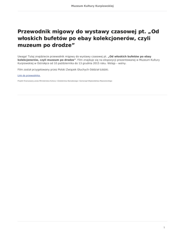 Muzeum Kultury Kurpiowskiej Przewodnik migowy do wystawy czasowej pt. „Od włoskich bufetów po ebay kolekcjonerów, czyli muzeum po drodze” Uwaga! Tutaj znajdziecie przewodnik migowy do wystawy czasowej pt. „Od włoskich bufetów po ebay kolekcjonerów, czyli muzeum po drodze”. Film znajduje się na ekspozycji prezentowanej w Muzeum Kultury Kurpiowskiej w Ostrołęce od 10 października do 13 grudnia 2015 roku. Wstęp – wolny. Film został przygotowany przez Polski Związek Głuchych Oddział Łódzki. Link do przewodnika Projekt finansowany przez Ministerstwo Kultury i Dziedzictwa Narodowego i Samorząd Województwa Mazowieckiego 1