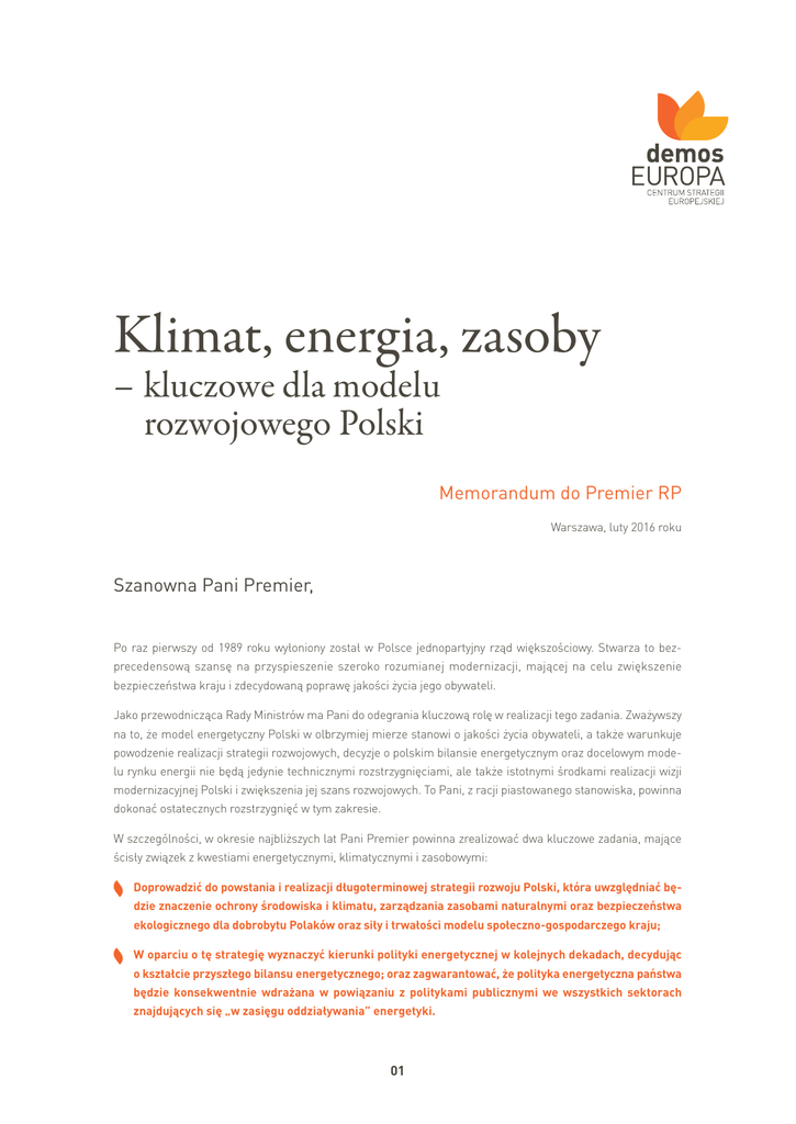 Klimat, energia, zasoby – kluczowe dla modelu rozwojowego Polski Memorandum do Premier RP Warszawa, luty 2016 roku Szanowna Pani Premier, Po raz pierwszy od 1989 roku wyłoniony został w Polsce jednopartyjny rząd większościowy. Stwarza to bezprecedensową szansę na przyspieszenie szeroko rozumianej modernizacji, mającej na celu zwiększenie bezpieczeństwa kraju i zdecydowaną poprawę jakości życia jego obywateli. Jako przewodnicząca Rady Ministrów ma Pani do odegrania kluczową rolę w realizacji tego zadania. Zważywszy na to, że model energetyczny Polski w olbrzymiej mierze stanowi o jakości życia obywateli, a także warunkuje powodzenie realizacji strategii rozwojowych, decyzje o polskim bilansie energetycznym oraz docelowym modelu rynku energii nie będą jedynie technicznymi rozstrzygnięciami, ale także istotnymi środkami realizacji wizji modernizacyjnej Polski i zwiększenia jej szans rozwojowych. To Pani, z racji piastowanego stanowiska, powinna dokonać ostatecznych rozstrzygnięć w tym zakresie. W szczególności, w okresie najbliższych lat Pani Premier powinna zrealizować dwa kluczowe zadania, mające ścisły związek z kwestiami energetycznymi, klimatycznymi i zasobowymi: Doprowadzić do powstania i realizacji długoterminowej strategii rozwoju Polski, która uwzględniać będzie znaczenie ochrony środowiska i klimatu, zarządzania zasobami naturalnymi oraz bezpieczeństwa ekologicznego dla dobrobytu Polaków oraz siły i trwałości modelu społeczno-gospodarczego kraju; W oparciu o tę strategię wyznaczyć kierunki polityki energetycznej w kolejnych dekadach, decydując o kształcie przyszłego bilansu energetycznego; oraz zagwarantować, że polityka energetyczna państwa będzie konsekwentnie wdrażana w powiązaniu z politykami publicznymi we wszystkich sektorach znajdujących się „w zasięgu oddziaływania” energetyki. 01 Kontekst Klimat, energia i zasoby w długoterminowej strategii rozwoju Polski Polska potrzebuje nowych impulsów rozwojowych, które wykraczałyby poza inwestycje infrastrukturalne i stabilizację makroekonomiczną, w szerszym zakresie uwzględniając „jakość” rozwoju kraju. Działając we współpracy z prezydentem i powołaną przez niego Narodową Radą Rozwoju (NRR), Pani Premier ma szansę doprowadzić do rzeczywistego uwzględnienia ochrony środowiska i klimatu, zarządzania zasobami naturalnymi oraz bezpieczeństwa ekologicznego w polityce rozwojowej państwa. Ochrona środowiska i zarządzanie zasobami naturalnymi są obecnie przykładem jednego z największych zapóźnień modernizacyjnych Polski. Podczas gdy od dekady nasz kraj konsekwentnie dogania unijną średnią pod względem poziomu dobrobytu, wyrażonego wysokością PKB na mieszkańca, w sektorze zarządzania zasobami naturalnymi podobny postęp (mierzony m.in. czystością powietrza, efektywnością zarządzania wodą czy odzyskiem odpadów) nie jest odnotowywany. Koordynując działania ministrów, a jednocześnie dysponując pozycją polityczną umożliwiającą podjęcie decyzji o nadaniu istotnego priorytetu kwestiom ochrony środowiska i klimatu, zarządzania zasobami naturalnymi oraz bezpieczeństwa ekologicznego, Pani Premier powinna być odpowiedzialna za uzgodnienie i wprowadzenie w życie długoterminowej koncepcji rozwoju państwa, gwarantującej rozwój Polski w przyszłości nie tylko w kategoriach ilościowych, ale też jakościowych. Długoterminowa polityka energetyczna Polski Strategia „Polityka energetyczna Polski” obejmuje okres do roku 2050 i jest spójna z horyzontem czasowym unijnych strategii klimatyczno-energetycznych. Jednym z jej celów jest zagwarantowanie inwestorom długofalowej stabilności regulacyjnej, niezbędnej do podejmowania decyzji inwestycyjnych. O ile przygotowanie i wdrażanie „Polityki energetycznej Polski” jest jednym z kluczowych zadań stojących przed ministrem energetyki, to Pani Premier – odpowiadając za całokształt polityki realizowanej przez rząd – powinna w oparciu o długoterminową strategię rozwoju Polski wyznaczyć kierunki polityki energetycznej poprzez podjęcie decyzji o kształcie przyszłego bilansu energetycznego. Decydując o wyborze energetycznego scenariusza dla Polski, Pani Premier powinna wziąć pod uwagę wszystkie kwestie znajdujące się w „zasięgu oddziaływania” energetyki, m.in. gospodarkę, finanse publiczne, politykę ochrony zdrowia, politykę zagraniczną, ochronę środowiska, planowanie przestrzenne, a także naukę i rozwój innowacji. Pani Premier powinna mieć także na względzie to, że właściwym celem polityki energetycznej jest tworzenie warunków dla stałego i zrównoważonego rozwoju kraju. 02 Rekomendacje Klimat, energia i zasoby w długoterminowej strategii rozwoju Polski Aby doprowadzić do powstania i realizacji długoterminowej strategii rozwoju Polski, która uwzględniałaby znaczenie bezpieczeństwa klimatycznego, energetycznego i zasobowego dla dobrobytu Polaków oraz siły i trwałości modelu społeczno-gospodarczego kraju, Pani Premier powinna: Włączyć Kancelarię Prezesa Rady Ministrów (KPRM) w prace nad długoterminową strategią rozwoju Polski prowadzone we współpracy z Narodową Radą Rozwoju przy prezydencie. Efektem tych prac powinna być „Strategia rozwoju Polski 2050”, uwzględniająca znaczenie i rolę ochrony środowiska i klimatu, zarządzania zasobami naturalnymi oraz bezpieczeństwa ekologicznego jako istotnych elementów modelu społeczno-gospodarczego rozwoju kraju. W sytuacji, gdyby Kancelaria Prezydenta nie podjęła prac nad tego rodzaju strategią, Pani Premier powinna sama zainicjować ten proces i doprowadzić do jego realizacji w ramach KPRM. Doprowadzić do tego, aby „Strategia rozwoju Polski 2050” wyznaczyła kierunki i kryteria dla przedkładanych przez rząd, parlament i prezydenta aktów legislacyjnych oraz realizowanych przez rząd polityk publicznych w zakresie ich zgodności z t