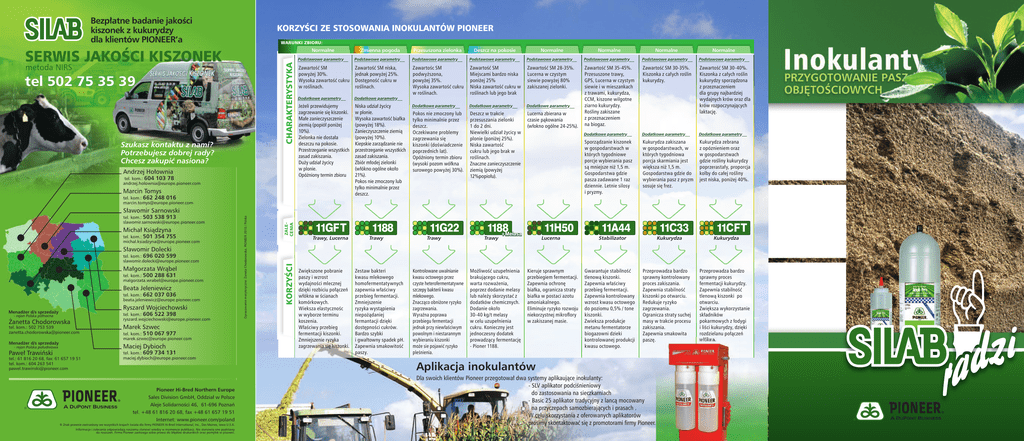 Bezpłatne badanie jakości kiszonek z kukurydzy dla klientów PIONEER’a KORZYŚCI ZE STOSOWANIA INOKULANTÓW PIONEER WARUNKI ZBIORU: SERWIS JAKOŚCI KISZONEK Normalne CHARAKTERYSTYKA metoda NIRS tel 502 75 35 39 Szukasz kontaktu z nami? Potrzebujesz dobrej rady? Chcesz zakupić nasiona? Andrzej Hołownia tel. kom.: 604 103 78 [email protected] Zmienna pogoda Przesuszona zielonka Deszcz na pokosie Normalne Normalne Normalne Normalne Podstawowe parametry Podstawowe parametry Podstawowe parametry Podstawowe parametry Podstawowe parametry Podstawowe parametry Podstawowe parametry Podstawowe parametry Zawartość SM powyżej 30%. Wysoka zawartość cukru w roślinach. Zawartość SM niska, jednak powyżej 25%. Dostępność cukru w roślinach. Jeżeli przewidujemy zagrzewanie się kiszonki. Małe zanieczyszczenie ziemią (popiół poniżej 10%). Zielonka nie dostała deszczu na pokosie. Przestrzeganie wszystkich zasad zakiszania. Duży udział życicy w plonie. Opóżniony termin zbioru Niska udział życicy w plonie. Wysoka zawartość białka (powyżej 18%). Zanieczyszczenie ziemią (powyżej 10%). Kiepskie zarządzanie nie przestrzeganie wszystkich zasad zakiszania. Zbiór młodej zielonki (włókno ogólne około 21%). Pokos nie zmoczony lub tylko minimalnie przez deszcz. Dodatkowe parametry Dodatkowe parametry Dodatkowe parametry Pokos nie zmoczony lub tylko minimalnie przez deszcz. Oczekiwane problemy zagrzewania się kiszonki (doświadczenie poprzednich lat). Opóźniony termin zbioru (wysoki pozom wółkna surowego powyżej 30%). Deszcz w trakcie przesuszania zielonki 1 do 2 dni. Niewielki udział życicy w plonie (poniżej 25%). Niska zawartość cukru lub jego brak w roślinach. Znaczne zanieczyszczenie ziemią (powyżej 12%popiołu). Lucerna zbierana w czasie pąkowania (włokno ogólne 24-25%). Zawartość SM 35-45%. Przesuszone trawy, GPS, Lucerna w czystym siewie i w mieszankach z trawami, kukurydza, CCM, kiszone wilgotne ziarno kukurydzy. Rośliny zakiszane z przeznaczeniem na biogaz. Zawartość SM 30-35%. Kiszonka z całych roślin kukurydzy. Dodatkowe parametry Zawartość SM Miejscami bardzo niska poniżej 25% Niska zawartość cukru w roślinach lub jego brak Zawartość SM 28-35%. Lucerna w czystym siewie powyżej 80% zakiszanej zielonki. Dodatkowe parametry Zawartośc SM podwyższona, powyżej 35%. Wysoka zawartość cukru w roślinach. Zawartość SM 30-40%. Kiszonka z całych roślin kukurydzy sporządzona z przeznaczeniem dla grupy najbardziej wydajnych krów oraz dla krów rozpoczynających laktację. Dodatkowe parametry Dodatkowe parametry Dodatkowe parametry Sporządzanie kiszonek w gospodarstwach w których tygodniowe porcje wybierania pasz są mniejsze niż 1,5 m. Gospodarstwa gdzie pasza zadawane 1 raz dziennie. Letnie silosy i pryzmy. Kukurydza zakiszana w gospodarstwach, w których tygodniowa porcja skarmiania jest większa niż 1,5 m. Gospodarstwa gdzie do wybierania pasz z pryzm sosuje się frez. Kukurydza zebrana z opóznieniem oraz w gospodarstwach gdzie rośliny kukurydzy poprzerastały, proporcja kolby do całej rośliny jest niska, poniżej 40%. Marcin Tomys tel. kom.: 662 248 016 [email protected] tel. kom.: 501 354 755 [email protected] Sławomir Dolecki tel. kom.: 696 020 599 [email protected] Małgorzata Wrąbel tel. kom.: 500 288 631 [email protected] Beata Jeleniewicz tel. kom.: 662 037 036 [email protected] Ryszard Wojciechowski Menadżer d/s sprzedaży tel. kom.: 606 522 398 [email protected] - rejon Polska północna Żanetta Chodorowska tel. kom.: 502 753 539 [email protected] Marek Szwec Menadżer d/s sprzedaży Maciej Dybioch - rejon Polska południowa Paweł Trawiński tel.: 61 816 20 68, fax: 61 657 19 51 tel. kom.: 604 263 541 [email protected] tel. kom.: 510 067 977 [email protected] tel. kom.: 609 734 131 [email protected] Pioneer Hi-Bred Northern Europe Sales Division GmbH, Oddział w Polsce Aleje Solidarności 46, 61-696 Poznań tel. +48 61 816 20 68, fax +48 61 657 19 51 Internet: www.pioneer.com/poland ® Znak prawnie zastrzeżony we wszystkich krajach świata dla firmy PIONEER Hi-Bred International, Inc., Des Moines, Iowa U.S.A. Informacje i zalecenia odpowiadają naszemu stanowi wiedzy w momencie publikacji. Nie stanowią one podstawy do roszczeń. Firma Pioneer zastrzega sobie prawo do błędów drukarskich oraz pomyłek w pisowni. ZALECENIA Michał Ksiądzyna KORZYŚCI tel. kom.: 503 538 913 [email protected] Opracowanie merytoryczne: Żaneta Chodorowska, PIONEER 2010 / Polska Sławomir Sarnowski 11GFT Trawy, Lucerna Zwiększone pobranie paszy i wzrost wydajności mlecznej dzięki rozbiciu połączeń włókna w ścianach komórkowych. Wieksza elastycznośc w wyborze terminu koszenia. Właściwy przebieg fermentacji kiszonki. Zmniejszenie ryzyka zagrzewania się kiszonki. 1188 Trawy Zestaw bakteri kwasu mlekowego homofermentatywnych zapewnia właściwy przebieg fermentacji. Zmniejszenie ryzyka wystąpienia niepożądaniej fermantacji dzięki dostępności cukrów. Bardzo szybki i gwałtowny spadek pH. Zapewnia smakowitość paszy. 11G22 Trawy Kontrolowane uwalnianie kwasu octowego przez czyste heterofermentatywne szczepy bakterii kwasu mlekowego. Znacząco obniżone ryzyko zagrzewania. Wyraźna poprawa przebiegu fermentacji jednak przy niewłaściwym powolnym i niestarannym wybieraniu kiszonki może sie pojawić ryzyko pleśnienia. 1188 +Melasa 11H50 Trawy Możliwość uzupełnienia brakującego cukru, warta rozważenia, poprzez dodanie melasy lub należy skorzystać z dodatków chemicznych. Dodanie około 30-40 kg/t melasy w celu uzupełnienia cukru. Konieczny jest jednoczesny dodatek prowadzący fermentację - Pioner 1188. Lucerna Kieruje sprawnym przebiegiem fermentacji. Zapewnia ochronę białka, ogranicza straty białka w postaci azotu amoniakalnego. Eliminuje ryzyko rozwoju niekorzystnej mikroflory w zakiszanej masie. 11A44 11C33 Stabilizator Gwarantuje stabilność tlenową kiszonki. Zapewnia właściwy przebieg fermen
