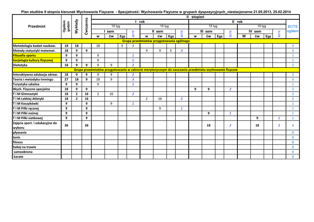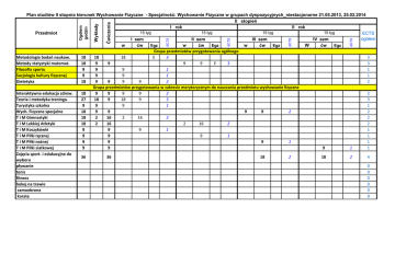 ECTS ECTS ECTS ECTS Ćwiczenia Wykłady Ogółem godzin Plan studiów II stopnia kierunek Wychowanie Fizyczne - Specjalność: Wychowanie Fizyczne w grupach dyspozycyjnych_niestacjonarne 21.05.2013, 25.02.2014 II stopień I rok II rok 15 tyg 15 tyg 15 tyg 15 tyg Przedmiot ECTS ogółem I sem II sem III sem IV sem Egz Egz Egz Egz w ćw w ćw w ćw W ćw Grupa przedmiotów przygotowania ogólnego Metodologia badań naukow. 18 18 18 E 3 3 Metody statystyki matemat. 18 9 9 9 9 E 3 3 Filozofia sportu 9 9 9 1 1 Socjologia kultury fizycznej 9 9 9 1 1 Dietetyka 18 9 9 9 9 2 2 Grupa przedmiotów przygotowania w zakresie merytorycznym do nauczania przedmiotu wychowanie fizyczne Interaktywna edukacja zdrow. 18 9 9 9 9 2 2 Teoria i metodyka treningu 27 18 9 18 9 3 3 Turystyka szkolna 9 9 9 1 1 Wych. Fizyczne specjalne 18 9 9 9 9 2 2 T i M Gimnastyki 18 2 16 2 16 2 2 T i M Lekkiej Atletyki 18 2 16 2 16 2 2 T i M Koszykówki 9 9 9 1 1 T i M Piłki ręcznej 9 9 9 1 1 T i M Piłki nożnej 9 9 9 1 1 T i M Piłki siatkowej 9 9 9 1 1 Zajęcia sport. i edukacyjne do 36 36 18 2 18 2 4 wyboru pływanie 0 tenis 0 fitness 0 hokej na trawie 0 samoobrona 0 karate 0 wspinaczka sportowa kulturystyka i trójbój siłowy jogging edukacja olimpijska taniec Organizacja i sędziowanie zawodów lekkoatletycznych 0 0 0 0 0 0 Pedagogika kultury fizycznej Psychologia kultury fizycznej 30 30 15 15 15 15 Zaawansowana dydaktyka WF 90 45 45 15 15 60 25 25 10 25 25 Psychospołeczne uwarunkowania działań agresywnych Obóz kondycyjny letni Strzelanie bojowe Wieloboje sprawnościowe Systemy bezpieczeństwa i porządku publicznego Walka wręcz w bliskim kontakcie Metodyka surwiwalu Międzynarodowe prawo humanitarne 15 60 15 25 35 35 35 3 3 4 7 2 60 2 6 10 15 25 25 35 20 Grupa przedmiotów przygotowania w zakresie psychologiczno-pedagogicznym 15 15 E 3 15 15 E 3 Grupa przedmiotów przygotowania w zakresie dydaktycznym 30 15 3 15 30 E Grupa przedmiotów - Specjalność Wychowanie Fizyczne w grupach dyspozycyjnych E 35 4 2 6 4 2 3 3 2 2 35 20 20 E 2 2 3 3 1 5 14 2 2 2 2 11 15 14 2 1 2 2 Grupa przedmiotów do wyboru Wykłady monograficzne 18 Ochrona środow./Ekologia 18 Neurob. Podst. Motor./Neurofizjologia 18 Med. Sportu/Traumat. Sport. 18 Język obcy 36 Seminarium magisterskie 27 Egzamin magisterski 18 9 9 9 27 9 9 9 36 9 9 9 1 9 2 9 9 2 9 18 5 18 9 E 6 5 9 5 9 2 9 E Praktyki i obozy Prakt. psychol. – pedagog. Prakt. dydakt. w gimnazjum Prakt. dydakt. w szkole pondgimnazjalnej Razem 30 60 60 927 320 30 60 60 607 30 1 60 2 60 Obciążenie semestralne / ECTS Liczba godzin w semestrze Liczba egzaminów w semestrze Suma punktów ECTS w roku akadem. Liczba godzin w roku akadem. Razem godzin na II stopniu studiów Egzaminy I rok 28 III sem w ćw Egz 86 150 1 236 1 32 15 tyg IV sem W ćw Egz 107 71 2 178 2 28 60 513 ECTS II sem w ćw Egz 74 196 2 270 2 15 tyg ECTS I sem w ćw Egz 113 130 3 243 3 II rok 15 tyg ECTS 15 tyg ECTS Ćwiczenia Wykłady Ogółem godzin Przedmiot II stopień 32 120 120 60 414 927 Metodologia badań naukowych Metody statystyki matematycznej Zaawansowana dydaktyka WF Międzynarodowe prawo humanitarne Pedagogika kultury fizycznej Język obcy Systemy bezpieczeństwa i porządku publicznego Egzamin magisterski Psychologia kultury fizycznej ECTS ogółem