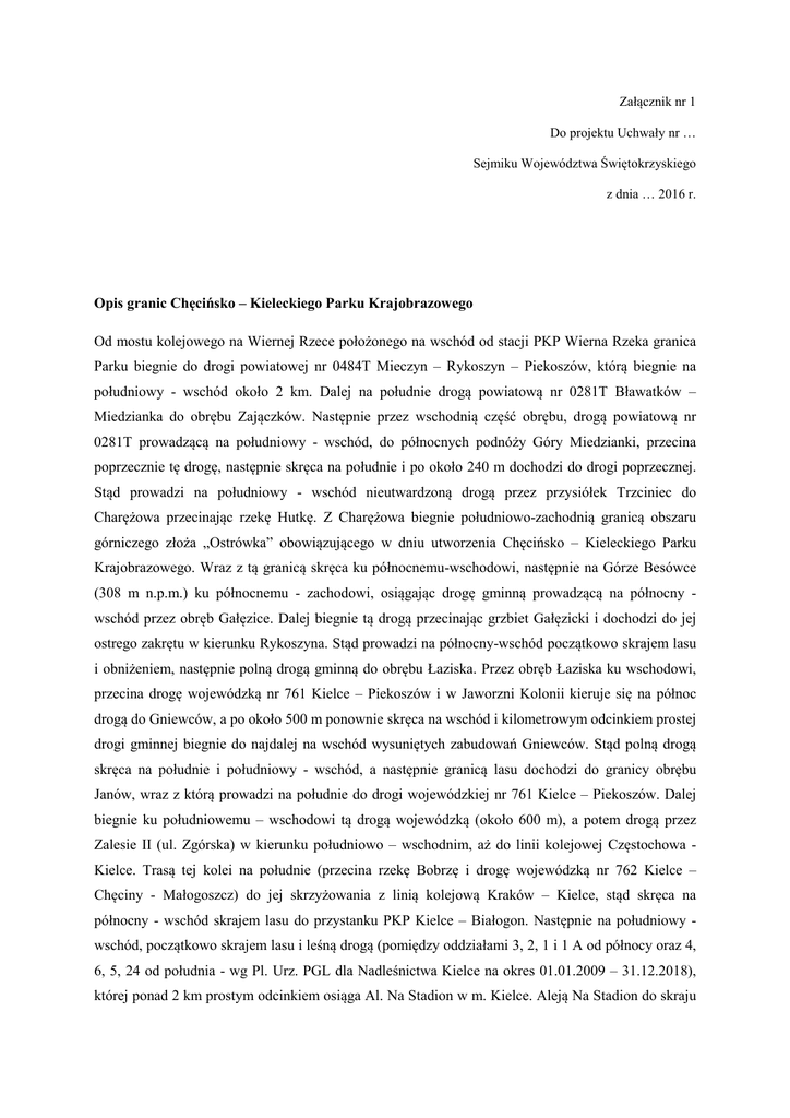 Załącznik nr 1 Do projektu Uchwały nr … Sejmiku Województwa Świętokrzyskiego z dnia … 2016 r. Opis granic Chęcińsko – Kieleckiego Parku Krajobrazowego Od mostu kolejowego na Wiernej Rzece położonego na wschód od stacji PKP Wierna Rzeka granica Parku biegnie do drogi powiatowej nr 0484T Mieczyn – Rykoszyn – Piekoszów, którą biegnie na południowy - wschód około 2 km. Dalej na południe drogą powiatową nr 0281T Bławatków – Miedzianka do obrębu Zajączków. Następnie przez wschodnią część obrębu, drogą powiatową nr 0281T prowadzącą na południowy - wschód, do północnych podnóży Góry Miedzianki, przecina poprzecznie tę drogę, następnie skręca na południe i po około 240 m dochodzi do drogi poprzecznej. Stąd prowadzi na południowy - wschód nieutwardzoną drogą przez przysiółek Trzciniec do Charężowa przecinając rzekę Hutkę. Z Charężowa biegnie południowo-zachodnią granicą obszaru górniczego złoża „Ostrówka” obowiązującego w dniu utworzenia Chęcińsko – Kieleckiego Parku Krajobrazowego. Wraz z tą granicą skręca ku północnemu-wschodowi, następnie na Górze Besówce (308 m n.p.m.) ku północnemu - zachodowi, osiągając drogę gminną prowadzącą na północny wschód przez obręb Gałęzice. Dalej biegnie tą drogą przecinając grzbiet Gałęzicki i dochodzi do jej ostrego zakrętu w kierunku Rykoszyna. Stąd prowadzi na północny-wschód początkowo skrajem lasu i obniżeniem, następnie polną drogą gminną do obrębu Łaziska. Przez obręb Łaziska ku wschodowi, przecina drogę wojewódzką nr 761 Kielce – Piekoszów i w Jaworzni Kolonii kieruje się na północ drogą do Gniewców, a po około 500 m ponownie skręca na wschód i kilometrowym odcinkiem prostej drogi gminnej biegnie do najdalej na wschód wysuniętych zabudowań Gniewców. Stąd polną drogą skręca na południe i południowy - wschód, a następnie granicą lasu dochodzi do granicy obrębu Janów, wraz z którą prowadzi na południe do drogi wojewódzkiej nr 761 Kielce – Piekoszów. Dalej biegnie ku południowemu – wschodowi tą drogą wojewódzką (około 600 m), a potem drogą przez Zalesie II (ul. Zgórska) w kierunku południowo – wschodnim, aż do linii kolejowej Częstochowa Kielce. Trasą tej kolei na południe (przecina rzekę Bobrzę i drogę wojewódzką nr 762 Kielce – Chęciny - Małogoszcz) do jej skrzyżowania z linią kolejową Kraków – Kielce, stąd skręca na północny - wschód skrajem lasu do przystanku PKP Kielce – Białogon. Następnie na południowy wschód, początkowo skrajem lasu i leśną drogą (pomiędzy oddziałami 3, 2, 1 i 1 A od północy oraz 4, 6, 5, 24 od południa - wg Pl. Urz. PGL dla Nadleśnictwa Kielce na okres 01.01.2009 – 31.12.2018), której ponad 2 km prostym odcinkiem osiąga Al. Na Stadion w m. Kielce. Aleją Na Stadion do skraju lasu, którym (ul. Obrzeżną) do ul. Ks. Piotra Ściegiennego. Ulicą tą na południe do ul. Ks. Jerzego Popiełuszki, którą na północny - wschód do skraju lasu i dalej skrajem lasu u podnóża Pasma Dymińskiego około 1 km ku wschodowi granicą oddziałów 13 i 12 i 11 (wg Pl. Urz. PGL dla Nadleśnictwa Kielce na okres 01.01.2009 – 31.12.2018). Następnie granicą lasów prywatnych ku północy i południowemu - wschodowi do drogi leśnej. Drogą tą dalej na południowy - wschód około 800 m do skraju lasu, a następnie na południowy - zachód około 200 m do strumienia bez nazwy i tym ciekiem wodnym na południowy - wschód do granicy lasu, następnie skrajem lasu i polnymi drogami do południowo - wschodniej granicy miasta Kielc. Granicą tą około 1 km na południe, a następnie ku północnemu - zachodowi (skrajem lasu) do koty 279,8 m n.p.m. Dalej skrajem lasu i ulicą Weterynaryjną do przecięcia z ulicą Księdza Piotra Ściegiennego, skąd ponownie skrajem lasu na południowy - zachód i zachód aż do zachodniego krańca Posłowic. Tu na południowy – zachód przebiega obrzeżem lasu, aż do przecięcia ulicy Posłowickiej z ulicą Zagrabowicką. Dalej ulicą Zagrabowicką, aż do przecięcia się z ulicą Charsznicką. Następnie w kierunku północno – zachodnim ul. Charsznicką do skrzyżowania z ul. Posłowicką i Chorzowską. Dalej ul. Chorzowską obok przystanku PKP Kielce-Słowik do ulicy Krakowskiej (droga wojewódzka nr 762 Kielce – Chęciny – Małogoszcz) i mostu na rzece Bobrzy. Po przecięciu granicy miasta Kielce prowadzi północno zachodnim skrajem drogi wojewódzkiej nr 762 Kielce – Chęciny – Małogoszcz i po 750 m kieruje się na północny - zachód drogą powiatową nr 15457 Zawada – Zagrody w kierunku obrębu Szewce, do zachodniej granicy obrębu Zagrody. Granicą tą (skraj lasu) ku południowi do strumienia Bobrzyczka i tym strumieniem do miejsca, gdzie strumień przecina droga wojewódzka nr 762. Drogą tą biegnie na południowy - zachód do skrzyżowania z drogą krajową nr 7 (obwodowa Kielc) i jej zachodnim obrzeżem do skrzyżowania z drogą wojewódzką nr 763 Chęciny – Morawica. Dalej tą drogą przez obręb Radkowice do rzeki Bobrzy, którą na południowy - zachód, do granicy gmin Chęciny i Morawica, następnie tą granicą do trasy kolejowej Kielce – Kraków. Wzdłuż tej trasy prowadzi na południowy - zachód, przecina rzekę Czarną Nidę i dochodzi do drogi powiatowej nr 0383T Wolica – Ostrów. Tu zmienia kierunek na północny - zachód biegnąc przez wschodnią część obrębu Wolica, gdzie ulicą Górną i ulicą Armii Krajowej w pobliżu mostu na rzece Czarnej Nidzie wchodzi drogą polną na lewy brzeg rzeki. Dalej w dół rzeki Czarnej Nidy, aż do północnej granicy obrębu Wolica, a następnie granicą tą na zachód i południowy - zachód do trasy kolei Kielce – Kraków. Wzdłuż tej linii kolejowej na południowy - zachód do granicy pomiędzy gminami Chęciny i Sobków i granicą tą na zachód do drogi krajowej nr 7. Zachodnim obrzeżem tej d