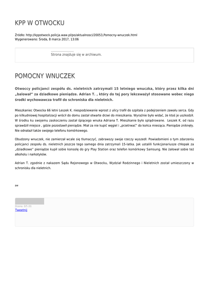 KPP W OTWOCKU Źródło: http://kppotwock.policja.waw.pl/po/aktualnosci/20053,Pomocny-wnuczek.html Wygenerowano: Środa, 8 marca 2017, 13:06 Strona znajduje się w archiwum. POMOCNY WNUCZEK Otwoccy policjanci zespółu ds. nieletnich zatrzymali 15 letniego wnuczka, który przez kilka dni „balował” za dziadkowe pieniądze. Adrian T. , który do tej pory lekceważył stosowane wobec niego środki wychowawcza trafił do schroniska dla nieletnich. Mieszkaniec Otwocka 66 letni Leszek K. niespodziewanie wprost z ulicy trafił do szpitala z podejrzeniem zawału serca. Gdy po kilkudniowej hospitalizacji wrócił do domu zastał otwarte drzwi do mieszkania. Wyraźnie było widać, że ktoś je uszkodził. W środku ku swojemu zaskoczeniu zastał śpiącego wnuka Adriana T. Mieszkanie było splądrowane. Leszek K. od razu sprawdził miejsce , gdzie pozostawił pieniądze. Miał za nie kupić węgiel i „przetrwać” do końca miesiąca. Pieniądze zniknęły. Nie odnalazł także swojego telefonu komórkowego. Obudzony wnuczek, nie zamierzał wcale się tłumaczyć, zabrawszy swoje rzeczy wyszedł. Powiadomieni o tym zdarzeniu policjanci zespołu ds. nieletnich jeszcze tego samego dnia zatrzymali 15-latka. Jak ustalili funkcjonariusze chłopak za „dziadkowe” pieniądze kupił sobie konsolę do gry Play Station oraz telefon komórkowy Samsung. Nie żałował sobie też alkoholu i narkotyków. Adrian T. zgodnie z nakazem Sądu Rejonowego w Otwocku, Wydział Rodzinnego i Nieletnich został umieszczony w schronisku dla nieletnich. aw Ocena: 0/5 (0) Tweetnij
