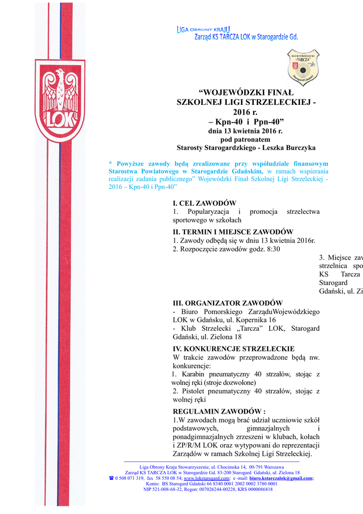 “WOJEWÓDZKI FINAŁ SZKOLNEJ LIGI STRZELECKIEJ 2016 r. – Kpn-40 i Ppn-40” dnia 13 kwietnia 2016 r. pod patronatem Starosty Starogardzkiego - Leszka Burczyka * Powyższe zawody będą zrealizowane przy współudziale finansowym Starostwa Powiatowego w Starogardzie Gdańskim, w ramach wspierania realizacji zadania publicznego” Wojewódzki Finał Szkolnej Ligi Strzeleckiej 2016 – Kpn-40 i Ppn-40” I. CEL ZAWODÓW 1. Popularyzacja i sportowego w szkołach promocja strzelectwa II. TERMIN I MIEJSCE ZAWODÓW 1. Zawody odbędą się w dniu 13 kwietnia 2016r. 2. Rozpoczęcie zawodów godz. 8:30 3. Miejsce zaw strzelnica spo KS Tarcza Starogard Gdański, ul. Zi III. ORGANIZATOR ZAWODÓW - Biuro Pomorskiego ZarząduWojewódzkiego LOK w Gdańsku, ul. Kopernika 16 - Klub Strzelecki „Tarcza” LOK, Starogard Gdański, ul. Zielona 18 IV. KONKURENCJE STRZELECKIE W trakcie zawodów przeprowadzone będą nw. konkurencje: 1. Karabin pneumatyczny 40 strzałów, stojąc z wolnej ręki (stroje dozwolone) 2. Pistolet pneumatyczny 40 strzałów, stojąc z wolnej ręki REGULAMIN ZAWODÓW : 1.W zawodach mogą brać udział uczniowie szkół podstawowych, gimnazjalnych i ponadgimnazjalnych zrzeszeni w klubach, kołach i ZP/R/M LOK oraz wytypowani do reprezentacji Zarządów w ramach Szkolnej Ligi Strzeleckiej. Liga Obrony Kraju Stowarzyszenie, ul. Chocimska 14, 00-791 Warszawa Zarząd KS TARCZA LOK w Starogardzie Gd. 83-200 Starogard Gdański, ul. Zielona 18 ( 0 508 071 319, fax 58 550 08 54; www.lokstarogard.com: e -mail: [email protected]; Konto: BS Starogard Gdański 66 8340 0001 2002 0002 3780 0001 NIP 521-008-68-32, Regon: 007026244-00228, KRS 0000086818 2. Zarządy powiatowe, rejonowe i miejskie wystawiają 4 osobowe drużyny 3. Skład drużyny może być mieszany (dziewczęta, chłopcy) 4. Zarządy, które wystawiają większą ilość zawodników, przed rozpoczęciem strzelania zgłaszają skład drużyny reprezentującej Zarząd w Finale Wojewódzkiej Szkolnej Ligi Strzeleckiej. Pozostali zawodnicy biorą udział tylko w klasyfikacji indywidualnej. V. KLASYFIKACJA 1. Indywidualna – /osobno dziewczęta i chłopcy/ 2. Drużynowa – suma uzyskanych punktów za miejsca przez zawodników w klasyfikacji indywidualnej: 1 miejsce – 11pkt, 2-9, 3-8, 4-7, 5-6, 6-5, 7-4, 8-3, 9-2, 10-1 VI. NAGRODY: Indywidualnie: 1. Za I m-ce w grupie dziewcząt – Ppn 40 - PUCHAR Starosty Starogardzkiego 2. Za I-III m-ce dziewcząt – Ppn 40 - medale 3. Za I m-ce w grupie chłopców – Ppn 40 - PUCHAR Starosty Starogardzkiego 4. Za I-III m-ce chłopców – Ppn 40 - medale 5. Za I m-ce w grupie dziewcząt – Kpn 40 - PUCHAR Starosty Starogardzkiego 6. Za I-III m-ce dziewcząt – Kpn 40 - medale 7. Za I m-ce w grupie chłopców – Kpn 40 - PUCHAR Starosty Starogardzkiego 8. Za I-III m-ce chłopców – Kpn 40 - medale Drużynowo: 1. Za m-ce w konkurencji Kpn 40: I - Puchar Dyrektora BPZW LOK w Gdańsku I - III Puchary i dyplomy 2. Za m-ce w konkurencji Ppn 40: I - Puchar Dyrektora BPZW LOK w Gdańsku I-III Puchary i dyplomy Zgłoszenia oraz dodatkowe informacje: kom. 508 071 319 Prezes KS Tarcza LOK Starogard Gdański Liga Obrony Kraju Stowarzyszenie, ul. Chocimska 14, 00-791 Warszawa Zarząd KS TARCZA LOK w Starogardzie Gd. 83-200 Starogard Gdański, ul. Zielona 18 ( 0 508 071 319, fax 58 550 08 54; www.lokstarogard.com: e -mail: [email protected]; Konto: BS Starogard Gdański 66 8340 0001 2002 0002 3780 0001 NIP 521-008-68-32, Regon: 007026244-00228, KRS 0000086818 Liga Obrony Kraju Stowarzyszenie, ul. Chocimska 14, 00-791 Warszawa Zarząd KS TARCZA LOK w Starogardzie Gd. 83-200 Starogard Gdański, ul. Zielona 18 ( 0 508 071 319, fax 58 550 08 54; www.lokstarogard.com: e -mail: [email protected]; Konto: BS Starogard Gdański 66 8340 0001 2002 0002 3780 0001 NIP 521-008-68-32, Regon: 007026244-00228, KRS 0000086818