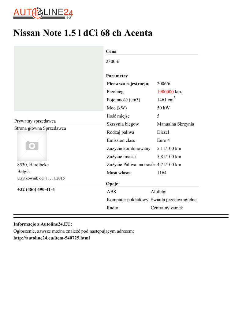 Nissan Note 1.5 l dCi 68 ch Acenta Cena 2300 € Parametry Prywatny sprzedawca Strona główna Sprzedawca 8530, Harelbeke Belgia Pierwsza rejestracja: 2006/6 Przebieg 1900000 km. Pojemność (cm3) 1461 cm3 Moc (kW) 50 kW Ilość miejsc 5 Skrzynia biegow Manualna Skrzynia Rodzaj paliwa Diesel Emission class Euro 4 Zużycie kombinowany 5,1 l/100 km Zużycie miasta 5,8 l/100 km Zużycie Paliwa. na trasie: 4,7 l/100 km Masa własna 1164 Użytkownik od: 11.11.2015 Opcje +32 (486) 490-41-4 ABS Alufelgi Komputer pokładowy Światła przeciwmgielne Radio Informacje z Autoline24.EU: Ogłoszenie, zawsze można znaleźć pod następującym adresem: http://autoline24.eu/item-540725.html Centralny zamek