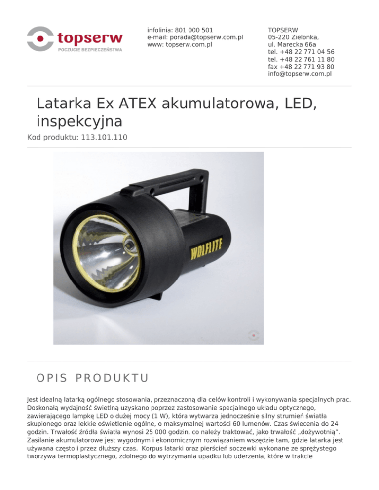 infolinia: 801 000 501 e-mail: [email protected] www: topserw.com.pl TOPSERW 05-220 Zielonka, ul. Marecka 66a tel. +48 22 771 04 56 tel. +48 22 761 11 80 fax +48 22 771 93 80 [email protected] Latarka Ex ATEX akumulatorowa, LED, inspekcyjna Kod produktu: 113.101.110 OPIS PRODUKTU Jest idealną latarką ogólnego stosowania, przeznaczoną dla celów kontroli i wykonywania specjalnych prac. Doskonałą wydajność świetlną uzyskano poprzez zastosowanie specjalnego układu optycznego, zawierającego lampkę LED o dużej mocy (1 W), która wytwarza jednocześnie silny strumień światła skupionego oraz lekkie oświetlenie ogólne, o maksymalnej wartości 60 lumenów. Czas świecenia do 24 godzin. Trwałość źródła światła wynosi 25 000 godzin, co należy traktować, jako trwałość „dożywotnią”. Zasilanie akumulatorowe jest wygodnym i ekonomicznym rozwiązaniem wszędzie tam, gdzie latarka jest używana często i przez dłuższy czas. Korpus latarki oraz pierścień soczewki wykonane ze sprężystego tworzywa termoplastycznego, zdolnego do wytrzymania upadku lub uderzenia, które w trakcie użytkowania są na porządku dziennym. Dodatkowo, materiał ten jest antystatyczny. Dopuszczona do użycia w strefach 1 i 2 z zagrożeniem wybuchu gazów, par, mgieł oraz w strefach 21 i 22 z zagrożeniem zapłonu pyłów o temperaturach zapłonu powyżej 135°C. Latarka jest dostarczana z odłączanym, wygodnym paskiem naramiennym. Współpracuje z ładowarką C251HVE lub C251LV, zakupowaną oddzielnie. Posiada certyfikat BAS 00 ATEX 2176, kod II 2 GD Ex e ib IIC T4 Ex Td A21 IP66 T135°C, znak CE oraz dopuszczenie dla zastosowań morskich Lloyd’s Register. Waga 1.75 kg. DANE TECHNICZNE Zasilanie Akumulatorowe Kategoria sprzętu 2 GD Stopień ochrony IP66 Obszar klasyfikacji (gazy) Strefy 1 i 2 Obszar klasyfikacji 21, 22 Pyły Certfikacja Bass 00ATEX 2176 Obudowa Tworzywo termoplastyczne, antystatyczne Typ żarówki Dioda LED o wysokiej mocy Czas pracy 24 h Waga 1750 g Ładowarka C251 HVE lub C251 LV Kolor Czarny
