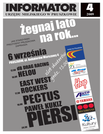INFORMATOR 4 o t a l j a n Żeg rok... na URZĘDU MIEJSKIEGO W PRUSZKOWIE SKI ARZYŃ T S WA N A J USZKO R P T DEN PREZY SZA ZAPRA a i n ś 6 wrze zawy 4 W, ul. Bo Ó K Z S U PR zlot god sk z. 1 ute 5.0 rów 0 Wars haterów NG I C A R G A DR 0 dB 12.0 16.00 HELOU T S E W EAST S R E K C O R 17.30 19.00 S U T PEC IZ I S R E I P K U K Ł E PAW 20.30 2009 Bezpieczeństwo na imprezach Największa sala gimnastyczna Od 1 sierpnia tego roku obowiązuje nowa ustawa o bezpieczeństwie imprez masowych. W związku z tym wszyscy (organizatorzy i uczestnicy) zobowiązani są do bezwzględnego przestrzegania jej zapisów. Do najważniejszych należą: 1. obowiązek przestrzegania regulaminów obiektu i regulaminu imprezy masowej, 2. stosowanie się do poleceń służb porządkowych, 3. zachowywanie się w sposób niezagrażający bezpieczeństwu innych osób, 4. zakaz wnoszenia na imprezę masową i posiadania przez uczestników broni, niebezpiecznych przedmiotów, wyrobów pirotechnicznych, napojów alkoholowych i środków odurzających, 5. możliwość legitymowania przez służby porządkowe oraz przeglądania przez nie zawartości bagaży i odzieży osób w przypadku podejrzenia, że wnoszą one lub posiadają ww przedmioty 6. wprowadzenie kary grzywny nie niższej niż 2 000 zł w przypadku nie stosowania się do zapisów pkt. 1 – 4. Ponieważ wszystkim festynom tradycyjnie towarzyszy oferta gastronomiczna, a po zmianach ustawowych festyny nie są już imprezami rekreacyjnymi – stały się imprezami masowymi – gastronomia nie wchodzi w zakres imprezy masowej. Ogródki gastronomiczne będą terenem wydzielonym, funkcjonującym obok imprezy masowej. Dlatego też korzystanie z ich oferty jest możliwe tylko i wyłącznie (patrz pkt. 4) w ich obrębie. Miejskie imprezy kulturalno-rozrywkowe organizowane w Pruszkowie od 11 lat zawsze odbywają się w miłej atmosferze i nigdy nie były powodem nieprzyjemnych zdarzeń - w przypadku pruszkowskich festynów wpływa na to także fakt, że cały teren jest monitorowany, a przebieg imprezy i zachowania uczestników są rejestrowane. Najbliższa impreza „Żegnaj lato na rok...” 6 września będzie przebiegała w nowej formule pod rządami nowej ustawy. Powinno nam wszystkim zależeć na dobrej rodzinnej zabawie, ciekawym spędzeniu niedzielnego popołudnia i cieszeniu się ciepłym końcem lata. Andrzej Królikowski Nowa hala sportowa Gimnazjum nr 4 przy ul. Hubala jest obiektem o powierzchni użytkowej 1386,2 m², powierzchni zabudowy 1563,6 m², kubaturze 13.778 m³ i wysokości 11,72 m. Jest największą szkolną salą gimnastyczną w Pruszkowie. Zastępca Prezydenta Pruszkowa Sala wyposażona jest w boisko sportowe o wymiarach 23m x 37m (851 m²) oraz w bieżnię dwutorową o długości 40m. W niższej części budynku znajduje się zaplecze z zespołem sanitarno-szatniowym dla dziewcząt i chłopców, magazynem sprzętu sportowego, magazynem do przechowywania sceny i krzeseł, pomieszczeniem na siłownię, pokojem trenerów, sanitariatami ogólnodostępnymi (w tym dla osób niepełnosprawnych) oraz pomieszczeniem porządkowym, technicznym i korytarzem połączonym z budynkiem szkoły przeszklonym łącznikiem. Boisko sportowe hali można podzielić za pomocą przesuwanych kotar podwieszonych do konstrukcji dachu na trzy w pełni niezależne boiska. Halę gimnastyczną dzieli jeszcze jedna kotara wzdłuż długiego boku oddzielając bieżnię od pozostałej części hali. Hala to budynek o konstrukcji mieszanej: fundamenty i słupy konstrukcyjne żelbetowe, ściany zewnętrzne z bloczków z betonu komórkowego, ściany działowe z cegły. Dach hali posiada drewnianą konstrukcję z drewna klejonego i jest ocieplony, w pozostałej części konstrukcję stalową, pokrycie dachu wykonano z papy termozgrzewalnej, okna, naświetla i drzwi z profili aluminiowych, podłoga hali sportowej (parkiet) jest podwójnie legarowana, elewacja budynku ocieplona, wykończona tynkiem akrylowym i płytkami klinkierowymi. Część wyższa budynku tj. hala sportowa wyposażona jest w system elektroakustyczny, a ściany wyłożone są materiałem akustycznym. Budynek jest przystosowany jest dla osób niepełnosprawnych. Koszt budowy hali sportowej wyniósł 7.400.000 zł. - (w tym dofinansowanie z Ministerstwa Sportu i Turystyki w wysokości 900.000 zł). Andrzej Kurzela Zastępca Prezydenta Pruszkowa Park Mazowsze 22 września Park Mazowsze o powierzchni 9,8 ha położony jest w północno-wschodniej części Pruszkowa na terenie dzielnicy Żbików przy ul. Mostowej. W 2007 roku rozpoczęto modernizację parku. Zgodnie z projektem z 2006 roku opracowanym przez firmę ASAK z Warszawy wykonano modernizację układu wodnego polegającą między innymi na połączeniu kanałem mniejszego stawu z większym, co spowodowało wyrównanie poziomu zwierciadła wody w obu zbiornikach oraz zarybienie mniejszego stawu i swobodny przepływ ryb. Prace trwały trzy lata. Wykonano nowe alejki, oświetlenie, elementy architektury ogrodowej (pomosty widokowe i wędkarskie, mostek łączący stawy, altanę, podium-estradę). Na polanie rekreacyjnej usytuowano linarium do wspinania, zamontowano urządzenia ścieżki zdrowia i siłowni na wolnym powietrzu. Młodzież szkolna może korzystać w sąsiedztwie ścieżki edukacyjnej z klasy na wolnym powietrzu, która przystosowana jest dla 30 osób. Pomyślano również o osobach lubiących biesiadowanie przy ognisku, tworząc specjalnie wydzielone miejsce. Istniejące boisko zostało zmodernizowane - wykonano podbudowę i nową nawierzchnię trawiastą. Obok wykonane zostało boisko do koszykówki. W bezpośrednim sąsiedztwie boisk powstał ogrodzony plac zabaw dla małych dzieci. Drzewa w parku w większości pochodzą z nasadzeń. W części wschodniej dominują zwarte masywy drzew z dużym udziałem klonów, lip i jesionów. W części zachodniej drzewostan jest rozproszony, wzdłuż traktów najczęściej występują jesiony, natomiast 