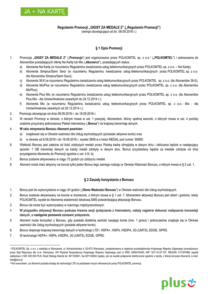 Regulamin Promocji „GIGSY ZA MEDALE 2” („Regulamin Promocji”) (wersja obowiązująca od dn. 08.09.2016 r.) § 1 Opis Promocji 1. Promocja „GIGSY ZA MEDALE 2” („Promocja”) jest organizowana przez POLKOMTEL sp. z o.o.1 („POLKOMTEL”) i adresowana do Abonentów posiadających ofertę Na Kartę lub Mix („Abonenci”), posiadających status: a) Abonenta Na Kartę (w rozumieniu Regulaminu świadczenia usług telekomunikacyjnych przez POLKOMTEL sp. z o.o. – Na Kartę); b) Abonenta Simplus/Sami Swoi (w rozumieniu Regulaminu świadczenia usług telekomunikacyjnych przez POLKOMTEL sp. z o.o. dla Abonentów Simplus/Sami Swoi); c) Abonenta 36.6 (w rozumieniu Regulaminu świadczenia usług telekomunikacyjnych przez POLKOMTEL sp. z o.o. dla Abonentów 36.6); d) Abonenta MixPlus (w rozumieniu Regulaminu świadczenia usług telekomunikacyjnych przez POLKOMTEL sp. z o.o. dla Abonentów MixPlus); e) Abonenta Plus Mix )w rozumieniu Regulaminu świadczenia usług telekomunikacyjnych przez POLKOMTEL sp. z o.o. dla Abonentów Plus Mix - dla Umów/Aneksów zawartych do 24.12.2014 r.); f) Abonenta Mix (w rozumieniu Regulaminu świadczenia usług telekomunikacyjnych przez POLKOMTEL sp. z o.o.- Mix - dla Umów/Aneksów zawartych od 25.12.2014 r.). 2. Promocja obowiązuje od dnia 08.09.2016 r. do 18.09.2016 r. 3. W ramach Promocji w okresie, o którym mowa w ust. 1 powyżej, Abonentom, którzy spełnią warunki, o których mowa w ust. 4 poniżej zostanie przyznany jednorazowy Pakiet internetowy („Bonus”) na krajową transmisję danych. 4. W celu otrzymania Bonusu Abonent powinien: a) znajdować się w Okresie ważności dla Usług wychodzących (posiadać aktywne konto) oraz b) w okresie od 8.09.2016 r do 18.09.2016 r. wysłać SMS-a o treści MEDAL pod numer: 80950. 6. Wielkość Bonusu jest zależna od ilość zdobytych medali przez Polską kadrę olimpijską w danym dniu i obliczana będzie w następujący sposób: 1 GB transmisji danych za każdy medal zdobyty w danym dniu. Bonus przydzielany będzie za medale zdobyte od dnia przystąpienia Abonenta do Promocji zgodnie z ust. 4 lit. b). 7. Bonus zostanie aktywowany w ciągu 72 godzin po zdobyciu medali. 8. Abonent może mieć aktywny na koncie tylko jeden Bonus tego samego rodzaju w Okresie Ważności Bonusu, o którym mowa w § 2 ust. 1. § 2 Zasady korzystania z Bonusu 1. Bonus jest do wykorzystania w ciągu 24 godzin („Okres Ważności Bonusu”) w Okresie ważności dla Usług wychodzących. 2. Bonus zostanie aktywowany na koncie w momencie, o którym mowa w § 1 ust. 7. Momentem aktywacji Bonusu jest dzień i godzina, kiedy POLKOMTEL wysłał do Abonenta wiadomość tekstową SMS potwierdzającą aktywację Bonusu. 3. Bonus nie może być wykorzystany w roamingu międzynarodowym. 4. W przypadku aktywacji Bonusu podczas trwania sesji (połączenia z Internetem), należy najpierw dokonać rozłączenia transmisji danych, a następnie ponownie zestawić połączenie. 5. Abonent może korzystać z Bonusu, gdy posiada dodatnią wartość swojego konta (min. 1 grosz) i jednocześnie znajduje się w Okresie ważności dla Usług wychodzących (posiada aktywne konto). 6. Bonus obejmuje krajową transmisję danych w technologii LTE2, HSPA+, HSPA, HSDPA, 3G (UMTS), EDGE, GPRS. 7. W technologii HSPA+, HSPA, HSDPA, 3G (UMTS), EDGE, GPRS: POLKOMTEL Sp. z o.o. z siedzibą w Warszawie, ul. Konstruktorska 4, 02-673 Warszawa, zarejestrowana w rejestrze przedsiębiorców Krajowego Rejestru Sądowego prowadzonym przez Sąd Rejonowy dla m.st. Warszawy, XIII Wydział Gospodarczy Krajowego Rejestru Sądowego pod nr KRS: 0000419430, NIP: 527-10-37-727, REGON: 011307968, kapitał zakładowy 3 525 300 000 PLN, Dział Obsługi Klienta tel. 601102601, fax 601102602 (opłaty, jak za zwykłe połączenie telefoniczne zgodnie z taryfą, z której korzysta Abonent), e-mail: [email protected] 2 Pod warunkiem, że Abonent posiada dostęp do technologii LTE na podstawie innych oferowanych przez POLKOMTEL promocji. 1 a) b) c) 8. W technologii LTE: a) b) c) d) 9. Bonus obejmuje dostęp do Internetu poprzez Punkty Dostępu (APN): WAP (wap, wap.plusgsm.pl, plus); internet (Internet, www.plusgsm.pl, plus), Bonus nie obejmuje pakietowej transmisji danych w ramach usług: MMS, video streaming oraz innych usług, w tym usług audio, które korzystają z protokołu RTSP (Real Time Streaming Protocol), np.: aplikacje obsługujące radio, które to transmisje danych rozliczane są odpowiednio zgodnie z Cennikiem Taryfy, z której korzysta Abonent bądź regulaminem promocyjnej usługi „Videorozmowa – spróbuj i zobacz” oraz „Transmisja Video Streaming”, transmisja danych przy połączeniach z portalem Plus.pl nie pomniejsza jednostek dostępnych w ramach Bonusu, pod warunkiem korzystania zgodnie z Regulaminem Promocji „Plus.pl najlepszy portal w komórce bez dodatkowych opłat”. Bonus obejmuje dostęp do internetu poprzez Punkt Dostępu (APN): plus lub APN internet, Bonus nie obejmuje pakietowej transmisji danych w ramach usług: MMS, video streaming oraz innych usług, w tym usług audio, które korzystają z protokołu RTSP (Real Time Streaming Protocol), np.: aplikacje obsługujące radio, które to transmisje danych rozliczane są odpowiednio zgodnie z Cennikiem Taryfy, z której korzysta Abonent bądź regulaminem promocyjnej usługi „Videorozmowa – spróbuj i zobacz” oraz „Transmisja Video Streaming”, transmisja danych przy połączeniach z portalem Plus.pl nie pomniejsza jednostek dostępnych w ramach Bonusu, pod warunkiem korzystania zgodnie z Regulaminem Promocji „Plus.pl najlepszy portal w komórce bez dodatkowych opłat”. korzystanie z usługi „Video Streaming” w ramach promocji "Transmisja Video Streaming" w technologii LTE jest rozliczane zgodnie z Cennikiem Taryfy, z której korzysta Abonent. W celu transmisji danych w technologii LTE, oprócz posiadania telefonu wspierającego LTE, przebywania w zasięgu LTE i posiadania kar