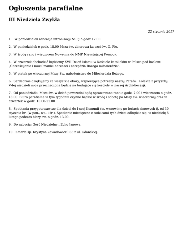 Ogłoszenia parafialne III Niedziela Zwykła 22 stycznia 2017 1. W poniedziałek adoracja intronizacji NSPJ o godz.17.00. 2. W poniedziałek o godz. 18.00 Msza św. zbiorowa ku czci św. O. Pio. 3. W środę rano i wieczorem Nowenna do NMP Nieustającej Pomocy. 4. W czwartek obchodzić będziemy XVII Dzień Islamu w Kościele katolickim w Polsce pod hasłem: „Chrześcijanie i muzułmanie: adresaci i narzędzia Bożego miłosierdzia”. 5. W piątek po wieczornej Mszy Św. nabożeństwo do Miłosierdzia Bożego. 6. Serdecznie dziękujemy za wszystkie ofiary, wspierające potrzeby naszej Parafii. Kolekta z przyszłej V-tej niedzieli m-ca przeznaczona będzie na budujące się kościoły w naszej Archidiecezji. 7. Od poniedziałku Msze św. w dzień powszedni będą sprawowane rano o godz. 7.00 i wieczorem o godz. 18.00. Biuro parafialne w tym tygodniu czynne będzie w środę i sobotę po Mszy św. wieczornej oraz w czwartek w godz. 10.00-11.00 8. Spotkania przygotowawcze dla dzieci do I-szej Komunii św. wznowimy po feriach zimowych tj. od 30 stycznia br. (w pon., wt., i śr.). Spotkanie miesięczne z rodzicami tych dzieci odbędzie się w niedzielę 5 lutego podczas Mszy św. o godz. 13.00. 9. Do nabycia: Gość Niedzielny i Echo Janowa. 10. Zmarła śp. Krystyna Zawadowicz l.83 z ul. Gdańskiej.