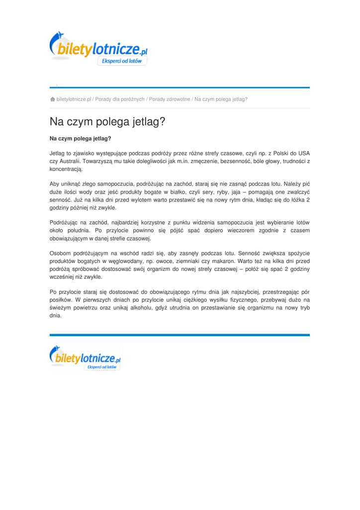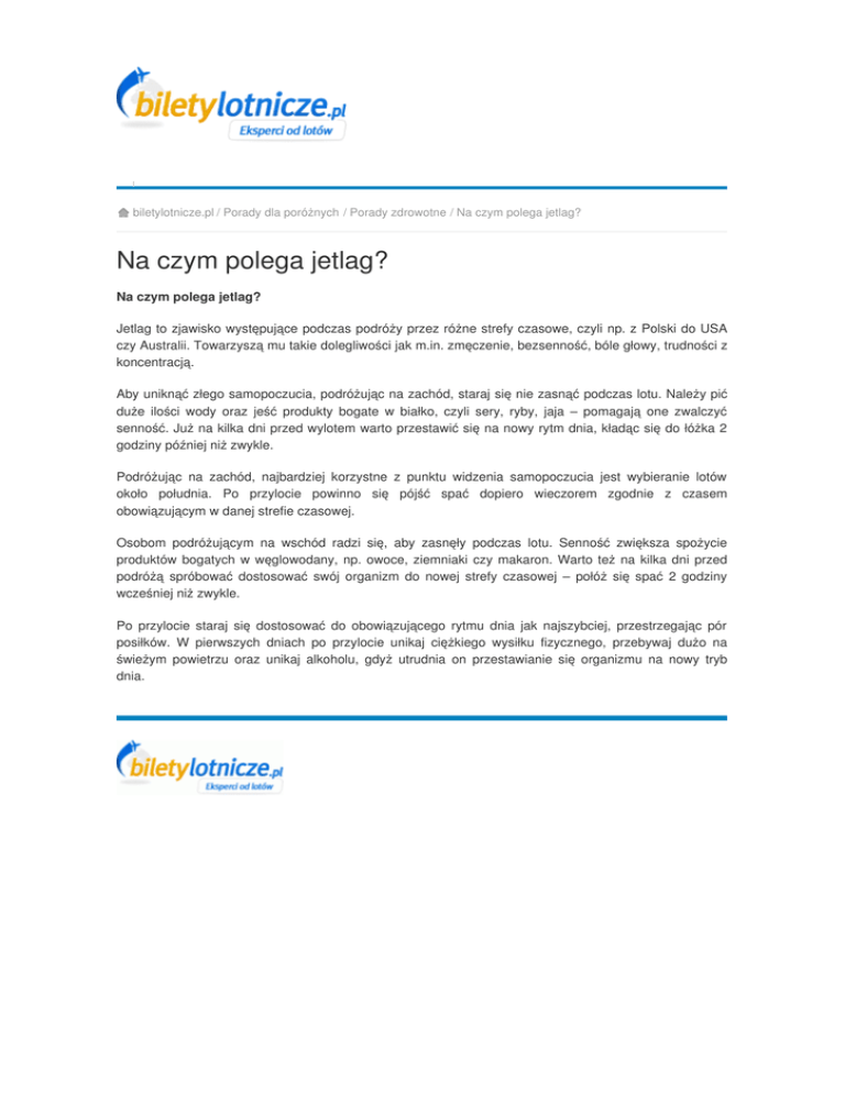 Poradnik podróżnika biletylotnicze.pl / Porady dla poróżnych / Porady zdrowotne / Na czym polega jetlag? Na czym polega jetlag? Na czym polega jetlag? Jetlag to zjawisko występujące podczas podróży przez różne strefy czasowe, czyli np. z Polski do USA czy Australii. Towarzyszą mu takie dolegliwości jak m.in. zmęczenie, bezsenność, bóle głowy, trudności z koncentracją. Aby uniknąć złego samopoczucia, podróżując na zachód, staraj się nie zasnąć podczas lotu. Należy pić duże ilości wody oraz jeść produkty bogate w białko, czyli sery, ryby, jaja – pomagają one zwalczyć senność. Już na kilka dni przed wylotem warto przestawić się na nowy rytm dnia, kładąc się do łóżka 2 godziny później niż zwykle. Podróżując na zachód, najbardziej korzystne z punktu widzenia samopoczucia jest wybieranie lotów około południa. Po przylocie powinno się pójść spać dopiero wieczorem zgodnie z czasem obowiązującym w danej strefie czasowej. Osobom podróżującym na wschód radzi się, aby zasnęły podczas lotu. Senność zwiększa spożycie produktów bogatych w węglowodany, np. owoce, ziemniaki czy makaron. Warto też na kilka dni przed podróżą spróbować dostosować swój organizm do nowej strefy czasowej – połóż się spać 2 godziny wcześniej niż zwykle. Po przylocie staraj się dostosować do obowiązującego rytmu dnia jak najszybciej, przestrzegając pór posiłków. W pierwszych dniach po przylocie unikaj ciężkiego wysiłku fizycznego, przebywaj dużo na świeżym powietrzu oraz unikaj alkoholu, gdyż utrudnia on przestawianie się organizmu na nowy tryb dnia.