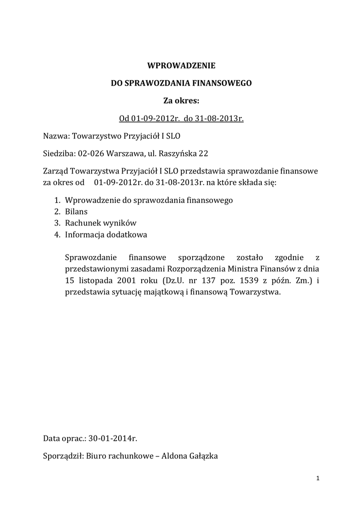 WPROWADZENIE DO SPRAWOZDANIA FINANSOWEGO Za okres: Od 01-09-2012r. do 31-08-2013r. Nazwa: Towarzystwo Przyjaciół I SLO Siedziba: 02-026 Warszawa, ul. Raszyńska 22 Zarząd Towarzystwa Przyjaciół I SLO przedstawia sprawozdanie finansowe za okres od 01-09-2012r. do 31-08-2013r. na które składa się: 1. 2. 3. 4. Wprowadzenie do sprawozdania finansowego Bilans Rachunek wyników Informacja dodatkowa Sprawozdanie finansowe sporządzone zostało zgodnie z przedstawionymi zasadami Rozporządzenia Ministra Finansów z dnia 15 listopada 2001 roku (Dz.U. nr 137 poz. 1539 z późn. Zm.) i przedstawia sytuację majątkową i finansową Towarzystwa. Data oprac.: 30-01-2014r. Sporządził: Biuro rachunkowe – Aldona Gałązka 1 Zatwierdził: Jerzy Modlinger – Prezes Zarządu ………………………………………. Ewa Kulik Bielińska – Wiceprezes Zarządu ……………………….. Jerzy Lisiecki – Skarbnik …………………………………………………….. Rafał Derda – Sekretarz ………………………………………………………. Stefan Bogusławski ……………………………………………………………….. Zulfia Buzurtanowa ………………………………………………………………. Filip Haka…………………………………………………………………………………………… Iwona Hass………………………………………………………… Piotr Laskowski ……………………………………………………………………. Elżbieta Lewandowska …………………………………………………………. Waldemar Małyska ………………………………………………………………. 2 1. Dane identyfikacyjne Nazwa : Towarzystwo Przyjaciół I Społecznego Liceum Ogólnokształcącego Wewnętrzne jednostki organizacyjne: W skład Towarzystwa wchodzą następujące jednostki organizacyjne: 1. Towarzystwo Przyjaciół I Społecznego Liceum Ogólnokształcącego, 02-026 Warszawa, ul. Raszyńska 22, nr Regon 001390227 nr NIP 525-15-74-221 2. I Społeczne Liceum Ogólnokształcące, 01-167 Warszawa, Zawiszy 13, nr Regon 146342687 3. Społeczne Gimnazjum nr 20, 02-026 Warszawa ul. Raszyńska 22, nr Regon 146437815 4. Wielokulturowe Liceum Humanistyczne im. Jacka Kuronia, Warszawa ul. Kłopotowskiego 31, nr Regon 146416210 5. Społeczne Gimnazjum „Startowa” – Warszawa, ul. Startowa 9, Regon 146484068 6. Społeczna Szkoła Podstawowa TP ISLO – Warszawa , ul. Kawalerii 5, Regon 146887725 Adres siedziby: 02-026 Warszawa, ul. Raszyńska 22 Organ prowadzący rejestr: Sąd Rejonowy dla M. ST. Warszawy w Warszawie XII Wydział Gospodarczy Krajowego Rejestru Sądowego Numer rejestru - KRS 0000024016 data rejestracji - 10.08.2001 r. Numer Regon 001390227 Czas trwania jednostki - nieograniczony 3 Okres objęty sprawozdaniem – 01.09.2012r. – 31.08.2013r. Organ uprawniony do reprezentacji podmiotu - Zarząd Skład Zarządu: Jerzy Modlinger – Prezes Zarządu Ewa Kulik Bielińska – Wiceprezes Zarządu Jerzy Lisiecki - Skarbnik Rafał Derda - Sekretarz Stefan Bogusławski Zulfia Buzurtanowa Filip Haka Iwona Hass Piotr Laskowski Elżbieta Lewandowska Waldemar Małyska Przedmiot działalności: Towarzystwo Przyjaciół I Społecznego Liceum Ogólnokształcącego jest Organizacją Pożytku Publicznego. Przedmiotem podstawowej działalności statutowej Towarzystwa w roku obrotowym była działalność edukacyjna określona zgodnie z klasyfikacją PKD 9499Z. Działalność statutowa pożytku publicznego ma charakter działalności odpłatnej i nieodpłatnej. Odpłatna działalność statutowa polega na prowadzeniu: 4 1. I Społecznego Liceum Ogólnokształcącego, 2. Społecznego Gimnazjum nr 20 3. Wielokulturowego Liceum Humanistycznego 4. Społeczne Gimnazjum „Startowa” 5. Społecznej Szkoły Podstawowej TP I SLO Nieodpłatna działalność statutowa polega na: 1) popularyzowaniu koncepcji zakładania i prowadzenia niepublicznych szkół autorskich poprzez działalność wydawniczą, organizację kursów i szkoleń oraz informowanie o podejmowanych działaniach; 2) inicjowaniu, propagowaniu i doskonaleniu autorskich programów oświatowych i wychowawczych mających na celu edukację w duchu zasad społeczeństwa obywatelskiego; 3) kształtowaniu w uczniach postawy życzliwości, tolerancji i wrażliwości wobec innych w myśl idei wychowawczych przyjętych przez szkoły, o których mowa w pkt.1. Informacje podstawowe: - sprawozdanie finansowe obejmuje dane łączne Towarzystwa i 5 wchodzących w skład Towarzystwa jednostek organizacyjnych, dla których począwszy od 1.09.2012 r. prowadzona jest jedna księga główna oraz księgi pomocnicze, które stanowią łącznie księgi rachunkowe Towarzystwa. - sprawozdanie finansowe zostało sporządzone przy założeniu możliwości dalszej kontynuacji odpłatnej i nieodpłatnej działalności statutowej pożytku publicznego. - organizacja sporządza rachunek wyników zgodnie z załącznikiem do rozporządzenia Ministra Finansów z dnia 15 listopada 2001r. (Dz. U. nr 137, poz. 1539 z późn. zm.) dostosowanym do działalności Towarzystwa z 5 podziałem na działalność statutową odpłatną i nieodpłatną pożytku publicznego - zgodnie z zasadą memoriału organizacja ujmuje w księgach wszystkie osiągnięte przychody statutowe i koszty związane z przychodami. Przyjęte zasady rachunkowości , w tym metody wyceny aktywów i pasywów, pomiaru wyniku finansowego – w zakresie w jakim ustawa pozostawia jednostce prawo wyboru – zaprezentowano poniżej: Wycena aktywów: Aktywa i pasywa wyceniono wg zasad określonych ustawą o rachunkowości z tym, że: 1. Do amortyzacji środków trwałych oraz wartości niematerialnych i prawnych jednostka stosuje stawki przewidziane w Wykazie rocznych stawek amortyzacyjnych, stanowiących załącznik do ustawy podatkowej – metoda liniowa. 2. Środki trwałe oraz wartości niema