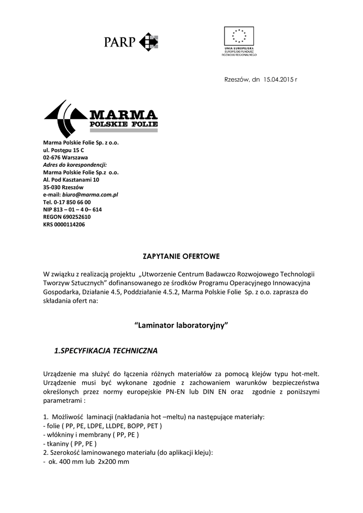 Rzeszów, dn 15.04.2015 r Marma Polskie Folie Sp. z o.o. ul. Postępu 15 C 02-676 Warszawa Adres do korespondencji: Marma Polskie Folie Sp.z o.o. Al. Pod Kasztanami 10 35-030 Rzeszów e-mail: [email protected] Tel. 0-17 850 66 00 NIP 813 – 01 – 4 0– 614 REGON 690252610 KRS 0000114206 ZAPYTANIE OFERTOWE W związku z realizacją projektu „Utworzenie Centrum Badawczo Rozwojowego Technologii Tworzyw Sztucznych” dofinansowanego ze środków Programu Operacyjnego Innowacyjna Gospodarka, Działanie 4.5, Poddziałanie 4.5.2, Marma Polskie Folie Sp. z o.o. zaprasza do składania ofert na: “Laminator laboratoryjny” 1.SPECYFIKACJA TECHNICZNA Urządzenie ma służyd do łączenia różnych materiałów za pomocą klejów typu hot-melt. Urządzenie musi byd wykonane zgodnie z zachowaniem warunków bezpieczeostwa określonych przez normy europejskie PN-EN lub DIN EN oraz zgodnie z poniższymi parametrami : 1. Możliwośd laminacji (nakładania hot –meltu) na następujące materiały: - folie ( PP, PE, LDPE, LLDPE, BOPP, PET ) - włókniny i membrany ( PP, PE ) - tkaniny ( PP, PE ) 2. Szerokośd laminowanego materiału (do aplikacji kleju): - ok. 400 mm lub 2x200 mm 3. Możliwośd zawężenia szczeliny do 40 mm 4. Gramatura laminacji ( nakładanego hot – meltu): 20 - 80 g/m2 5. Prędkośd laminacji ok. 30 m/min. 1.2 Zakres dostawy Dostawca laminatora zobowiązany jest do jego dostawy oraz przeszkolenia załogi z zakresu obsługi. Laminator musi posiadad certyfikat CE. 2. TERMIN DOSTAWY i uruchomienia Laminator musi byd dostarczony do zakładu kupującego do 4 miesięcy od podpisania umowy/zamówienia. 3. OPIS SPOSOBU PRZYGOTOWANIA OFERTY Oferta powinna byd przygotowana zgodnie z wymogami zawartymi w niniejszym Zapytaniu, w formie pisemnej. 4. TERMIN, MIEJSCE I SPOSÓB SKŁADANIA OFERT Oferty należy składad w nieprzekraczalnym terminie do 15.05.2015 r. pocztą elektroniczną w formacie .pdf na adres : [email protected] Niniejsze zapytanie ofertowe zostało zamieszczone na stronie internetowej Zamawiającego: www.marma.com.pl Dopuszcza się składanie ofert listownie, na adres spółki przeznaczony do korespondencji. 5. TERMIN ZWIĄZANIA OFERTĄ – 3 miesiące 6. OPIS KRYTERIÓW, KTÓRYMI ZAMAWIAJĄCY BĘDZIE SIĘ KIEROWAŁ PRZY WYBORZE OFERTY Przy wyborze najkorzystniejszej oferty Zamawiający będzie kierowad się następującymi kryteriami: - zastosowane rozwiązania techniczne i technologiczne – 40% - cena – 60% 7. OSOBY UPOWAŻNIONE DO KONTAKTU Osobą upoważnioną do kontaktu z oferentami jest Jan Pudło , tel.kom. 663 630 031 , e-mail: [email protected] 8. Zamawiający zastrzega sobie prawo do unieważnienia postępowania zakupowego bez podania przyczyn.