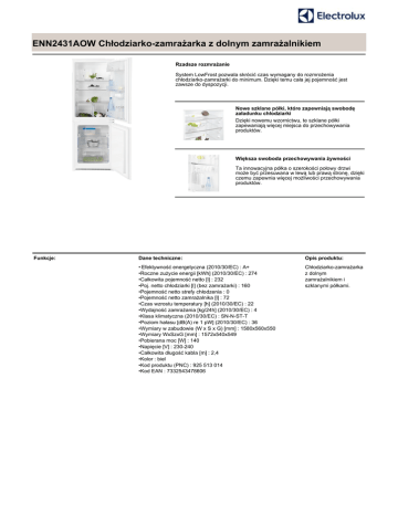 ENN2431AOW Chłodziarko-zamrażarka z dolnym zamrażalnikiem Rzadsze rozmrażanie System LowFrost pozwala skrócić czas wymagany do rozmrożenia chłodziarko-zamrażarki do minimum. Dzięki temu cała jej pojemność jest zawsze do dyspozycji. Nowe szklane półki, które zapewniają swobodę załadunku chłodziarki Dzięki nowemu wzornictwu, te szklane półki zapewaniają więcej miejsca do przechowywania produktów. Większa swoboda przechowywania żywności Ta innowacyjna półka o szerokości połowy drzwi może być przesuwana w lewą lub prawą stronę, dzięki czemu zapewnia więcej możliwości przechowywania produktów. Funkcje: Dane techniczne: Opis produktu: • Efektywność energetyczna (2010/30/EC) : A+ •Roczne zużycie energii [kWh] (2010/30/EC) : 274 •Całkowita pojemność netto [l] : 232 •Poj. netto chłodziarki [l] (bez zamrażarki) : 160 •Pojemność netto strefy chłodzenia : 0 •Pojemność netto zamrażalnika [l] : 72 •Czas wzrostu temperatury [h] (2010/30/EC) : 22 •Wydajność zamrażania [kg/24h] (2010/30/EC) : 4 •Klasa klimatyczna (2010/30/EC) : SN-N-ST-T •Poziom hałasu [dB(A) re 1 pW] (2010/30/EC) : 36 •Wymiary w zabudowie (W x S x G) [mm] : 1580x560x550 •Wymiary WxSzxG [mm] : 1572x540x549 •Pobierana moc [W] : 140 •Napięcie [V] : 230-240 •Całkowita długość kabla [m] : 2,4 •Kolor : biel •Kod produktu (PNC) : 925 513 014 •Kod EAN : 7332543478606 Chłodziarko-zamrażarka z dolnym zamrażalnikiem i szklanymi półkami. ENN2431AOW Chłodziarko-zamrażarka z dolnym zamrażalnikiem