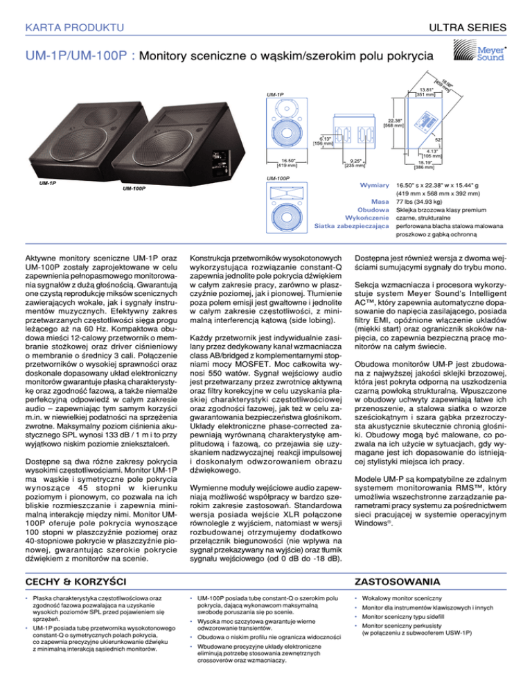 KARTA PRODUKTU ULTRA SERIES UM-1P/UM-100P : Monitory sceniczne o w¹skim/szerokim polu pokrycia Wymiary 16.50" s x 22.38" w x 15.44" g Masa Obudowa Wykoñczenie Siatka zabezpieczaj¹ca Aktywne monitory sceniczne UM-1P oraz UM-100P zosta³y zaprojektowane w celu zapewnienia pe³nopasmowego monitorowania sygna³ów z du¿¹ g³oœnoœci¹. Gwarantuj¹ one czyst¹ reprodukcjê miksów scenicznych zawieraj¹cych wokale, jak i sygna³y instrumentów muzycznych. Efektywny zakres przetwarzanych czêstotliwoœci siêga progu le¿¹cego a¿ na 60 Hz. Kompaktowa obudowa mieœci 12-calowy przetwornik o membranie sto¿kowej oraz driver ciœnieniowy o membranie o œrednicy 3 cali. Po³¹czenie przetworników o wysokiej sprawnoœci oraz doskonale dopasowany uk³ad elektroniczny monitorów gwarantuje p³ask¹ charakterystykê oraz zgodnoœæ fazow¹, a tak¿e niemal¿e perfekcyjn¹ odpowiedŸ w ca³ym zakresie audio – zapewniaj¹c tym samym korzyœci m.in. w niewielkiej podatnoœci na sprzê¿enia zwrotne. Maksymalny poziom ciœnienia akustycznego SPL wynosi 133 dB / 1 m i to przy wyj¹tkowo niskim poziomie zniekszta³ceñ. Dostêpne s¹ dwa ró¿ne zakresy pokrycia wysokimi czêstotliwoœciami. Monitor UM-1P ma w¹skie i symetryczne pole pokrycia wynosz¹ce 45 stopni w kierunku poziomym i pionowym, co pozwala na ich bliskie rozmieszczanie i zapewnia minimaln¹ interakcjê miêdzy nimi. Monitor UM100P oferuje pole pokrycia wynosz¹ce 100 stopni w p³aszczyŸnie poziomej oraz 40-stopniowe pokrycie w p³aszczyŸnie pionowej, gwarantuj¹c szerokie pokrycie dŸwiêkiem z monitorów na scenie. Konstrukcja przetworników wysokotonowych wykorzystuj¹ca rozwi¹zanie constant-Q zapewnia jednolite pole pokrycia dŸwiêkiem w ca³ym zakresie pracy, zarówno w p³aszczyŸnie poziomej, jak i pionowej. T³umienie poza polem emisji jest gwa³towne i jednolite w ca³ym zakresie czêstotliwoœci, z minimaln¹ interferencj¹ k¹tow¹ (side lobing). Ka¿dy przetwornik jest indywidualnie zasilany przez dedykowany kana³ wzmacniacza class AB/bridged z komplementarnymi stopniami mocy MOSFET. Moc ca³kowita wynosi 550 watów. Sygna³ wejœciowy audio jest przetwarzany przez zwrotnicê aktywn¹ oraz filtry korekcyjne w celu uzyskania p³askiej charakterystyki czêstotliwoœciowej oraz zgodnoœci fazowej, jak te¿ w celu zagwarantowania bezpieczeñstwa g³oœnikom. Uk³ady elektroniczne phase-corrected zapewniaj¹ wyrównan¹ charakterystykê amplitudow¹ i fazow¹, co przejawia siê uzyskaniem nadzwyczajnej reakcji impulsowej i doskona³ym odwzorowaniem obrazu dŸwiêkowego. Wymienne modu³y wejœciowe audio zapewniaj¹ mo¿liwoœæ wspó³pracy w bardzo szerokim zakresie zastosowañ. Standardowa wersja posiada wejœcie XLR po³¹czone równolegle z wyjœciem, natomiast w wersji rozbudowanej otrzymujemy dodatkowo prze³¹cznik biegunowoœci (nie wp³ywa na sygna³ przekazywany na wyjœcie) oraz t³umik sygna³u wejœciowego (od 0 dB do -18 dB). • UM-1P posiada tubê przetwornika wysokotonowego constant-Q o symetrycznych polach pokrycia, co zapewnia precyzyjne ukierunkowanie dŸwiêku z minimaln¹ interakcj¹ s¹siednich monitorów. Dostêpna jest równie¿ wersja z dwoma wejœciami sumuj¹cymi sygna³y do trybu mono. Sekcja wzmacniacza i procesora wykorzystuje system Meyer Sound’s Intelligent AC™, który zapewnia automatyczne dopasowanie do napiêcia zasilaj¹cego, posiada filtry EMI, opóŸnione w³¹czenie uk³adów (miêkki start) oraz ogranicznik skoków napiêcia, co zapewnia bezpieczn¹ pracê monitorów na ca³ym œwiecie. Obudowa monitorów UM-P jest zbudowana z najwy¿szej jakoœci sklejki brzozowej, która jest pokryta odporn¹ na uszkodzenia czarn¹ pow³ok¹ strukturaln¹. Wpuszczone w obudowy uchwyty zapewniaj¹ ³atwe ich przenoszenie, a stalowa siatka o wzorze szeœciok¹tnym i szara g¹bka przezroczysta akustycznie skutecznie chroni¹ g³oœniki. Obudowy mog¹ byæ malowane, co pozwala na ich u¿ycie w sytuacjach, gdy wymagane jest ich dopasowanie do istniej¹cej stylistyki miejsca ich pracy. Modele UM-P s¹ kompatybilne ze zdalnym systemem monitorowania RMS™, który umo¿liwia wszechstronne zarz¹dzanie parametrami pracy systemu za poœrednictwem sieci pracuj¹cej w systemie operacyjnym Windows®. ZASTOSOWANIA CECHY & KORZYŒCI • P³aska charakterystyka czêstotliwoœciowa oraz zgodnoœæ fazowa pozwalaj¹ca na uzyskanie wysokich poziomów SPL przed pojawieniem siê sprzê¿eñ. (419 mm x 568 mm x 392 mm) 77 lbs (34.93 kg) Sklejka brzozowa klasy premium czarne, strukturalne perforowana blacha stalowa malowana proszkowo z g¹bk¹ ochronn¹ • UM-100P posiada tubê constant-Q o szerokim polu pokrycia, daj¹c¹ wykonawcom maksymaln¹ swobodê poruszania siê po scenie. • Wysoka moc szczytowa gwarantuje wierne odwzorowanie transientów. • Obudowa o niskim profilu nie ogranicza widocznoœci • Wbudowane precyzyjne uk³ady elektroniczne eliminuj¹ potrzebê stosowania zewnêtrznych crossoverów oraz wzmacniaczy. • Wokalowy monitor sceniczny • Monitor dla instrumentów klawiszowych i innych • Monitor sceniczny typu sidefill • Monitor sceniczny perkusisty (w po³¹czeniu z subwooferem USW-1P) DANE TECHNICZE UM-1P/UM-100P UWAGI AKUSTYCZNE Zakres czêstotliwoœci pracy1 Charakterystyka czêstotliwoœciowa2 Charakterystyka fazowa Maksymalny szczytowy SPL3 Zakres dynamiki POLE POKRYCIA 60 Hz - 18 kHz 65 Hz - 17 kHz +/-4 dB 500 Hz - 16 kHz +/-35o° 133 dB >110 dB UM-1P: 45o x 45o; UM-100P: 100o poziomo x 40o pionowo CROSSOVER4 UM-1P: 1000 Hz; UM-100P: 1200 Hz PRZETWORNIKI Niskie czêstotliwoœci Wysokie czêstotliwoœci jeden 12" g³oœnik z membran¹ sto¿kow¹ Impedancja nominalna: 2 Ω cewka g³osowa: 3" Moc: 400 W (AES)5 jeden 3" przetwornik ciœnieniowy Impedancja nominalna: 16 Ω Œrednica cewki g³osowej: 3" Œrednica membrany: 3" Œrednica otworu wyjœciowego: wylot 1.4" Moc: 100 W (AES)5 WEJŒCIE AUDIO Typ Maksymalny zakres sygna³ów synfazowych Z³¹cza Impedancja wejœciowa Po³¹czen