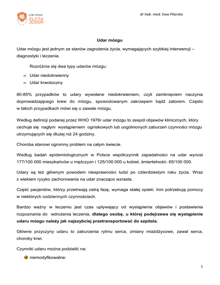 dr hab. med. Ewa Pilarska Udar mózgu Udar mózgu jest jednym ze stanów zagrożenia życia, wymagających szybkiej interwencji – diagnostyki i leczenia. Rozróżnia się dwa typy udarów mózgu: • Udar niedokrwienny • Udar krwotoczny 80-85% przypadków to udary wywołane niedokrwieniem, czyli zamknięciem naczynia doprowadzającego krew do mózgu, spowodowanym zakrzepem bądź zatorem. Często w takich przypadkach mówi się o zawale mózgu. Według definicji podanej przez WHO 1976r udar mózgu to zespól objawów klinicznych, który cechuje się nagłym wystąpieniem ogniskowych lub uogólnionych zaburzeń czynności mózgu utrzymujących się dłużej niż 24 godziny. Choroba stanowi ogromny problem na całym świecie. Według badań epidemiologicznych w Polsce współczynnik zapadalności na udar wynosi 177/100 000 mieszkańców u mężczyzn i 125/100 000 u kobiet, śmiertelność- 65/100 000. Udary są też głównym powodem niesprawności ludzi po czterdziestym roku życia. Wraz z wiekiem ryzyko zachorowania na udar znacząco wzrasta. Część pacjentów, którzy przetrwają ostrą fazę, wymaga stałej opieki. Inni potrzebują pomocy w niektórych codziennych czynnościach. Bardzo ważny w leczeniu jest czas upływający od wystąpienia objawów i postawienia rozpoznania do wdrożenia leczenia, dlatego osobę, u której podejrzewa się wystąpienie udaru mózgu należy jak najszybciej przetransportować do szpitala. Główne przyczyny udaru to zaburzenia rytmu serca, zmiany miażdżycowe, zawal serca, choroby krwi. Czynniki udaru można podzielić na: niemodyfikowalne: 1 dr hab. med. Ewa Pilarska • wiek - od 55 rż. ryzyko wzrasta 2-krotnie • płeć męska >o 30% • rasa - rasa czarna, latynoamerykanska • obciążający wywiad rodzinny: rodzinne zaburzenia lipidowe, udary mózgu w rodzinie, zab. układu krzepnięcia Czynniki modyfikowalne: • nadciśnienie tętnicze • palenie tytoniu • cukrzyca • migotanie przedsionków • hiperlipidemia Zatem udar grozi osobom z nadciśnieniem, chorobą serca, cukrzycą - szczególnie wówczas jeżeli choroby te nie są leczone! Do udaru doprowadzić może w niehigieniczny tryb życia, bowiem ryzyko udaru bardzo podwyższa otyłość, brak ruchu, nadużywanie alkoholu, palenie papierosów. Objawy udaru: • niedowład lub porażenie połowicze • porażenia dolnej części twarzy (czasem tylko opadający kącik ust) • zaburzenie czucia po jednej stronie ciała • zaburzenia mowy • zaburzenia wzroku • zawroty i bóle głowy • zaburzenia bądź utrata świadomości • Objawy ogniskowe zależą od lokalizacji ogniska ( niedokrwiennego, krwotocznego) Każdy objaw neurologiczny należy potraktować poważnie: drętwienie, mrowienie ręki, osłabienie ręki, nogi, drętwienie połowy ciała, bezwład kończyn, szczególnie po przebudzeniu, trudności w mówieniu, utrudniony kontakt wymaga kontaktu z lekarzem 2 dr hab. med. Ewa Pilarska Nie należy czekać - wezwij pogotowie! Ważny jest szybki transport chorego do szpitala (Oddział Udarowy), najlepiej w ciągu 3 godzin, bowiem wówczas możliwe jest zastosowanie specjalistycznego leczenia (leczenie trombolityczne), które w znaczny sposób uchroni chorego przed poważnymi następstwami Następstwa udaru mózgu są poważne: • Niestety znaczna część pacjentów umiera, jeżeli przeżyją najczęściej wymagają pomocy osoby drugiej w zakresie podstawowych czynności życiowych. Na co zwrócić uwagę ( opiekun, członek rodziny): • Początek zaburzeń: nagły, nawracający, objawy narastające, w jakim czasie? • Godzina której wystąpiły pierwsze objawy? • Kolejność występowania objawów- obszary ciała • Czynniki sprzyjające wystąpieniu objawów: stres, wysiłek, kołatanie serca, zażycie leków • Objawy poprzedzające: ból głowy, mroczki przed oczami • Czy pacjent choruje przewlekle? • Do szpitala zabierz leki które przyjmuje chory Co możemy zrobić aby uniknąć udaru: Stosować właściwą dietę Regularny wysiłek fizyczny Zmniejszyć masę ciała Leczyć nadciśnienie, choroby serca Stosować regularnie leki zalecane przez lekarza Dr hab. med. Ewa Pilarska Kierownik Kliniki Neurologii Rozwojowej Katedry Neurologii Gdańskiego Uniwersytetu Medycznego 3