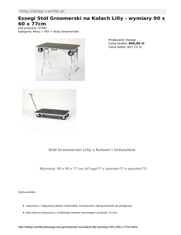 http://sklep.canifel.pl Essegi Stół Groomerski na Kołach Lilly - wymiary 90 x 60 x 77cm kod produktu: 57091 kategoria: Menu > PSY > Stoły Groomerskie Producent: Essegi Cena brutto: 809,00 zł Cena netto: 657,72 zł Stół Groomerski Lilly z Kołami i Uchwytem Wymiary: 90 x 60 x 77 cm (d?ugo?? x szeroko?? x wysoko??) Cechy produktu: wykonany z najwyższej jakości materiałów, funkcjonalny stół groomerski do pielęgnacji blat roboczy wykonany z chilijskiego drewna sosnowego o grubości 15 mm http://sklep.canifel.pl/essegi-stol-groomerski-na-kolach-lilly-wymiary-90-x-60-x-77cm.html blat pokryty gumową powierzchnią antypoślizgową o grubości 4 mm krawędź blatu wykończona aluminiowym profilem nogi wykonane z chromowanej stali o średnicy 22 mm i grubości 1,2 mm dwa solidne wsporniki nogi posiadają ochronne zakończenia z tworzywa sztucznego 4 gumowe koła o średnicy 10 cm - dwa stałe i dwa obrotowe mocny dyszel do ciągnięcia i kierowania wózkiem praktyczny i szybki system składania stołu produkowany w Europie waga 16 kg Zaprojektowany tak by zapewni? bezpiecze?stwo i komfort u?ytkowania. Stó? jest stabilny, rozk?ada si? bardzo ?atwo i szybko, czynno?? ta nie wymaga u?ycia narz?dzi i mo?e by? wykonana przez ka?dego. Stó? jednocze?nie s?u?y jako wózek do transportu klatki z pupilem czy baga?u na wystawach. http://sklep.canifel.pl/essegi-stol-groomerski-na-kolach-lilly-wymiary-90-x-60-x-77cm.html