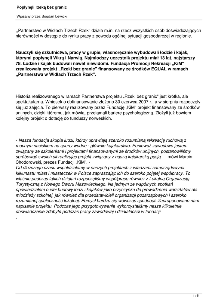 Popłynęli rzeką bez granic Wpisany przez Bogdan Lewicki ,,Partnerstwo w Widłach Trzech Rzek'' działa m.in. na rzecz wszystkich osób doświadczających nierówności w dostępie do rynku pracy z powodu ogólnej sytuacji gospodarczej w regionie. Nauczyli się szkutnictwa, pracy w grupie, własnoręcznie wybudowali łodzie i kajak, którymi popłynęli Wkrą i Narwią. Najmłodszy uczestnik projektu miał 13 lat, najstarszy 78. Łodzie i kajak budowali nawet niewidomi. Fundacja Promocji Rekreacji „KiM" zrealizowała projekt „Rzeki bez granic" finansowany ze środków EQUAL w ramach ,,Partnerstwa w Widłach Trzech Rzek''. Historia realizowanego w ramach Partnerstwa projektu „Rzeki bez granic" jest krótka, ale spektakularna. Wniosek o dofinansowanie złożono 30 czerwca 2007 r., a w sierpniu rozpoczęły się już zajęcia. To pierwszy realizowany przez Fundację „KiM" projekt finansowany ze środków unijnych, dzięki któremu, jak mówią, przełamali barierę psychologiczną. Złożyli już bowiem kolejny projekt o dotację do funduszy norweskich. - Nasza fundacja skupia ludzi, którzy uprawiają szeroko rozumianą rekreację ruchową z mocnym naciskiem na sporty wodne - głównie kajakarstwo. Ponieważ zawodowo jestem związany ze szkoleniami i projektami finansowanymi ze środków unijnych, postanowiliśmy spróbować swoich sił realizując projekt związany z naszą kajakarską pasją - mówi Marcin Chodorowski, prezes Fundacji „KiM". Od dłuższego czasu współdziałamy w naszych projektach z władzami samorządowymi kilkunastu miast i miasteczek w Polsce zapraszając ich do szeroko pojętej współpracy. To właśnie podczas takich działań rozpoczęliśmy współpracę również z Lokalną Organizacją Turystyczną z Nowego Dworu Mazowieckiego. Na jednym ze wspólnych spotkań opowiedziałem o idei budowy łodzi i kajaków jako przyczynku do prowadzenia warsztatów dla młodzieży szkolnej, jak również dla przedstawicieli organizacji pozarządowych i szeroko rozumianej społeczność lokalnej. Pomysł bardzo się wówczas spodobał. Zaproponowano nam napisanie projektu. Podczas jego przygotowywania wykorzystaliśmy nasze kilkuletnie doświadczenie zdobyte podczas pracy zawodowej i działalności w fundacji . 1/5 Popłynęli rzeką bez granic Wpisany przez Bogdan Lewicki Kto chętny do budowy? Projekt „Rzeki bez granic" zaadresowano do mieszkańców regionu - Nowego Dworu Mazowieckiego, gmin: Pomiechówek i Zakroczym oraz członków organizacji pozarządowych działających na terenie działania ,,Partnerstwa w Widłach Trzech Rzek''. Do udziału zaproszono osoby gotowe zaangażować się w budowę, wodowanie i spływ rzeką wykonanymi przez siebie łodziami. Partnerami projektu są Lokalna Organizacja Turystyczna Trzech Rzek oraz Hufiec Związku Harcerstwa Polskiego w Nowym Dworze Mazowieckim (na czas projektu nieodpłatnie udostępnił magazyny, w których trwały warsztaty i budowa łodzi) a udział w projekcie wzięły też Wodne Ochotnicze Pogotowie Ratunkowe, Polski Związek Niewidomych, Polski Związek Emerytów Rencistów i Inwalidów, Towarzystwo Przyjaciół Dzieci, Stowarzyszenie Monar, Dom Pomocy „Wzajemnie potrzebni". - Zaproszenie do udziału w projekcie skierowaliśmy również do mieszkańców Nowego Dworu Mazowieckiego i gmin Pomiechówek i Zakroczym. Przewidywaliśmy udział 24 uczestników. Warsztaty szkutnicze ukończyły 33 osoby. Bardzo ucieszyliśmy się, gdy poznaliśmy uczestników warsztatów. Reprezentowali różne środowiska w pełnym przekroju wiekowym. Najmłodszy uczestnik miał 13 lat a najstarszy 78 lat. Łodzie i kajak grenlandzki budowali również niewidomi i inwalidzi - kontynuuje Marcin Chodorowski. Łódź i asertywność? Budowa drewnianych łódek to podstawowy, najbardziej spektakularny i wymierny cel projektu, ale oczywiście nie jedyny. Drewno jako budulec zostało wybrane celowo - to wdzięczny i piękny naturalny materiał, prosty w ręcznej obróbce. Budując z drewna uczestnicy uczyli się dokładności pomiaru, precyzji cięcia i klejenia, cierpliwości w wygładzaniu i lakierowaniu elementów. - Kontakt z drewnem pobudza wyobraźnię i uwrażliwia zmysły, a równocześnie 2/5 Popłynęli rzeką bez granic Wpisany przez Bogdan Lewicki sprzyja współpracy - mówi Chodorowski. Po wybudowaniu łodzi (wszyscy uczestniczyli w każdym z etapów budowy) zaplanowano ich wodowanie, a całość zwieńczył wspólny spływ wszystkich uczestników i prezentacja zbudowanych łodzi. - O projekcie dowiedziałem się przypadkowo z lokalnej ,,Gazety Nowodworskiej". Byłem bardzo ciekawy, jak takie przedsięwzięcia będą realizowane w Polsce, ponieważ uczestniczyłem w podobnych projektach za granicą - budowaliśmy tam karuzelę. Oczywiście bardzo ciekawiło mnie, jak konstruuje się łódź. Mogłem też sprawdzić się w pracach, których dotychczas nigdy nie wykonywałem. Bardzo lubię atmosferę spokoju i sensownej pracy ukierunkowanej na uzyskanie odpowiedniego efektu - mówi Wojciech Gałczyński, mieszkaniec Nowego Dworu Mazowieckiego. Integralnym elementem warsztatu szkutniczego były zajęcia dotyczące niezbędnej wiedzy z zakresu bezpieczeństwa na wodzie oraz rozsądnego uprawiania sportów wodnych; poznanie technik przydatnych w kajakarstwie oraz zasad udzielania pierwszej pomocy poszkodowanym. Równie ważnym celem projektu jest realizacja programu edukacyjnego z zakresu umiejętności psychospołecznych. W ciągu pięciu dni każdy uczestnik budując łódź, budował również swoją pozycję w grupie i relacje z pozostałymi osobami. Zbudowanie łodzi wymaga wzajemnego zaufania, pokonania trudności, czyli zbudowania przyjaznych i konstruktywnych więzi. Z przypadkowych osób na początku tworzy się później zespół. - Uczestnikom towarzyszył trener, który tworzył warunki umożliwiające wzmocnienie takich umiejętności, jak efektywna komunikacja, wzmacnianie i realizacja celów osobistych, kreaty