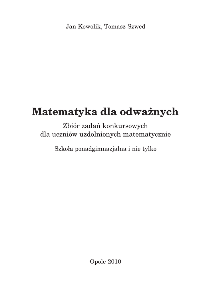 Jan Kowolik, Tomasz Szwed Matematyka dla odwa¿nych Zbiór zadañ konkursowych dla uczniów uzdolnionych matematycznie Szko³a ponadgimnazjalna i nie tylko Opole 2010 1 Spis treœci Wstêp .....................................................................................................5 Rozdzia³ I. W³asnoœci liczb. Funkcje......................................................7 Rozdzia³ II. Nierównoœci algebraiczne. Zastosowanie œrednich .........33 Rozdzia³ III. Wielomiany .....................................................................44 Rozdzia³ IV. Równania i uk³ady równañ .............................................57 Rozdzia³ V. Ci¹gi liczbowe ...................................................................73 Rozdzia³ VI. Planimetria .....................................................................79 Rozdzia³ VII. Trygonometria w zastosowaniach...............................103 Rozdzia³ VIII. Zadania z Ma³ej Olimpiady Matematycznej .............110 Odpowiedzi.........................................................................................116 3 Wstêp Niniejszy zbiór zadañ jest przeznaczony przede wszystkim do pracy na ko³ach matematycznych dla uczniów szkó³ gimnazjalnych i ponadgimnazjalnych o uzdolnieniach matematycznych. Opracowanie to pozwala uczniom zapoznaæ siê z ró¿nymi rodzajami oraz stopniem trudnoœci zadañ matematycznych wystêpuj¹cych w konkursach matematycznych oraz w rejonowych etapach olimpiad matematycznych. Jest to jednoczeœnie materia³ do samodzielnej pracy i stanowi podstawê do przygotowania uczniów do konkursów matematycznych. W zbiorze umieszczone s¹ tak¿e zadania, które w ci¹gu ostatniego piêciolecia obowi¹zywa³y na naszej opolskiej, lokalnej tzw. Ma³ej Olimpiadzie Matematycznej. Nie jest to jednak typowy zbiór zadañ zwi¹zany tematycznie z aktualnym programem nauczania matematyki w zakresie rozszerzonym. W zbiorze Czytelnik znajdzie oryginalne jak i typowe zadania matematyczne o treœci znanej z wczeœniejszych opracowañ. Zadania pogrupowane zosta³y w kilku rozdzia³ach, które zwi¹zane s¹ z tradycyjnymi szkolnymi zadaniami matematycznymi. Staraliœmy siê, aby ka¿de zadanie trafi³o do danego rozdzia³u nieprzypadkowo. Jednoczeœnie zdajemy sobie sprawê z tego, ¿e umieszczenie jakiegoœ zadania w tym, a nie innym rozdziale mo¿e budziæ kontrowersje. W zbiorze tym brakuje zadañ ze stereometrii, kombinatoryki, teorii przekszta³ceñ oraz rachunku prawdopodobieñstwa. Wiêkszoœæ zadañ podanych jest z rozwi¹zaniami. Rozwi¹zania zawieraj¹ czêsto skróty myœlowe, które mamy nadziejê, oka¿¹ siê doœæ ³atwe do zrozumienia. Na koñcu ka¿dego rozdzia³u umieszczone s¹ zadania do samodzielnego rozwi¹zywania, które mo¿na traktowaæ jako materia³ treningowy. Niektóre z tych zadañ zawieraj¹ odpowiedzi lub pewne wskazówki. Zachêcamy do ich samodzielnego rozwi¹zywania. Odpowiedzi najlepiej wykorzystaæ do sprawdzenia poprawnoœci swego rozumowania b¹dŸ do porównania z metod¹ rozwi¹zywania przedstawion¹ w zbiorze. 5 Wiêkszoœæ podanych w tym zbiorze rozwi¹zañ zadañ opartych jest na rozwi¹zaniach wystêpuj¹cych w literaturze matematycznej. Ale s¹ te¿ rozwi¹zania oparte na metodach i pomys³ach przedstawionych przez uczniów na zajêciach ko³a matematycznego prowadzonego przez ponad 30 lat w tzw. klasach uniwersyteckich przy I Liceum Ogólnokszta³c¹cym im. Miko³aja Kopernika w Opolu. Mamy nadziejê, ¿e oddany w rêce Czytelników zbiór zadañ stanie siê swego rodzaju podrêcznikiem samokszta³ceniowym dla uczniów i ich nauczycieli. Liczymy równie¿, ¿e chocia¿ w niewielkim stopniu przyczyni siê do rozwoju uzdolnieñ matematycznych uczniów. Rozwi¹zywanie zadañ konkursowych jest sztuk¹. Wymaga talentu i ciê¿kiej pracy uczniów i ich opiekunów. Potrzebne s¹ równie¿ narzêdzia matematyczne, których, jak mniemamy, dostarczy nasza publikacja. W ostatnim rozdziale podane zosta³y zestawy zadañ z etapów szkolnych i wojewódzkich z XL i XLI Ma³ej Olimpiady Matematycznej. W przypadku zadañ typowo rachunkowych podane s¹ do nich odpowiedzi. Autorzy 6 Rozdzia³ I W£ASNOŒCI LICZB. FUNKCJE Zadanie. 1.1. Wiedz¹c, ¿e a < b < c < d ustawiæ w porz¹dku rosn¹cym liczby: x = ( a + b)(c + d), y = ( a + c )(b + d), z = ( a + d)(b + c ). Rozwi¹zanie y - x = ab + cd - ac - bd = (a - d)(b - c ) > 0, z - y = ac + bd - ad - bc = (a - b)(c - d) > 0. W takim razie y - x > 0 i z - y > 0, wiêc x < y i y < z. Zatem x < y < z. Zadanie. 1.2. Która z liczb: log 2 11 czy log 12 jest wiêksza? Rozwi¹zanie log 11 = log (10 × 1, 1) = log 10 + log 1,1 = 1 + log 1, 1 . St¹d log 2 11 = (1 + log 1, 1 )2 = 1 + 2 log 1, 1 + log 2 1, 1 > > 1 + 2 log 1, 1 = 1 + log 1, 12 = 1 + log 1, 21 = = log 10 + log 1, 21 = log 12, 1 > log 12. Zatem log 2 11 > log 12 . Zadanie. 1.3. ZnaleŸæ tak¹ najmniejsz¹ liczbê naturaln¹ n, aby liczby n + 1 oraz n - 50 by³y kwadratami liczb naturalnych. Rozwi¹zanie Niech k i l bêd¹ liczbami naturalnymi takimi, ¿e n + 1 = k2 i n - 50 = l 2 . St¹d k2 - l 2 = 51 czyli (k - l )(k + l ) = 51. Jedynymi rozwi¹zaniami tego równania w zbiorze N s¹ pary liczb (10, 7 ) i (26, 25) . W takim razie najmniejsz¹ liczb¹ naturaln¹ spe³niaj¹c¹ warunki zadania jest n = 99. 7 Zadanie. 1.4. Wykazaæ, ¿e jeœli c Î C i x = c + c2 + 4 , 2 to x - 1 Î C. x Rozwi¹zanie 2 (x - 1 )(x + 1 ) . x - 1 = x -1 = x x x Mamy: x -1 = c + c2 + 4 c + c2 + 4 - 2 . -1 = 2 2 x +1 = Zatem x-1 = x = (c+ c2 + 4 - 2 ) (c+ c2 + 4 + 2 ) × 2 2 c+ c2 + 4 2 = (c + c2 + 4 )2 - 4 2 × = 4 c + c2 + 4 = W zwi¹zku z tym c + c2 + 4 + 2 . 2 2 c2 + 2 c c2 + 4 2 (c + c2 + 4 ) = c. x - 1 Î C. x Zadanie. 1.5. Wykazaæ, ¿e dla a Î R a8 + a2 + 1 > a5 + a . Rozwi¹zanie Dla a < 0 lewa strona nierównoœci jest dodatnia, zaœ prawa strona ujemna, a wiêc L > P. Dla a = 0 nierównoœæ jest prawdziwa. Dla a Î (0, 1 ) poniewa¿ a2 > a5 , wiêc a8 + (a2 - a5 ) + (1 - a) > 0. Podob