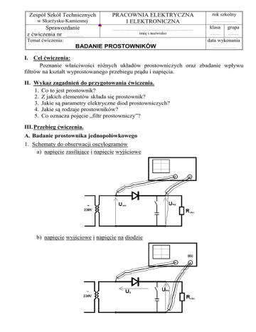 Zespół Szkół Technicznych w Skarżysku-Kamiennej Sprawozdanie z ćwiczenia nr …………… PRACOWNIA ELEKTRYCZNA I ELEKTRONICZNA ……………………………………………………… imię i nazwisko Temat ćwiczenia: rok szkolny ………………… klasa grupa ……… ……… data wykonania BADANIE PROSTOWNIKÓW ………………… I. Cel ćwiczenia: Poznanie właściwości różnych układów prostowniczych oraz zbadanie wpływu filtrów na kształt wyprostowanego przebiegu prądu i napięcia. II. Wykaz zagadnień do przygotowania ćwiczenia. 1. Co to jest prostownik? 2. Z jakich elementów składa się prostownik? 3. Jakie są parametry elektryczne diod prostowniczych? 4. Jakie są rodzaje prostowników? 5. Co oznacza pojęcie „filtr prostowniczy”? III. Przebieg ćwiczenia. A. Badanie prostownika jednopołówkowego 1. Schematy do obserwacji oscylogramów a) napięcie zasilające i napięcie wyjściowe b) napięcie wyjściowe i napięcie na diodzie Badanie prostowników c) prąd obciążenia i prąd przewodzenia diody. 2. Oscylogramy Strona 2 z 5 Badanie prostowników Strona 3 z 5 B. Badanie prostownika dwupołówkowego (układ Graetza). 3. Schemat do obserwacji oscylogramów napięcia zasilającego i napięcia wyjściowego. Ponieważ masa oscyloskopu może powodować zwarcie wyjścia i wejścia prostownika , najpierw dokonać obserwacji napięcia wejściowego prostownika (przy odłączonym od wyjścia prostownika przewodzie masowym sondy pomiarowej), a następnie napięcia wyjściowego prostownika (po wcześniejszym odłączeniu przewodu masowego sondy od wejścia prostownika). 4. Oscylogramy. Badanie prostowników Strona 4 z 5 C. Wyznaczanie zależności napięcia wyjściowego od rezystancji obciążenia 1. Schemat pomiarowy. Dla danej wartości napięcia zasilającego, regulując rezystancją Robc zmieniać prąd I w granicach od 0,8 In do 0 i odczytywać napięcie wyjściowe. 2. Tabele pomiarów. UWE=……… a) prostownik 1-połówkowy mA I Robc UWY V b) prostownik 1-połówkowy z filtrem C=……… mA I Robc UWY V c) prostownik 2-połówkowy mA I Robc UWY V d) prostownik 2-połówkowy z filtrem C=……… mA I Robc UWY V 3. Narysować zależność napięcia wyjściowego od rezystancji obciążenia dla prostownika 1-połówkowego oraz prostownika 2-połówkowego Badanie prostowników Strona 5 z 5 IV. Wykaz przyrządów. 1. Oscyloskop ……… 2. Transformator …… 3. 4. … V. Wykaz zagadnień do opracowania ćwiczenia. 1. Jak wpływa dołączenie/zwiększenie pojemności kondensatora na wartość napięcia wyjściowego? 2. Od czego zależy wartość napięcia wstecznego na diodzie prostownika? 3. Od czego zależy maksymalna wartość prądu przepływającego przez diodę prostownika? 4. Jak wpływa zmniejszenie rezystancji obciążenia na prąd i napięcie wyjściowe? 5. Na jakie parametry należy zwracać uwagę przy doborze diod i kondensatorów do układów prostowniczych? VI. Spostrzeżenia i wnioski: