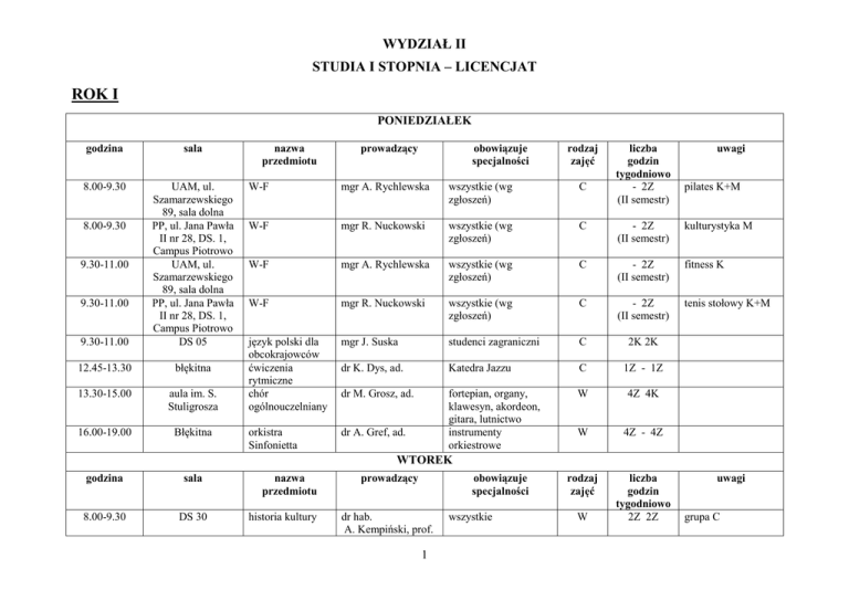 WYDZIAŁ II STUDIA I STOPNIA – LICENCJAT ROK I PONIEDZIAŁEK godzina sala 8.00-9.30 9.30-11.00 UAM, ul. Szamarzewskiego 89, sala dolna PP, ul. Jana Pawła II nr 28, DS. 1, Campus Piotrowo UAM, ul. Szamarzewskiego 89, sala dolna PP, ul. Jana Pawła II nr 28, DS. 1, Campus Piotrowo DS 05 12.45-13.30 błękitna 13.30-15.00 aula im. S. Stuligrosza 16.00-19.00 Błękitna 8.00-9.30 9.30-11.00 9.30-11.00 nazwa przedmiotu prowadzący obowiązuje specjalności rodzaj zajęć liczba godzin tygodniowo - 2Z (II semestr) uwagi W-F mgr A. Rychlewska wszystkie (wg zgłoszeń) C pilates K+M W-F mgr R. Nuckowski wszystkie (wg zgłoszeń) C - 2Z (II semestr) kulturystyka M W-F mgr A. Rychlewska wszystkie (wg zgłoszeń) C - 2Z (II semestr) fitness K W-F mgr R. Nuckowski wszystkie (wg zgłoszeń) C - 2Z (II semestr) tenis stołowy K+M język polski dla obcokrajowców ćwiczenia rytmiczne chór ogólnouczelniany mgr J. Suska studenci zagraniczni C 2K 2K dr K. Dys, ad. Katedra Jazzu C 1Z - 1Z dr M. Grosz, ad. W 4Z 4K orkistra Sinfonietta dr A. Gref, ad. fortepian, organy, klawesyn, akordeon, gitara, lutnictwo instrumenty orkiestrowe W 4Z - 4Z rodzaj zajęć liczba godzin tygodniowo 2Z 2Z WTOREK godzina sala 8.00-9.30 DS 30 nazwa przedmiotu historia kultury prowadzący obowiązuje specjalności dr hab. A. Kempiński, prof. 1 wszystkie W uwagi grupa C 8.00-9.30 DS 17 język niemiecki 9.30-11.00 DS 18 język angielski 9.30-11.00 DS 19 język angielski 9.30-11.00 DS 17 język niemiecki 11.00-12.30 DS 5 11.00-12.30 DS 18 język polski dla obcokrajowców język angielski 11.00-12.30 DS 19 język angielski 12.30-14.00 DS 18 język angielski 12.30-14.00 DS 05 15.15 – 17.30 Błękitna język polski dla obcokrajowców orkiestra barokowa AM mgr D. Żukowska, st. wykł. mgr I. Elbanowska, st. wykł. mgr M. Marcinkowska, st. wykł. mgr D. Żukowska, st. wykł. mgr J. Suska wszystkie C 2K 2K grupa n2 wszystkie C 2K 2K grupa a1 wszystkie C 2K 2K grupa a4 wszystkie C 2K 2K grupa n1 studenci zagraniczni C 2K 2K mgr I. Elbanowska, st. wykł. mgr M. Marcinkowska, st. wykł. mgr I. Elbanowska, st. wykł. mgr J. Maj wszystkie C 2K 2K grupa a2 wszystkie C 2K 2K grupa a5 wszystkie C 2K 2K grupa a3 studenci zagraniczni C 2K 2K dr J. Thiel Zakład Instr. Historycznych W 3Z 3K rodzaj zajęć grupa D ŚRODA godzina sala nazwa przedmiotu 8.00-9.30 383 kształcenie słuchu 9.30-11.00 383 kształcenie słuchu 8.30-10.00 9.30-11.00 9.30-11.00 211 DS 30 DS 05 11.00-12.30 DS 18 11.00-12.30 13.30-15.30 DS 30 Błękitna kształcenie słuchu historia kultury język polski dla obcokrajowców język polski dla obcokrajowców historia kultury big band obowiązuje specjalności prowadzący dr Ewa FabiańskaJelińska dr Ewa FabiańskaJelińska dr J. Zieleniak dr S. Drajewski mgr J. Suska instrumenty dęte C liczba godzin tygodniowo 2K 2E instrumenty dęte C 2K 2E grupa E jazz, perkusja wszystkie studenci zagraniczni C W C 2K 2E 2Z 2Z 2K 2K grupa B grupa A mgr J. Maj studenci zagraniczni C 2K 2K dr S. Drajewski dr P. Piłasiewicz, ad. wszystkie Katedra Jazzu oprócz W C 2Z 2Z 4Z 4K 2 uwagi grupa B 14.00-15.30 351 15.30-17.00 16.00-17.30 351 158 17.30-19.00 158 18.00-19.30 XII LO, ul. Kutrzeby 8 (przy WSNHiD) godzina sala 9.15-10.45 9.30-11.00 POSiR Oddział Chwiałka, ul. Chwiałkowskiego 34 DS 05 11.00-11.45 Prezydencka 11.00-11.45 Prezydencka 11.45-13.15 12.00-13.30 instrumentoznaws two z podstawami instrumentacji Harmonia Analiza dzieła muzycznego Analiza dzieła muzycznego W-F dr hab. W. Olszewski nazwa przedmiotu prowadzący pianistów, aranżerów i wokalistów kompozycja z aranżacją W 2Z - 2E dr hab. W. Olszewski mgr A. Domurat, as. jazz fortepian C C 2K - 2E 2Z – 2E mgr A. Domurat, as. instrumenty historyczne wszystkie (według zgłoszeń) C 2Z – 2E C - 2Z (semestr II) rodzaj zajęć liczba godzin tygodniowo - 1Z (semestr II) mgr R. Nuckowski piłka nożna CZWARTEK obowiązuje specjalności W-F mgr A. Rychlewska, mgr R. Nuckowski wszystkie (według zgłoszeń) C język polski dla obcokrajowców prawo autorskie i prawa pokrewne prawo autorskie i prawa pokrewne mgr J. Suska studenci zagraniczni C 2K 2K dr B. Kleban / mgr M. Barański dr B. Kleban / mgr M. Barański organy i Katedra Jazzu W W 211 362 kształcenie słuchu kształcenie słuchu 15.00-16.30 aula im. S. Stuligrosza chór ogólnouczelniany dr J. Zieleniak dr A. ZdrojekSuchodolska, ad. dr M. Grosz, ad. 16.00-17.30 158 mgr A. Domurat, as. wydz. V i II (oprócz organów i Katedry Jazzu) jazz, perkusja fortepian, organy, akordeon, klawesyn fortepian, organy, klawesyn, akordeon, gitara, lutnictwo instrumenty dęte, gr. I 1E (semestr I) - 1E (semestr II) 17.30-19.00 158 mgr A. Domurat, as. instrumenty dęte, gr. II Analiza dzieła muzycznego Analiza dzieła muzycznego PIĄTEK 3 C C 2K 2E 2K 2E W 4Z 4K C 2Z – 2E C 2Z – 2E uwagi pływanie K+M grupa C godzina sala 9.30-11.00 DS 18 9.30-11.00 DS 19 16.00-18.00 Błękitna nazwa przedmiotu język polski dla obcokrajowców język polski dla obcokrajowców big band prowadzący obowiązuje specjalności rodzaj zajęć mgr J. Maj studenci zagraniczni C liczba godzin tygodniowo 2K 2K uwagi mgr J. Suska studenci zagraniczni C 2K 2K dr P. Piłasiewicz, ad. Katedra Jazzu oprócz pianistów, aranżerów i wokalistów C 4Z 4K rodzaj zajęć grupa C ROK II PONIEDZIAŁEK godzina sala nazwa przedmiotu 8.00-9.30 DS 30 historia kultury 8.00-9.30 9.30-11.00 DS 19 DS 17 język angielski język niemiecki 9.30-11.00 DS 18 język angielski 9.30-11.00 11.00-12.30 DS 19 DS 5 11.00-12.30 DS 18 język angielski język polski dla obcokrajowców język angielski 11.00-12.30 DS 17 język niemiecki 11.00-12.30 12.30-14.00 DS 19 DS 5 13.30-14.15 błękitna 13.30-15.00 aula im. S. Stuligrosza język angielski język polski dla obcokrajowców ćwiczenia rytmiczne chór ogólnouczelniany prowadzący obowiązuje specjalności dr hab. A. Kempiński, prof. AM mgr E. Fójcik mgr D. Żukowska, st. wykł. mgr I. Elbanowska, st. wykł. mgr E. Fójcik mgr J. Suska wszys