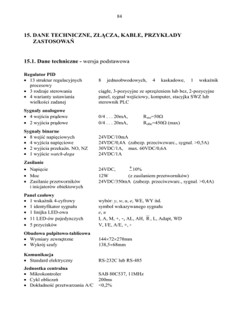 84 15. DANE TECHNICZNE, ZŁĄCZA, KABLE, PRZYKŁADY ZASTOSOWAŃ 15.1. Dane techniczne - wersja podstawowa Regulator PID • 13 struktur regulacyjnych procesowy • 3 rodzaje sterowania • 4 warianty ustawiania wielkości zadanej ciągłe, 3-pozycyjne ze sprzężeniem lub bez, 2-pozycyjne panel, sygnał wejściowy, komputer, stacyjka SWZ lub sterownik PLC Sygnały analogowe • 4 wejścia prądowe • 2 wyjścia prądowe 0/4 . . . 20mA, 0/4 . . . 20mA, Sygnały binarne • 8 wejść napięciowych • 4 wyjścia napięciowe • 2 wyjścia przekaźn. NO, NZ • 1 wyjście watch-doga 24VDC/10mA 24VDC/0,4A (zabezp. przeciwzwarc., sygnal. >0,5A) 30VDC/1A, max. 60VDC/0,6A 24VDC/1A Zasilanie • Napięcie • Moc • Zasilanie przetworników i inicjatorów obiektowych 8 jednoobwodowych, 4 kaskadowe, 1 wskaźnik Rwe=50Ω Robc=450Ω (max) + 10% 24VDC, − 12W (z zasilaniem przetworników) 24VDC/350mA (zabezp. przeciwzwarc., sygnal. >0,4A) Panel czołowy • 1 wskaźnik 4-cyfrowy • 1 identyfikator sygnału • 1 linijka LED-owa • 11 LED-ów pojedynczych • 5 przycisków wybór: y, w, u, e, WE, WY itd. symbol wskazywanego sygnału e, u I, A, M, +, -, AL, AH, R , L, Adapt, WD V, I/E, A/E, +, - Obudowa pulpitowo-tablicowa • Wymiary zewnętrzne • Wykrój szafy 144×72×270mm 138,5×68mm Komunikacja • Standard elektryczny RS-232C lub RS-485 Jednostka centralna • Mikrokontroler SAB 80C537, 11MHz • Cykl obliczeń 200ms • Dokładność przetwarzania A/C <0,2% 85 Złącza obiektowe • A - analogowe Cannon 881025, kabel KRF-25-00 • B - binarne ” 881037, ” KRF-37-00 • K - komunikacyjne ” 881009, ” KRF-09-00 • Stopień ochrony złącz/obudowy IP 20/30 Dane ogólne • Temperatura pracy • Temperatura przechowywania i transportu • Wilgotność • Położenie pracy • Waga 0 0 . . .55 C 0 -25 . . .75 C 40 . . .80% dowolne ok. 2kg 86 15.2 Złącza obiektowe A - sygnały analogowe Zasilanie B - sygnały binarne K- komunikacja Rys.12.1. Złącza obiektowe, zasilania i komunikacyjne 87 15.3. Połączenia kablowe Typowe połączenia regulatora RF-537 pokazano na rys.12.2 (zwykle wejścia binarne są zasilane za pośrednictwem RF-537). Symbole a1 ... a13 i b1 ... b37 znajdują się na kostkach identyfikujących przewody w kablach doprowadzonych do złącz A i B (rys.12.1). Numery odpowiadają numerom końcówek złącz, tj. np. b3 oznacza końcówkę 3 w złączu B. Kable są na wyposażeniu regulatora (długość 2,5m). Rys.12.2. Połączenia kablowe Zaciski „-” wszystkich wejść analogowych AI, także niewykorzystanych, poinny być zwarte z masą GND_A (a1, a3). 15.4. Przykłady zastosowań Podane przykłady dotyczą najczęstszych zastosowań, tzn. wielkość zadana jest ustawiana z panelu, nie wykorzystuje się wejść ani wyjść binarnych (oprócz B05, B06), nie jest uwzględniana komunikacja. Wzięto natomiast pod uwagę zasilanie przetworników 88 wejściowych - 220V~, 24=, przetworniki 2-przewodowe - oraz rodzaj sterowania - ciągłe, 3pozycyjne ze sprzężeniem lub bez, 2-pozycyjne. Konfiguracja. Regulatory RF-537 są dostarczane w konfiguracji fabrycznej PRST (default), czyli do regulacji stałowartościowej FSP, sterowania ciągłego CONT, z zakresami 0 ... 20mA dla wejść i wyjść binarnych. Obok schematów podano tylko te przełączniki konfiguracyjne, które należy zmienić (zwykle rodzaj sterowania i zakres). Inne układy niż podany w przykładzie można uzyskać po przestawieniu przełącznika STR. Przyjęto, że regulator ma realizować algorytm z całkowaniem. W przeciwnym razie trzeba zmienić ustawienie PIP. Parametry należy dobrać stosownie do konkretnych wymagań. 1. Regulacja jednoobwodowa - sterowanie ciągłe1) • Przetwornik y - 220V~, 0...20mA • Wyjście u - 0...20mA • Konfiguracja - fabryczna (regulacja stałowartościowa, STR=FSP) • Inne układy - STR=2SP, DSP, DDC, RDN (duże wielkości zadane, zależne wielkości zadane, bezpośrednie sterowanie cyfrowe, regulator redundancyjny) • AI2,AI3, AI4 zwarte z masą 2. Regulacja jednoobwodowa -sterowanie 3-pozycyjne ze sprzężeniem • Przetwornik y - 2-przewodowy, 4...20mA • Przetwornik uT - 24V=, 4...20mA • Zestyki +, − - 30V=/1A (w regulatorze) • Konfiguracja - OUT=3POS AI1R=4-20 AI4R=4-20 1) Realizowane przez siłownik pneumatyczny (za pośrednictwem przetwornika I/P) lub przez falownik. 89 (STR=FSP) • Inne układy - STR=2SP, DSP, DDC, RDN • AI2, AI3 zwarte z masą (p.1) 3. Regulacja jednoobwodowa - sterowanie 2-pozycyjne1) • Przetwornik y - 24V=, 0...20mA • Zestyk + - 30V=/1A • Konfiguracja - OUT=2POS • Inne układy (STR=FSP) - STR=2SP, DSP, DDC, RDN • AI2, AI3, AI4 zwarte z masą (p.1) 1) Jednokierunkowe, np. tylko grzanie