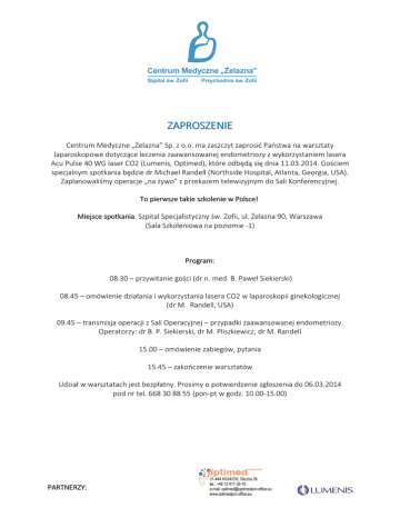ZAPROSZENIE Centrum Medyczne „Żelazna” Sp. z o.o. ma zaszczyt zaprosić Państwa na warsztaty laparoskopowe dotyczące leczenia zaawansowanej endometriozy z wykorzystaniem lasera Acu Pulse 40 WG laser CO2 (Lumenis, Optimed), które odbędą się dnia 11.03.2014. Gościem specjalnym spotkania będzie dr Michael Randell (Northside Hospital, Atlanta, Georgia, USA). Zaplanowaliśmy operacje „na żywo” z przekazem telewizyjnym do Sali Konferencyjnej. To pierwsze takie szkolenie w Polsce! Miejsce spotkania: Szpital Specjalistyczny św. Zofii, ul. Żelazna 90, Warszawa (Sala Szkoleniowa na poziomie -1) Program: 08.30 – przywitanie gości (dr n. med. B. Paweł Siekierski) 08.45 – omówienie działania i wykorzystania lasera CO2 w laparoskopii ginekologicznej (dr M. Randell, USA) 09.45 – transmisja operacji z Sali Operacyjnej – przypadki zaawansowanej endometriozy. Operatorzy: dr B. P. Siekierski, dr M. Pliszkiewicz, dr M. Randell 15.00 – omówienie zabiegów, pytania 15.45 – zakończenie warsztatów Udział w warsztatach jest bezpłatny. Prosimy o potwierdzenie zgłoszenia do 06.03.2014 pod nr tel. 668 30 88 55 (pon-pt w godz. 10.00-15.00) PARTNERZY: