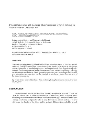 Dynamic tendencies and medicinal plants’ resources of forest complex in Górzno-Lidzbark Landscape Park Iwona Paszek*, Tomasz Załuski, Dorota Gawenda-Kempczyńska, Iwona Łazowy-Szczepanowska Department of Biology and Pharmaceutical Botany Ludwik Rydygier Collegium Medicum in Bydgoszcz Nicolaus Copernicus University in Toruń M. Skłodowskiej-Curie 9 85-094 Bydgoszcz, Poland *corresponding author: phone: +4852 5853802; fax: +4852 5853807; e-mail: [email protected] Summary This paper presents floristic richness of medicinal plants occurring in Górzno-Lidzbark Landscape Park (NE Poland). More important medicinal species were set out in four habitat groups with profile of population resources and evaluation of their dynamic tendencies included. Furthermore, natural and anthropogenic (forest management) factors effecting increase or decrease in these plants’ population resources were pinpointed. Species with large population resources that may be acquired for medicinal reasons from the area of the Park were selected. Key words: Górzno-Lidzbark Landscape Park, medicinal plants, pharmacopeial plants, forest habitats, life forms INTRODUCTION Górzno-Lidzbark Landscape Park (NE Poland) occupies an area of 27 764 ha. Circa 70% of the area of the Park constitutes a diversified forest complex. In its northern part dominate forests of oak-linden-hornbeam type and in southern part – mixed coniferous and pine forests. In land depressions on rich soils (i.a. in river valleys, on the banks of the lakes and in springs) different types of alder wood- Dynamic tendencies and medicinal plants’ resources of forest complex in Górzno-Lidzbark Landscape Park 31 lands and alder carrs are present on trophically poorer soils – birch bog woodland and pine bog woodland. Among oak-linden-hornbeam and mixed coniferous forests, thermophilous oak forests as enclaves are preserved. On account of typological diversification of the forests as well as different degree of anthropopressure, high floristic diversity of studied forest complex – over 950 species – is observed [1, 2]. Nearly half of them constitute medicinal plants. Material and Methods Initially, a setout of medicinal plants of Górzno-Lidzbark Landscape Park was performed. The plants were selected on the basis of pharmaceutical literature: [3], [4], [5] and [6]. They were divided according to life forms and use in conventional medicine and folk medicine. Their counts were presented in a table. Subsequently more important medicinal species, viz. used mainly in conventional medicine and then typical to studied forest complex species were selected. Population resources and dynamic tendencies were estimated for each group which was possible because of many years’ botanic research in this area. Floristic research was carried out from the middle of the 19th century to the middle of the 20th century [7], whereas floristic and phytosociological research were carried out from 70’s of the 20th century [i.a. 8-13]. Population resources of the species were estimated in three-degree scale: + – low (few/a dozen localities or so, species aggregations usually <100 m2), ++ – medium (a dozen localities or so, when species aggregations >100 m2 or several dozen/a few hundred localities, when species aggregations <100 m2), +++ – high (several dozen/a few hundred localities, species aggregations usually >100 m2). Dynamic tendencies of these species were assessed as follows: ↑ – increase, ↓ – decrease, ↔ – lack of significant changes. The nomenclature of vascular plants taxa is after Mirek et al. [14]. Results and Discussion On account of typological diversification of the forests as well as different degree of anthropopressure, high floristic diversity of studied forest complex is observed. In studied area 448 medicinal species occur in total, comprising 36 trees species, 32 – bushes, 20 – shrubs and 360 – herbs. In conventional medicine 167 and in folk medicine 281 species are used. As many as 38 pharmacopeial species were noted (tab. 1). Some of the medicinal species occur abundandly or frequently, whereas others rarely or sporadically (tab. 2-5). Vol. 55 No 3 2009 I. Paszek, T. Załuski, D. Gawenda-Kempczyńska, I. Łazowy-Szczepanowska 32 Ta b l e 1 . Numbers of medicinal plant species in the researched forest area use conventional medicine life forms Farmakopea VI other sources folk medicine Σ trees 7 13 16 36 bushes 7 13 12 32 shrubs 2 9 9 20 herbs 22 94 244 360 Σ 38 129 281 448 Among species typical to higrophilous deciduous forests the largest population resources are Alnus glutinosa, Frangula alnus, Salix cinerea and Urtica dioica (tab. 2). The majority of plants occurring in these forests does not reveal distinct resources changes. Only Fraxinus excelsior is decreasing its resources which can be related with phenomenon of ‘ash disease’, known in Poland [15]. Whereas Salix cinerea and Urtica dioica are revealing increase in abundance in localities. Salix cinerea is overgrowing in meadows as a consequence of lack of use of the meadows. While spreading of nitrophilous Urtica dioica is related i.a. with natural growth of forest habitats’ trophy and creation of nitrophilous forest edges as a consequense of forest complexes’ fragmentation. Ta b l e 2 . Species preferring higrophilous deciduous forests No. species medicinal material 1. Allium ursinum Allii ursini bulbus, herba 2. Alnus glutinosa Alni folium, cortex 3. Corydalis cava Corydalis bulbus, herba 4. Frangula alnus Frangulae cortex 5. Fraxinus excelsior Fraxini folium, cortex population resources dynamic tendencies ++ ↔ +++ ↔ ++ ↔ +++ ↔ ++ ↓ ++ ↔ 6. Humulus lupulus Lupuli strobilus, Lupulinum 7. Impatiens noli-tangere Impatientis herba + ↔ 8. Ribes nigrum Ribis nigri folium, fructus ++ ↔ 9. Salix aurita Salicis cortex ++ ↔ 10. Salix cinerea Salicis cortex +++ ↑ 11. Salix pentandra Salicis cortex + ↔ 12. Solanum dulcamara Dulcamarae stipes ++ ↔