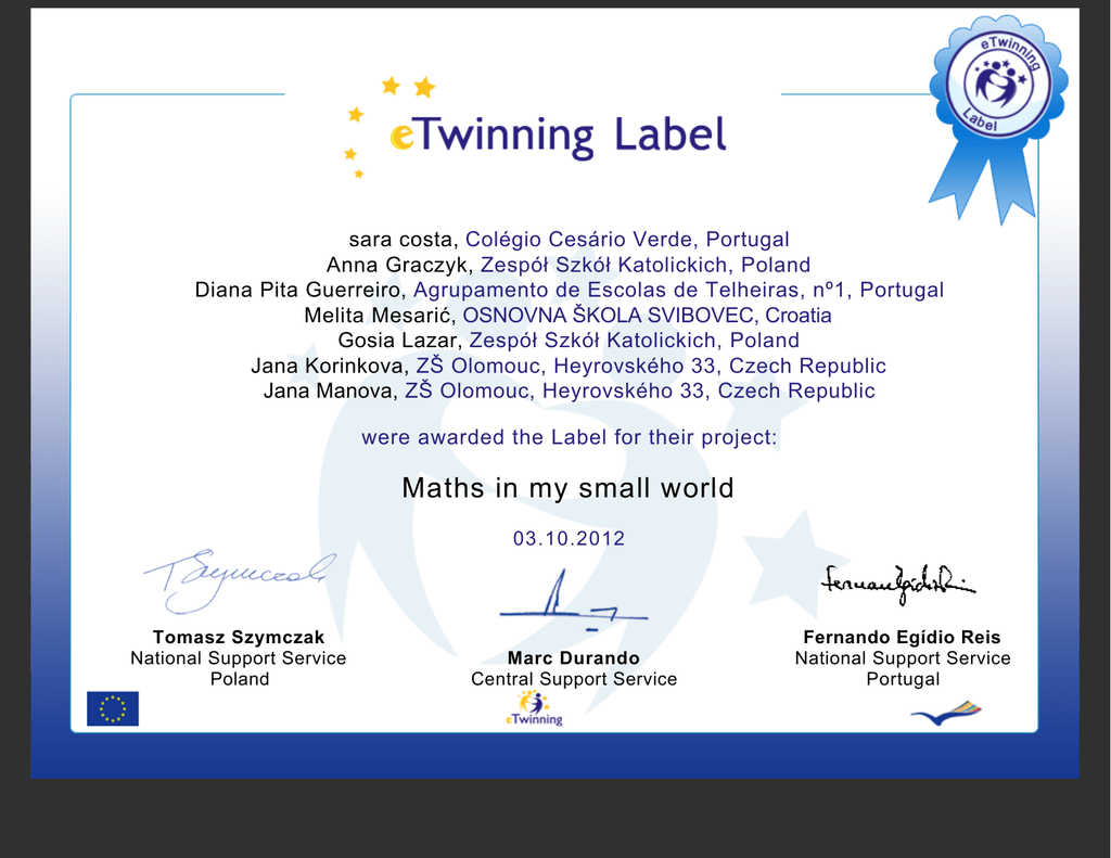 sara costa, Colégio Cesário Verde, Portugal Anna Graczyk, Zespół Szkół Katolickich, Poland Diana Pita Guerreiro, Agrupamento de Escolas de Telheiras, nº1, Portugal Melita Mesarić, OSNOVNA ŠKOLA SVIBOVEC, Croatia Gosia Lazar, Zespół Szkół Katolickich, Poland Jana Korinkova, ZŠ Olomouc, Heyrovského 33, Czech Republic Jana Manova, ZŠ Olomouc, Heyrovského 33, Czech Republic were awarded the Label for their project: Maths in my small world 03.10.2012 Tomasz Szymczak National Support Service Poland Marc Durando Central Support Service Fernando Egídio Reis National Support Service Portugal