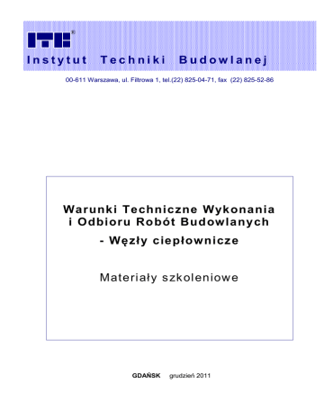 ® Instytut Techniki Budowlanej 00-611 Warszawa, ul. Filtrowa 1, tel.(22) 825-04-71, fax (22) 825-52-86 Warunki Techniczne Wykonania i Odbioru Robót Budowlanych - Węzły ciepłownicze Materiały szkoleniowe GDAŃSK grudzień 2011 mgr inż. Bogdan Kozłowski [email protected] Gdańsk, grudzień 2011r. Warunki Techniczne Wykonania i Odbioru Robót Budowlanych - Węzły Ciepłownicze 1. Wstęp Zgodnie z aktualną wersją art. 7 ustawy Prawo budowlane z 7 lipca 1994r. (tekst jednolity Dz. U nr 156 z 2006r. poz. 1118 z późn. zm.) do przepisów techniczno – budowlanych zalicza się jedynie: Warunki techniczne jakim powinny odpowiadać obiekty budowlane i ich usytuowanie, Warunki techniczne użytkowania obiektów budowlanych. Według obecnie obowiązującego prawa budowlanego wydawane WTWiORB nie są więc przepisami techniczno – budowlanymi, ale wobec braku Polskich Norm z tego zakresu zasadne jest, aby ich zalecenia znalazły się w treści zamówienia i umowy pomiędzy inwestorem i wykonawcą, co nadaje im moc wiążącą w odniesieniu do stron umowy. Prezentowane WTWiORB dotyczą końcowego elementu w systemie dostawy ciepła do zasilania instalacji cieplnych w budynku. Według definicji zawartej w aktach prawnych dotyczących funkcjonowania systemów ciepłowniczych oraz kalkulacji taryf za ciepło, węzeł ciepłowniczy jest zespołem połączonych ze sobą urządzeń lub instalacji służących do zmiany rodzaju lub parametrów nośnika ciepła dostarczanego z przyłącza oraz regulacji ilości ciepła dostarczanego do instalacji odbiorczych. Natomiast przywołana w p. 1.2. „Warunków ...” definicja węzła, pochodząca z PN-B-01430:1990, bardziej szczegółowo określa nieco bardziej szczegółowo określa zadania węzła w procesie zasilania w ciepło instalacji odbiorczych w budynku. Niezależnie od definicji węzeł ciepłowniczy jest ważnym, końcowym ogniwem między źródłem ciepła i odbiorcą, którego zaprojektowanie, wykonanie i eksploatacja ma znaczący wpływ na koszty ciepła dla zasilania budynku. Z tego względu przedmiot określony w p. 1.1. „Warunków ...” obejmuje: wymagania dotyczące dokumentacji projektowej i powykonawczej, wymagania dotyczące wykonawstwa węzłów ciepłowniczych, zasady odbioru węzłów ciepłowniczych. Natomiast zakres ich stosowania określony także w p. 1.1. obejmuje węzły wodne w budynkach mieszkalnych, użyteczności publicznej i zamieszkania zbiorowego zasilanych z nisko i wysokoparametrowych sieci ciepłowniczych. Postanowienia „Warunków ...” można stosować do węzłów wodnych w innych budynkach, wykonywanych przemysłowo tzw. „kompaktowych”, a także węzłów „przyłączeniowych” zasilanych z niskoparametrowych kotłowni indywidualnych, potocznie określanych jako „technologia kotłowni”, spełniających funkcję węzłów ciepłowniczych, których sposób eksploatacji powinien być taki jak w innych budynkach. 2. Dokumentacja techniczna Roboty budowlane powinny być wykonywane na postawie dokumentacji projektowej sporządzonej zgodnie z rozporządzeniem Ministra Infrastruktury z dnia 3 lipca 2003r w sprawie 2 szczegółowego zakresu i formy projektu budowlanego (Dz. U. nr 120 z 2003r poz. 1133 z późn. zm.) oraz opracowywanej indywidualnie specyfikacji technicznej wykonania i odbioru robót. W przypadku umów o realizację obiektów objętych ustawą Prawo zamówień publicznych z 29 stycznia 2004r (Dz. U. nr 19 z 2004r poz. 177 z późn. zm.) szczegółowy zakres i forma dokumentacji projektowej, specyfikacji technicznej wykonania i odbioru robót określone są w rozporządzeniu MI z 2 września 2004r (Dz. U. nr 202 z 2004r poz. 2072 z późn. zm.). Ponieważ te akty prawne obejmują wszystkie rodzaje robót budowlanych, wymagania w zakresie projektowania i robót instalacyjnych mogą nie być wystarczające. Biorąc pod uwagę, że zawartość dokumentacji projektowej jest podstawą właściwego wykonania i odbioru, niniejszy zeszyt WTWIORB dotyczący węzłów ciepłowniczych należy traktować jako pomoc do uszczegółowienia dokumentacji projektowej węzła, którą zgodnie z powyższym rozporządzeniem ustala zamawiający. Z tego względu w „Warunkach ...” szczegółowo określono zakres dokumentacji projektowej, z uwzględnieniem m.in.: podstawowych parametrów cieplnych i hydraulicznych węzła, warunków technicznych wykonania i odbioru w formie opisowej, odniesienia do określonych wydawnictw lub zbioru specyfikacji technicznych, obliczeń cieplno – hydraulicznych i regulacji obiegów, doboru urządzeń, doboru materiałów poszczególnych elementów składowych węzła, rysunków rozmieszczenia urządzeń, sposobu prowadzenia przewodów, rozmieszczenia podpór, parametrów regulacji wstępnej i nastaw elementów regulacyjnych, rozwiązania ochrony antykorozyjnej przewodów i innych urządzeń, rozwiązania izolacji cieplnej przewodów, armatury i innych urządzeń, zestawienia wyrobów, elementów i urządzeń, kopii kart katalogowych lub kart doboru podstawowych elementów i urządzeń zastosowanych w węźle. Uwzględniono także ograniczenie zakresu dokumentacji projektowej przy stosowaniu węzłów prefabrykowanych „kompaktowych”, które jako wyrób mają kompletny projekt techniczny. W części dotyczącej dokumentacji technicznej określono także pożądaną zawartość dokumentacji powykonawczej, która powinna zawierać m.in.: projekt techniczny powykonawczy tj. projekt, którego realizacja została potwierdzona przez kierownika robót i inspektora nadzoru odpowiedzialnych za prawidłowość wykonania, na którym naniesiono wprowadzone w trakcie montażu zmiany i uzupełnienia (może być projekt wyjściowy z naniesionymi zmianami), obliczenia powykonawcze w tym regulacyjne określające nastawy finalne armatury i urządzeń regulacyjnych, dokumentację formalno – prawną dotyczącą elementów i urządzeń użytych do wykonania: dokumenty identyfikujące wyroby