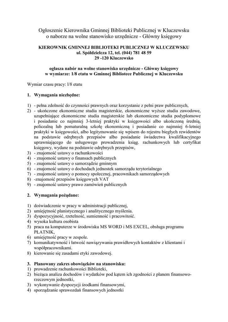 Ogłoszenie Kierownika Gminnej Biblioteki Publicznej w Kluczewsku o naborze na wolne stanowisko urzędnicze - Główny księgowy KIEROWNIK GMINNEJ BIBLIOTEKI PUBLICZNEJ W KLUCZEWSKU ul. Spółdzielcza 12, tel. (044) 781 48 59 29 -120 Kluczewsko ogłasza nabór na wolne stanowisko urzędnicze - Główny księgowy w wymiarze: 1/8 etatu w Gminnej Bibliotece Publicznej w Kluczewsku Wymiar czasu pracy: l/8 etatu 1. Wymagania niezbędne: 1) - pełna zdolność do czynności prawnych oraz korzystanie z pełni praw publicznych, 2) - ukończone ekonomiczne studia magisterskie, ekonomiczne wyższe studia zawodowe, uzupełniające ekonomiczne studia magisterskie lub ekonomiczne studia podyplomowe i posiadanie co najmniej 3-letniej praktyki w księgowości albo ukończoną średnią, policealną lub pomaturalną szkołę ekonomiczną i posiadanie co najmniej 6-letniej praktyki w księgowości, albo legitymowanie się wpisem do rejestru biegłych rewidentów na podstawie odrębnych przepisów albo posiadanie świadectwa kwalifikacyjnego uprawniającego do usługowego prowadzenia ksiąg. rachunkowych lub certyfikat księgowy, wydane na podstawie odrębnych przepisów, 3) - znajomość ustawy o rachunkowości 4) - znajomość ustawy o finansach publicznych 5) - znajomość ustawy o samorządzie gminnym 6) - znajomość ustawy o dochodach jednostek samorządu terytorialnego 7) - znajomość ustawy o pomocy społecznej, pracownikach samorządowych 8) -znajomość przepisów księgowych VAT 9) - znajomość ustawy prawo zamówień publicznych 2. Wymagania pożądane: doświadczenie w pracy w administracji publicznej, umiejętność planistycznego i analitycznego myślenia. dyspozycyjność, rzetelność, sumienność i pracowitość. wysoka kultura osobista praca na komputerze w środowisku MS WORD i MS EXCEL, obsługa programu PŁATNIK, 6) umiejętność pracy w zespole. 7) komunikatywność i łatwość nawiązywania prawidłowych kontaktów z klientami i współpracownikami. 8) kierowanie się zasadami etyki zawodowej. 1) 2) 3) 4) 5) 3. Planowany zakres obowiązków na stanowisku: 1) prowadzenie rachunkowości Biblioteki, 2) bieżąca analiza dochodów i wydatków pod kątem ich zgodności z planem finansoworzeczowym jednostki, 3) wykonywanie dyspozycji środkami finansowymi, 4) sporządzanie sprawozdań finansowych jednostki 5) składanie miesięcznych deklaracji w urzędzie skarbowym, ZUS 4. Wymagane dokumenty i oświadczenia: 1) 2) 3) 4) 5) 6) 7) 8) życiorys (CV) kwestionariusz osobowy, list motywacyjny, dokument poświadczający wykształcenie, świadectwa pracy, oświadczenie o stanie zdrowia, oświadczenie o niekaralności, oświadczenie kandydata o wyrażeniu zgody na przetwarzanie danych osobowych dla celów rekrutacji. 5. Inne dodatkowe dokumenty o posiadanych kwalifikacjach i umiejętnościach: 1) kserokopie innych dokumentów potwierdzających dodatkowe kwalifikacje lub umiejętności. Z wytypowanym kandydatem zawarta zostanie umowa o prace na okres próbny . Przewiduje się możliwość przedłużenia umowy o prace na czas określony, po upływie, którego z kandydatem może zostać zawarta urnowa o prace na czas nieokreślony. Wymagane dokumenty aplikacyjne należy składać osobiście w siedzibie Urzędu Gminy w Kluczewsku przy ul. Spółdzielczej 12 lub przesłać pocztą (decyduje data wpływu w Urzędzie Gminy) z dopiskiem na kopercie: „Konkurs - główny księgowy GBP", w terminie do dnia 03 lipca 2013r. do godz. 15 .00 na adres: Gminna Biblioteka Publiczna w Kluczewsku, ul. Spółdzielcza 12, 29-120 Kluczewsko Dokumenty aplikacyjne, które wpłyną do Gminnej Biblioteki Publicznej po wyżej określonym terminie, nie będą rozpatrywane. Kandydaci zakwalifikowani, zostaną poinformowani o terminie rozmowy kwalifikacyjnej. Informacja o wyniku naboru będzie umieszczona w Biuletynie Informacji Publicznej (na stronie Urzędu Gminy w Kluczewsku ) oraz na tablicy informacyjnej w Urzędzie Gminy w Kluczewsku. Z regulaminem naboru można się zapoznać w siedzibie Urzędu Gminy. Dodatkowe informacje można uzyskać pod numerem telefonu 44 781 42 46 wew. 14 Na wymaganych dokumentach aplikacyjnych (...) kandydat wpisuje klauzule: Wyrażam zgodę na przetwarzanie moich danych osobowych zawartych w ofercie pracy dla potrzeb rekrutacji zgodnie z ustawą z dnia 29 sierpnia 1997 r. o ochronie danych osobowych. Kluczewsko 17.06.2013 Zarządzenie Nr 1 /2013 Kierownika Gminnej Biblioteki Publicznej w Kluczewsku z dnia 17 czerwca 2013 r. w sprawie: powołania komisji rekrutacyjnej do przeprowadzenia naboru na wolne stanowisko głównego księgowego w Gminnej Bibliotece Publicznej w Kluczewsku. Na podstawie art. 33 ustawy. 2 Ustawy z dnia 8 marca 1990 roku o samorządzie gminnym (tekst jednolity Dz. U. z 2001 roku Nr 142, poz.l591 ze zmianami) oraz ustawy z dnia 21 listopada 2008 roku o pracownikach samorządowych ( Dz. U. z 2008 roku Nr 223, poz. 1458) oraz na podstawie § 4 Regulaminu naboru na wolne stanowiska urzędnicze i kierownicze stanowiska urzędnicze w Gminnej Bibliotece Publicznej w Kluczewsku zarządzam, co następuje: § 1. Powołuje Komisje Rekrutacyjną w następującym składzie: 1. Pan Andrzej Jaśkiewicz - przewodniczący Komisji, 2. Pani Dagmara Strychalska- członek komisji, 3. Pani Teresa Staszczyk - członek komisji § 2. Ogłasza się nabór na stanowisko księgowego GBP. § 3. Wymagania wobec kandydatów oraz warunki naboru zostały określone w ogłoszeniu o naborze § 4. Komisja działa do czasu zakończenia procedury naboru na wolne stanowisko głównego księgowego w Gminnej Bibliotece Publicznej w Kluczewsku. § 5. Zarządzenie wchodzi w życie z dniem podpisania.