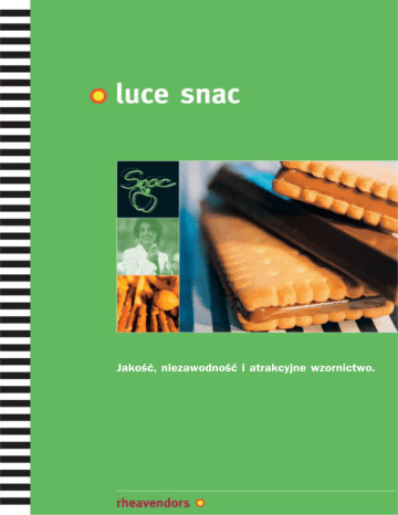 JakoÊç, niezawodnoÊç i atrakcyjne wzornictwo. Bogaty wybór Odpowiednia temperatura Wzornictwo i kolory Automat zawsze gotowy do pracy. Dost´pnych ponad 500 produktów. Przekàski, butelki i puszki oferowane przez wysokiej jakoÊci automat. Du˝a pojemnoÊç, zredukowane wymiary i elastycznoÊç. Idealne rozwiàzanie i odpowiedê na rosnàce zapotrzebowanie na kompleksowà obs∏ug´. Damian wyra˝a trosk´ o Êrodowisko i rutynowo u˝ywa freonu R404A, zgodnie z wytycznymi, które wkrótce stanà si´ obowiàzkowe. Wyprodukowany przez RVG we wspó∏pracy z Damian, dost´pny w kolorach bia∏ym, czarnym oraz srebrnym. System p∏atnoÊci Bezpieczeƒstwo i wyglàd Obudowa jest podwójnie zabezpieczona zgodnie z najwy˝szymi standardami bezpieczeƒstwa. Âwiat∏o jasnej ˝arówki neonowej oraz odbijajàce powierzchnie stali nierdzewnej wewnàtrz, zosta∏y zaprojektowane z myÊlà o maksymalnym wyeksponowaniu artyku∏ów. Dost´pne systemy p∏atnoÊci gotówkowej i bezgotówkowej zgodne z protoko∏em seryjnym, Executive i MDB oraz Master/Slave. Monety, ˝etony Liczba produktów danego rodzaju Karty, systemy kluczy Ca∏kowita elastycznoÊç Technologia Damian redukuje koszty i podnosi zyski ze sprzeda˝y. Mo˝liwoÊç dostosowania automatu do sprzeda˝y puszek, napojów w kartonach, przekàsek, butelek i innych produktów. Wewn´trzna pojemnoÊç jest najwa˝niejsza. Przesuwane pó∏ki ∏atwe do wyj´cia i zastàpienia innymi. przystosowany do wydawania napojów w puszkach i butelkach Perfekcyjny zespó∏ Luce Snac jako cz´Êç Light Line to szczególny, bezkonkurencyjny automat sprzedajàcy. Zawsze i wsz´dzie jest miejscem, gdzie mo˝esz znaleêç chwil´ przyjemnoÊci... Dane techniczne LUCE SNAC Temperatura: Zewn´trzna: 5O-32OC Wewn´trzna: 5O-18OC (2O-18OC tylko dla wersji Pro) Maksymalna pojemnoÊç: 5 / 6 / 7 / 8 pó∏ek 7 spiral na ka˝dej pó∏ce do 56 wyborów Max 1120 sztuk Wymiary: WysokoÊç w mm 1830 SzerokoÊç w mm 800 G∏´bokoÊç w mm 830 Waga 250 kg Napi´cie 230V/16 A Moc 650 W Urzàdzenie ch∏odzàce 3/8 HP z freonem R404A Diagnostyka 6 na wyÊwietlaczu LCD 16x2 Opcje: sensor FTCA EVA/DTS do kontroli danych Chowajàca si´ szuflada do przechowywania produktów Szuflada z powi´kszonà podzia∏kà
