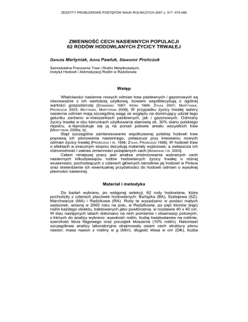 ZESZYTY PROBLEMOWE POSTĘPÓW NAUK ROLNICZYCH 2007 z. 517: 475-486 ZMIENNOŚĆ CECH NASIENNYCH POPULACJI 62 RODÓW HODOWLANYCH śYCICY TRWAŁEJ Danuta Martyniak, Anna Pawluk, Sławomir Prończuk Samodzielna Pracownia Traw i Roślin Motylkowatych, Instytut Hodowli i Aklimatyzacji Roślin w Radzikowie Wstęp Właściwości nasienne nowych odmian traw pastewnych i gazonowych są równowaŜne z ich wartością uŜytkową, bowiem współdecydują o ogólnej wartości gospodarczej [DOMAŃSKI 1997; KERN 1969; śYŁKA 2001; MARTYNIAK, PROŃCZUK 2003; MATYNIAK, MARTYNIAK 2006]. W przypadku Ŝycicy trwałej walory nasienne odmian mają szczególną wagę ze względu na dominujący udział tego gatunku zarówno w mieszankach pastewnych, jak i gazonowych. Odmiany Ŝycicy trwałej w obu kierunkach uŜytkowania stanowią ok. 30% stanu polskiego rejestru, a reprodukuje się ją na ponad połowie areału wszystkich traw [MARTYNIAK 2006a, b]. Stąd szczególne zainteresowanie współczesnej polskiej hodowli traw poprawą ich plonowania nasiennego, zwłaszcza przy kreowaniu nowych odmian Ŝycicy trwałej [PROŃCZUK i in. 1996; śYŁKA, PROŃCZUK 1996]. W hodowli traw o efektach w znacznym stopniu decydują materiały wyjściowe, a zwłaszcza ich róŜnorodność i zakres zmienności poŜądanych cech [ARSENIUK i in. 2003]. Celem niniejszej pracy jest analiza zróŜnicowania wybranych cech nasiennych kilkudziesięciu rodów hodowlanych Ŝycicy trwałej o róŜnej wczesności, pochodzących z czterech głównych ośrodków jej hodowli w Polsce oraz stwierdzenie ich ewentualnej przydatności do hodowli odmian o wysokiej plenności nasiennej. Materiał i metodyka Do badań wybrano, po wstępnej selekcji, 62 rody hodowlane, które pochodziły z czterech placówek hodowlanych: BartąŜka (BA), Szelejewa (SZ), Marchwacza (MA) i Radzikowa (RA). Rody te wysadzano w postaci małych sadzonek, wiosną w 2000 roku na polu, w Radzikowie, po pięć klonów (kęp) roślin kaŜdego obiektu, traktowanych jako powtórzenia, w rozstawie 40 x 40 cm. W dwu następnych latach dokonano na nich pomiarów i obserwacji polowych, z których do analizy wybrano: wysokość roślin, liczbę kwiatostanów na roślinie, szerokość liścia flagowego oraz początek kłoszenia (10% roślin). Natomiast szczegółowe analizy laboratoryjne obejmowały osiem cech struktury plonu nasion: masa nasion z rośliny w g (Mnr), długość kłosa w cm (Dłk), liczba D. Martyniak, A. Pawluk, S. Prończuk 476 kłosków w kłosie (Lkł), zbitość kłosa (Zk) w skali 1-9 (1 - kłos luźny, 9 - bardzo zbity), płodność kłosa w procentach (Pk), masa nasion z kłosa (kwiatostanu) w mg (Mk), masa tysiąca nasion w g (MTN). Wyniki z dwóch lat badań analizowano dla całej populacji i czterech grup wczesności, określonych liczbą dni od 1 kwietnia do początku kłoszenia. Wszystkie cechy struktury plonu, podobnie jak pomiary polowe, określano na wybranych losowo 20 pędach generatywnych z kaŜdego powtórzenia (kępy). Poza wyliczeniami średnich dla cech określano współczynniki zmienności, współczynniki korelacji liniowej oraz analizę rozkładu zmienności wybranych cech, liczbowy i w postaci histogramów. Wyniki i dyskusja Zmienność badanych cech Ogólnie badany materiał charakteryzował się bardzo duŜą zmiennością. Z analizowanych cech największy współczynnik zmienności (CV) w całej populacji wyliczono dla masy nasion z rośliny (46,7%) i liczby kwiatostanów (45,0%), a następnie dla MTN (35,5%) oraz masy nasion z kłosa (34,8%) i płodności kłosa (34,5%), zaś najmniejszy (10-16%) dla liczby kłosków w kłosie, zbitości kłosa i długości kwiatostanu (tab. 1). MARTUSIEWICZ [1974] uwaŜa, ze długość kwiatostanu jest charakterystyczną cechą plenności nie tylko dla gatunku, ale takŜe dla odmiany czy rodu. Tabela 1; Table 1 Zmienność badanych cech 62 rodów hodowlanych Lolium perenne L. Variability of examined traits of 62 Lolium perenne L. strains Cecha; Feature Liczba kwiatostanów na roślinie Inflorescence number per plant Długość kłosa (cm); Spike length (cm) Liczba kłosków w kłosie; Number of panicles per spike Zbitość kłosa (w skali 1-9)*; Spike density (in scale 1-9)* Zakres; Range Średni a Mean CV (%) od-do from-to róŜnica (%); difference (%) 67-359 536 223 45,0 15,4 17-34 67 24,8 17,2-28,4 165 23,5 10,3 4,0-7,0 175 4,7 16,4 Płodność kłosa (%); Fertility of spike (%) 12,1-86,8 717 52,2 34,5 Masa nasion z kwiatostanu (mg) Mass of seeds per inflorescence (mg) 5,0-27,7 554 14,4 34,8 Masa nasion z rośliny (g); Seed yield per plant (g) 5,9-52,6 891 20,1 46,7 MTN (g); TSW (g) 1,3-4,5 346 1,8 35,8 Początek kłoszenia 10% (liczba dni od 1 IV) Beginning of earing 10% (number of days after April 1-st) 41-67 163 54,9 13,7 Szerokość liścia flagowego (mm); Flag leaf width (mm) 2,0-6,0 300 3,5 20,4 Wysokość roślin w fazie pełni kwitnienia (cm) Plant height (cm) at full inflorescend 50-85 170 66,1 20,4 * CV 1 - luźny; loose, 9 - bardzo zbity; very dense współczynnik zmienności; variation coefficient ZMIENNOŚĆ CECH NASIENNYCH POPULACJI ... 477 478 D. Martyniak, A. Pawluk, S. Prończuk ZMIENNOŚĆ CECH NASIENNYCH POPULACJI ... 479 W badanej populacji rodów płodność kłosa wyniosła średnio ok. 52%, lecz wahała się od 12 aŜ do 87% (tab. 1) i nie róŜnicowała się wyraźniej w poszczególnych grupach wczesności (tab. 2). W ARRINGA [1995] podaje, Ŝe o płodności kłosa decydują kwiatki, z których 50-80% zawiązuje nasiona, zaś 40% z nich produkuje nasiona pełne. Natomiast spośród innych cech plonotwórczych z wczesnością najwyraźniej związana była MTN - większa u rodów średnio wczesnych i średnio późnych, a mniejsza u najwcześniejszych i najpóźniejszych (rys. 1, tab. 1). W grupie rodów wczesnych odnotowano równieŜ mniejszą długość kwiatostanu oraz liczbę kłosków w kłosie, a u form średnio wczesnych wyraźnie lepszą zbitość kłosa i większą masę nasi