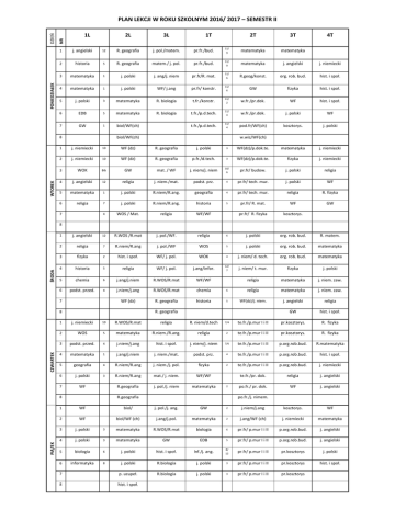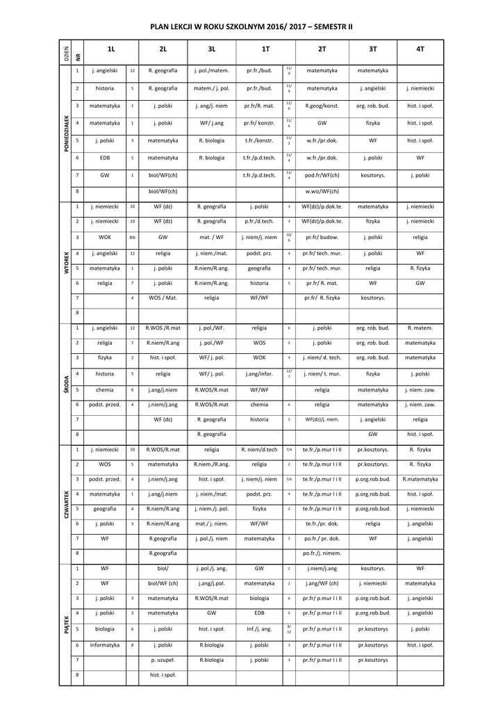 PONIEDZIAŁEK NR LEKCJI DZIEŃ PLAN LEKCJI W ROKU SZKOLNYM 2016/ 2017 – SEMESTR II 1L 3L 1T 2T 3T 4T 1 j. angielski 12 R. geografia j. pol./matem. pr.fr./bud. 11/ 9 matematyka matematyka 2 historia 5 R. geografia matem./ j. pol. pr.fr./bud. 11/ 9 matematyka j. angielski j. niemiecki 3 matematyka 1 j. polski j. ang/j. niem pr.fr/R. mat. 11/ 6 R.geog/konst. org. rob. bud. hist. i społ. 4 matematyka 1 j. polski WF/ j.ang pr.fr/ konstr. 11/ 6 GW fizyka hist. i społ. 5 j. polski 3 matematyka R. biologia t.fr./konstr. 11/ 2 w.fr./pr.dok. WF hist. i społ. 6 EDB 5 matematyka R. biologia t.fr./p.d.tech. 11/ 4 w.fr./pr.dok. j. polski WF 7 GW 1 biol/WF(ch) t.fr./p.d.tech. 11/ 4 pod.fr/WF(ch) kosztorys. j. polski biol/WF(ch) 8 WTOREK 2L w.wiz/WF(ch) 1 j. niemiecki 10 WF (dz) R. geografia j. polski 3 WF(dz)/p.dok.te. matematyka j. niemiecki 2 j. niemiecki 10 WF (dz) R. geografia p.fr./d.tech. 3 WF(dz)/p.dok.te. fizyka j. niemiecki 3 WOK Bib GW mat. / WF j. niem/j. niem 10/ 6 pr.fr/ budow. j. polski religia 4 j. angielski 12 religia j. niem./mat. podst. prz. 4 pr.fr/ tech. mur. j. polski WF 5 matematyka 1 j. polski R.niem/R.ang. geografia 4 pr.fr/ tech. mur. religia R. fizyka 6 religia 7 j. polski R.niem/R.ang. historia 5 pr.fr/ R. mat. WF GW 4 WOS / Mat. religia WF/WF pr.fr/ R. fizyka kosztorys. 7 ŚRODA 8 1 j. angielski 12 R.WOS /R.mat j. pol./WF. religia 6 j. polski org. rob. bud. R. matem. 2 religia 7 R.niem/R.ang j. pol./WF WOS 5 j. polski org. rob. bud. matematyka 3 fizyka 2 hist. i społ. WF/ j. pol. WOK 4 j. niem/ d. tech. org. rob. bud. matematyka 4 historia 5 religia WF/ j. pol. j.ang/infor. 12/ 7 j. niem/ t. mur. fizyka j. polski 5 chemia 6 j.ang/j.niem R.WOS/R.mat WF/WF religia matematyka j. niem. zaw. 6 podst. przed. 4 j.niem/j.ang R.WOS/R.mat chemia 6 religia matematyka j. niem. zaw. WF (dz) R. geografia historia 5 WF(dz)/j. niem. j. angielski religia GW hist. i społ. 7 R. geografia CZWARTEK 8 1 j. niemiecki 10 R.WOS/R.mat religia R. niem/d.tech 7/4 te.fr./p.mur I i II pr.kosztorys. R. fizyka 2 WOS 5 matematyka R.niem./R.ang. religia 2 te.fr./p.mur I i II pr.kosztorys. R. fizyka 3 podst. przed. 4 j.niem/j.ang hist. i społ. j. niem/j. niem 7/6 te.fr./p.mur I i II p.org.rob.bud. R.matematyka 4 matematyka 1 j.ang/j.niem j. niem./mat. podst. prz. 4 te.fr./p.mur I i II p.org.rob.bud. hist. i społ. 5 geografia 4 R.niem/R.ang j. niem./j. pol. fizyka 2 te.fr./p.mur I i II p.org.rob.bud. j. niemiecki 6 j. polski 3 R.niem/R.ang mat./ j. niem. WF/WF te.fr./pr. dok. religia j. angielski 7 WF R.geografia j. pol./j. niem matematyka po.fr./ pr. dok. WF j. angielski R.geografia 8 PIĄTEK 2 po.fr./j. nimem. 1 WF biol/ j. pol./j. ang. GW 2 j.niem/j.ang kosztorys. WF 2 WF biol/WF (ch) j.ang/j.pol. matematyka 2 j.ang/WF (ch) j. niemiecki matematyka 3 j. polski 3 matematyka R.WOS/R.mat biologia 6 pr.fr/ p.mur I i II p.org.rob.bud. j. angielski 4 j. polski 3 matematyka GW EDB 5 pr.fr/ p.mur I i II p.org.rob.bud. j. angielski 5 biologia 6 j. polski hist. i społ. Inf./j. ang. 8/ 12 pr.fr/ p.mur I i II pr.kosztorys j. polski 6 informatyka 8 j. polski R.biologia j. polski 3 pr.fr/ p.mur I i II pr.kosztorys hist. i społ. 7 p. uzupeł. R.biologia j. polski 3 pr.fr/ p.mur I i II pr.kosztorys 8 hist. i społ.