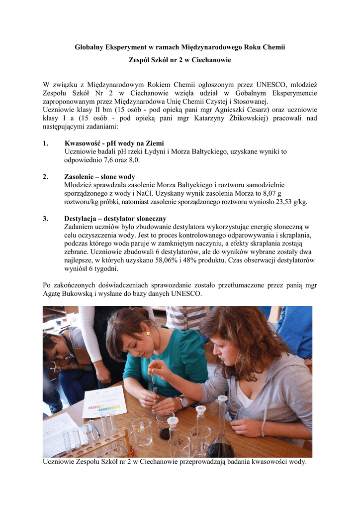Globalny Eksperyment w ramach Międzynarodowego Roku Chemii Zespól Szkół nr 2 w Ciechanowie W związku z Międzynarodowym Rokiem Chemii ogłoszonym przez UNESCO, młodzieŜ Zespołu Szkół Nr 2 w Ciechanowie wzięła udział w Gobalnym Eksperymencie zaproponowanym przez Międzynarodowa Unię Chemii Czystej i Stosowanej. Uczniowie klasy II bm (15 osób - pod opieką pani mgr Agnieszki Cesarz) oraz uczniowie klasy I a (15 osób - pod opieką pani mgr Katarzyny śbikowskiej) pracowali nad następującymi zadaniami: 1. Kwasowość - pH wody na Ziemi Uczniowie badali pH rzeki Łydyni i Morza Bałtyckiego, uzyskane wyniki to odpowiednio 7,6 oraz 8,0. 2. Zasolenie – słone wody MłodzieŜ sprawdzała zasolenie Morza Bałtyckiego i roztworu samodzielnie sporządzonego z wody i NaCl. Uzyskany wynik zasolenia Morza to 8,07 g roztworu/kg próbki, natomiast zasolenie sporządzonego roztworu wyniosło 23,53 g/kg. 3. Destylacja – destylator słoneczny Zadaniem uczniów było zbudowanie destylatora wykorzystując energię słoneczną w celu oczyszczenia wody. Jest to proces kontrolowanego odparowywania i skraplania, podczas którego woda paruje w zamkniętym naczyniu, a efekty skraplania zostają zebrane. Uczniowie zbudowali 6 destylatorów, ale do wyników wybrane zostały dwa najlepsze, w których uzyskano 58,06% i 48% produktu. Czas obserwacji destylatorów wyniósł 6 tygodni. Po zakończonych doświadczeniach sprawozdanie zostało przetłumaczone przez panią mgr Agatę Bukowską i wysłane do bazy danych UNESCO. Uczniowie Zespołu Szkół nr 2 w Ciechanowie przeprowadzają badania kwasowości wody.