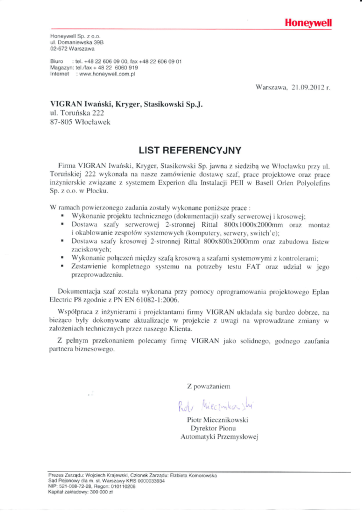 Honeywell Honeywell Sp. z o.o. ul. Domaniewska 398 02-672 W Biuro aszawa : Iel. +48 lvlagazyn: tel./fax 22 606 09 00. lax +48 22 606 09 01 48 22 6060 919 + lnternet ;www.honeywell.com.pl Wurszrwr, 21 .09.2012 r. VIGRAN Iwański, Kryger, Stasikowski Sp.J. ul. Toruńska 222 87-805 Włocławek LIST REFERENCYJNY Firma VIGRAN Iwański, Kryger' Stasikowski Sp. jawna z siedzibą we Włocławku przy ul' Toruńskiej 222 wykonała na nasze zamówienie dostawę szaf' prace projektowe oraz prace inżynierskie zwtązane Z Systemem Experion dla lnstalacji PEII w Basell orlen Polyolefins Sp.zo.o.wPłocku. W ramach powierzonego Zadania ZoStały wykonane poniższe prace . Wykonanie projektu technicznego (dokumentacji) szafy serwerowej i krosowej; . Dostawa szafy serwerowej 2_stronnej Rittal 800x1000x2000mm oraz montaŻ i okablowanie zespołów systemowych (komputery, Serwery, switch'e); r Dostawa szafy krosowej 2-stronnej Rittal 800x800x2000mm oraz zabudowa listew zaciskowych; . Wykonanie połączeń między szalą krosową a szafami systemowymi z kontrolerami; . Zestawienie kompletnego Systemu na potrzeby testu FAT oraz udział w jego : przeprowadzeniu. Dokumentacja szaf została wykonana przy pomocy oprogramowania projektowego Eplan Electric P8 zgodnie z PN EN 61082-1:2006. Współpraca z inŻynierami i projektantami firmy VIGRAN układałasię bardzo dobrze' na bieŹąco były dokonywane aktualizacje w projekcie z uwagi na wprowadzane zmiany w założeniach technicZnych przez naszego Klienta. Z pełnym przekonaniem polecamy firmę VIGRAN jako solidnego, godnego zaufania partnera biznesowego. Z powaŻaniem ^tl lr lr t1 J r (\ -' iriJ "" - 'v. 1.. v'1 Piotr Miecznikowski Dyrektor Pionu Automatyki Przemysłowej Prezes ZarząduI Wojciech Krajewski, Czło|ekzafząd]: Elżbieta Komorowska st- Warszawy KRS 0000033934 NIP: 521-008-72-28, Regon: 010110206 sąd Rejonowy dla m' Kapitał zakładowy: 300 000 zł