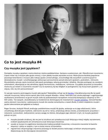 Co to jest muzyka #4 Czy muzyka jest językiem? Pomiędzy muzyką a językiem można dostrzec istotne podobieństwa. Zarówno w potocznym, jak i filozoficznym rozumieniu. Często mówi się o muzyce jako języku emocji, o tym jakoby muzyka wyrażała uczucia. Może jeszcze bardziej popularne pozostaje twierdzenie o muzyce jako rodzaju języka uniwersalnego, zrozumiałego dla wszystkich uczestniczących w doświadczeniu muzyki i umożliwiającego jednoczące porozumienie ponad własnymi językami, podziałami, różnicami. Muzykolodzy opisują często tonalność jako język posiadający własną gramatykę i składnię. Muzyka posługuje się zasadami, schematami, obowiązują w niej określone reguły harmoniczne, melodyczne, rytmiczne. Czy gdyby przyswoić je wszystkie, można by już mówić o rozumieniu muzyki? Czy to wystarczy, by być biegłym w posługiwaniu się muzycznym językiem i, co więcej, móc się nim porozumiewać? Co sprzyja naszemu postrzeganiu muzyki jako języka? Należałoby cofnąć się do baroku i charakterystycznej dla tej epoki retoryki muzycznej, którą można opisać jako ścisły związek dźwięku i słowa. Retoryka czyli sztuka pięknego i sugestywnego wysławiania przeniesiona na grunt muzyki stała się podstawowym narzędziem muzycznej kompozycji i ekspresji w XVI i XVII wieku. Ten związek, ukształtowany na fundamencie dominującej do nowożytności muzyki wokalnej, stanowił bardzo ważny element rozumienia i wykonywania muzyki do czasów romantyzmu a nawet dłużej. A zatem zespolenie muzyki i języka zakorzenione jest głęboko w tradycji. Roger Scruton, brytyjski filozof, analizując podobieństwa muzyki do języka, wskazuje na te jego właściwości, które umożliwiają abstrakcyjne myślenie, oderwanie się od tu i teraz, artykulację obrazu świata, przewidywanie przyszłości i mówienie o przeszłości. Jednocześnie zwraca uwagę na różnice, decydujące jego zdaniem o tym, że muzyka językiem jednak nie jest: · · · muzyka posiada strukturę, ale nie jest to struktura ani syntaktyczna (czyli dotycząca relacji między wyrażeniami, znakami językowymi) ani semantyczna (czyli dotycząca znaczenia). zasady w muzyce to uogólniona teoretycznie tradycja praktyki muzycznej, a muzyczne znaczenie to kwestia ekspresji i zależy w związku z tym w dużej mierze od kontekstu. regularności ekspresyjnego znaczenia powstają na skutek procesu twórczego, w którym artystyczne gesty dopasowują się do otaczającej rzeczywistości. Nie ma w związku z tym w muzyce zasad, twierdzi Scruton, które gwarantują jej ekspresję, jak to jest w przypadku języka. Jeśli zmieni się zasady, zmienia się jednocześnie możliwości ekspresji. Słynny językoznawca szwajcarski Ferdinand de Saussure (1857-1913) twierdzi, że język to system znaków, logicznie uporządkowanych i wchodzących ze sobą w relacje. W swej teorii zakłada nierozerwalność znaczenia i struktury. Z pozoru łatwo przenieść te założenia na grunt muzyczny; nie można przecież poddawać w wątpliwość istnienia ani struktury ani znaczenia w muzyce. Jeżeli znaczenie i struktura pozostają ściśle ze sobą powiązane, to klucz do muzycznego znaczenia można by odnaleźć, rozpoznając syntaktyczną strukturę dzieła. Wszak istnieją w dziele muzycznym frazy, zdania, elementy składające się na spójny przebieg myśli muzycznej postępującej, wydawałoby się, w określony i logiczny sposób. Jednak, w jaki sposób te struktury syntaktyczne mogą zawierać w sobie znaczenie? W przeciwieństwie do językowej, muzyczną składnię słychać, „zamieszkuje ona doświadczenie muzyki”, pisze Roger Scruton. To, co słyszymy, wydaje się właściwe, rozumiemy ten „język”, posiadając niepojęciowy dostęp do kulturowego kodu, na który składają się dur i moll, tonika i dominanta, dysonanse i konsonanse. Wydaje się jednak właściwe dopiero po „wynalezieniu“ określonych układów, harmonii, struktur, czyli swoistego kodu. Premierę Święta wiosny Strawińskiego wygwizdano, bo nie posiadano jeszcze wówczas do tej muzyki kodu. Równocześnie relacja między muzycznym znakiem a tym, co on wskazuje jest płynna. Nie jest ustalona raz na zawsze i zawiera się gdzieś pomiędzy tymi elementami. Ta nieokreślona przestrzeń to miejsce na interpretację i doświadczanie. „Dzieło sztuki jest możliwością, daną odbiorcy, a nie jednoznacznym stanem” (Jan Świdziński). Muzyka to integralna wielość znaczeń, z których każde zawsze definiuje się od nowa. Podczas gdy w języku syntaktyczna konstrukcja zdania wyjaśniona zostaje przez jej semantyczny cel, w muzyce cel jest inny lub nie ma go wcale. Według Theodora W. Adorna (1903-1969), niemieckiego filozofa, muzyka, ten „najbardziej elokwentny z języków” przypomina go, ale nim nie jest. Nie buduje systemu semiotycznego, ale mówi coś ludzkiego, coś co zawiera się tylko i wyłącznie w niej i nie może być od niej oderwane. Dla Adorna muzyka, jak język, to zorganizowane czasowo dźwięki, które są jednak czymś więcej niż tylko dźwiękami. To, co mówią, przynależy do muzyki, nigdy nie znajduje się poza nią. Mimo zorganizowanej struktury muzyka nie posługuje się pojęciami, choć jakaś forma pojęć jest w muzyce obecna. Nie wskazują one wszelako na nic innego poza samymi sobą. Pojęcia te nie są, jak w języku, znaczeniami. Charakterystyczną cechą muzyki pozostaje, w przeciwieństwie do języka, jej niejednoznaczność. Theodor W. Adorno mówi: Każdy muzyczny fenomen wskazuje na coś poza sobą, przypominając nam coś, pozostając w oderwaniu od czegoś lub wzbudzając nasze oczekiwania. Taki całokształt transcendencji muzycznych elementów partykularnych jest „treścią”; tym, co się w muzyce wydarza. Jednak, jeśli muzyczne struktura lub forma mają być czymś więcej niż tylko dydaktycznym schematem, nie mogą wskazywać na treści jedynie z zewnątrz, lecz muszą być ich w
