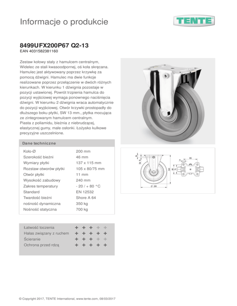 Informacje o produkcie 8499UFX200P67 Q2-13 EAN 4031582381160 Zestaw kołowy stały z hamulcem centralnym, Widelec ze stali kwasoodpornej, oś koła skręcana. Hamulec jest aktywowany poprzez krzywkę za pomocą dźwigni. Hamulec ma dwie funkcje realizowane poprzez przełączenie w dwóch różnych kierunkach. W kierunku 1 dźwignia pozostaje w pozycji ustawionej. Powrót trzpienia hamulca do pozycji wyjściowej wymaga ponownego naciśnięcia dźwigni. W kierunku 2 dźwignia wraca automatycznie do pozycji wyjściowej. Otwór krzywki prostopadły do dłuższego boku płytki, SW 13 mm., płytka mocująca ze zintegrowanym hamulcem centralnym. Piasta z poliamidu, bieżnia z niebrudzącej, elastycznej gumy, małe osłonki. Łożysko kulkowe precyzyjne uszczelnione. Dane techniczne Koło-Ø 200 mm Wymiary płytki 137 x 115 mm Szerokość bieżni Rozstaw otworów płytki Otwór płytki Wysokość zabudowy Zakres temperatury Standard Twardość bieżni nośność dynamiczna Nośność statyczna Łatwość toczenia Hałas związany z ruchem Ścieranie Ochrona przed rdzą 46 mm 105 x 80/75 mm 11 mm 240 mm - 20 / + 80 °C EN 12532 Shore A 64 350 kg 700 kg + + + + + + + + + + + + + + + + + + + + © Copyright 2017, TENTE International, www.tente.com, 08/03/2017 Informacje o produkcie 8499UFX200P67 Q2-13 EAN 4031582381160 © Copyright 2017, TENTE International, www.tente.com, 08/03/2017