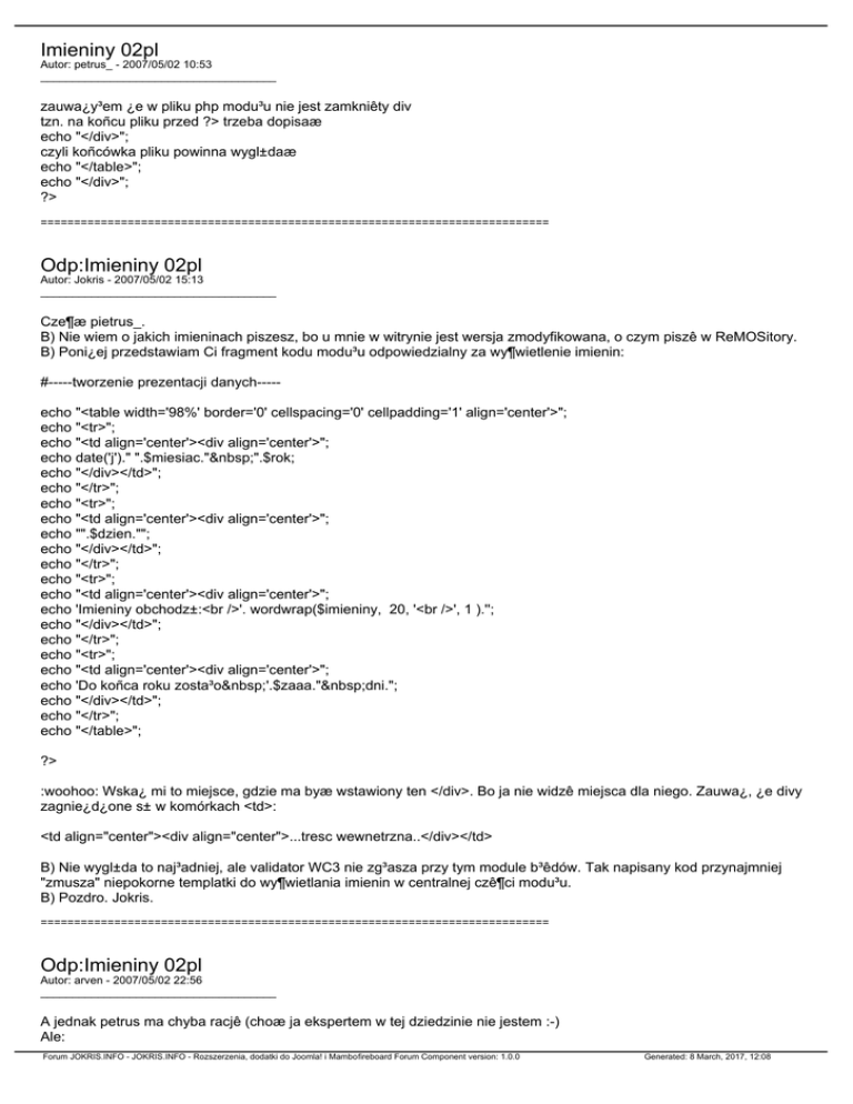 W module Imieniny 0.2pl pobranym z tego serwisu koñcówka kodu wygl±da tak:
