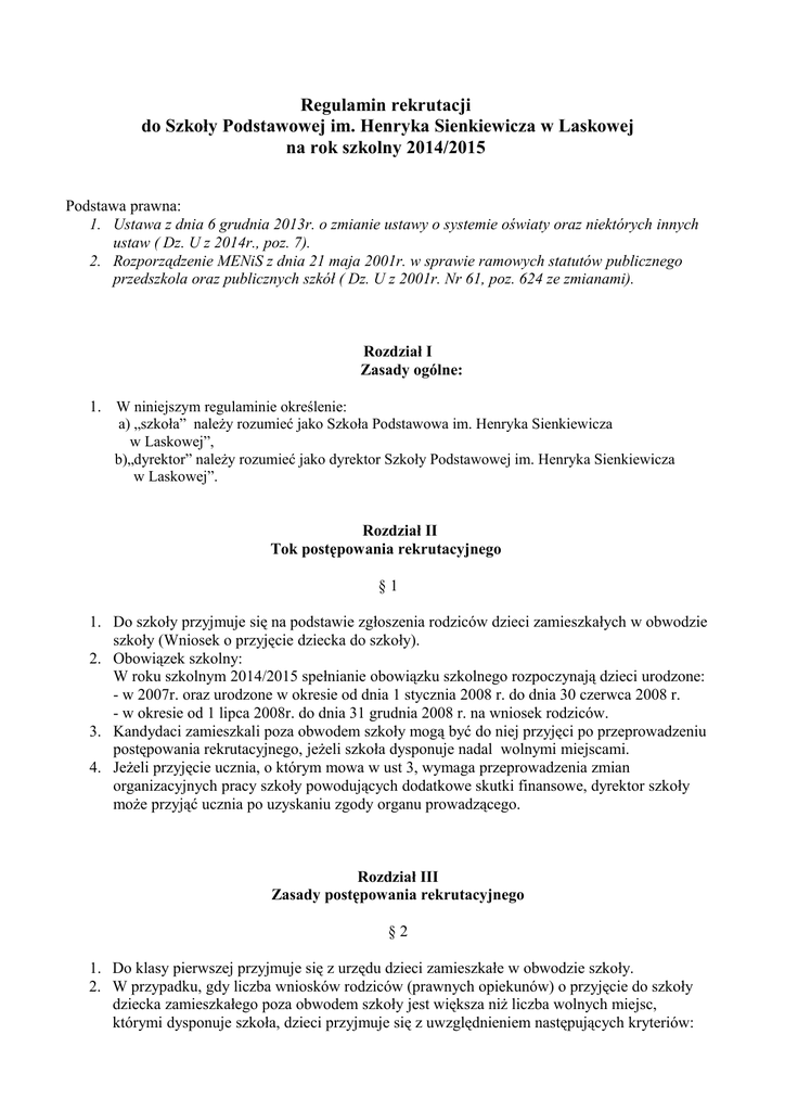 Regulamin rekrutacji do Szkoły Podstawowej im. Henryka Sienkiewicza w Laskowej na rok szkolny 2014/2015 Podstawa prawna: 1. Ustawa z dnia 6 grudnia 2013r. o zmianie ustawy o systemie oświaty oraz niektórych innych ustaw ( Dz. U z 2014r., poz. 7). 2. Rozporządzenie MENiS z dnia 21 maja 2001r. w sprawie ramowych statutów publicznego przedszkola oraz publicznych szkół ( Dz. U z 2001r. Nr 61, poz. 624 ze zmianami). Rozdział I Zasady ogólne: 1. W niniejszym regulaminie określenie: a) „szkoła” należy rozumieć jako Szkoła Podstawowa im. Henryka Sienkiewicza w Laskowej”, b)„dyrektor” należy rozumieć jako dyrektor Szkoły Podstawowej im. Henryka Sienkiewicza w Laskowej”. Rozdział II Tok postępowania rekrutacyjnego §1 1. Do szkoły przyjmuje się na podstawie zgłoszenia rodziców dzieci zamieszkałych w obwodzie szkoły (Wniosek o przyjęcie dziecka do szkoły). 2. Obowiązek szkolny: W roku szkolnym 2014/2015 spełnianie obowiązku szkolnego rozpoczynają dzieci urodzone: - w 2007r. oraz urodzone w okresie od dnia 1 stycznia 2008 r. do dnia 30 czerwca 2008 r. - w okresie od 1 lipca 2008r. do dnia 31 grudnia 2008 r. na wniosek rodziców. 3. Kandydaci zamieszkali poza obwodem szkoły mogą być do niej przyjęci po przeprowadzeniu postępowania rekrutacyjnego, jeżeli szkoła dysponuje nadal wolnymi miejscami. 4. Jeżeli przyjęcie ucznia, o którym mowa w ust 3, wymaga przeprowadzenia zmian organizacyjnych pracy szkoły powodujących dodatkowe skutki finansowe, dyrektor szkoły może przyjąć ucznia po uzyskaniu zgody organu prowadzącego. Rozdział III Zasady postępowania rekrutacyjnego §2 1. Do klasy pierwszej przyjmuje się z urzędu dzieci zamieszkałe w obwodzie szkoły. 2. W przypadku, gdy liczba wniosków rodziców (prawnych opiekunów) o przyjęcie do szkoły dziecka zamieszkałego poza obwodem szkoły jest większa niż liczba wolnych miejsc, którymi dysponuje szkoła, dzieci przyjmuje się z uwzględnieniem następujących kryteriów: a) kontynuowanie nauki w Szkole Podstawowej im. Henryka Sienkiewicza w Laskowej, b) posiadanie rodzeństwa w innych klasach szkoły, c) przyjęcie dziecka nie powoduje likwidacji oddziałów w macierzystej placówce z obwodu ucznia w gminie Zator, d) jeżeli przyjęcie ucznia wymaga przeprowadzenia zmian organizacyjnych pracy szkoły powodujących dodatkowe skutki finansowe, dyrektor szkoły może przyjąć ucznia po uzyskaniu zgody organu prowadzącego. 3. Decyzję o przyjęciu ucznia do szkoły podejmuje dyrektor. §3 1. Złożenie podpisanej przez rodzica /prawnego opiekuna/ dziecka wniosku o przyjęcie jest równoznaczne z potwierdzeniem zgody na proponowane warunki i zobowiązaniem się do ich przestrzegania. 2. W przypadku większej liczby zgłoszeń dzieci do szkoły niż liczba miejsc dyrektor powołuje Komisję Rekrutacyjną. 3. Liczbę dzieci w oddziałach określają odrębne przepisy. Rozdział IV Tryb pracy Komisji Rekrutacyjnej §6 1. Komisję Rekrutacyjną powołuje dyrektor i wyznacza jej przewodniczącego. 2. W skład komisji rekrutacyjnej wchodzą: 1) 2 przedstawicieli Rady Pedagogicznej, 2) 1 przedstawiciel Rady Rodziców. 3. Posiedzenie Komisji Rekrutacyjnej odbywa się na terenie szkoły w terminie ustalonym przez dyrektora. 4. W przypadku zaistnienia sytuacji spornej lub wątpliwej Komisja Rekrutacyjna na posiedzeniu ma prawo podjęcia decyzji w drodze głosowania. Poszczególni członkowie Komisji dysponują jednym głosem. W przypadku, gdy głosowanie nie przyniesie rozstrzygnięcia – decydujący głos należy do przewodniczącego Komisji. 5. Z posiedzenia Komisji Rekrutacyjnej sporządza się protokół. 6. Jeśli rodzic dziecka nieprzyjętego do szkoły podstawowej wystąpi do Komisji Rekrutacyjnej z wnioskiem o sporządzenie uzasadnienia odmowy przyjęcia dziecka, Komisja Rekrutacyjna sporządza uzasadnienie zawierające przyczyny odmowy przyjęcia. Rozdział V Zadania przewodniczącego i członków Komisji Rekrutacyjnej oraz dyrektora szkoły w procesie rekrutacji §7 1. Do zadań przewodniczącego Komisji Rekrutacyjnej należy: 1) pobranie wykazu złożonych kart zgłoszenia dziecka do szkoły podstawowej z odpowiednimi załącznikami od dyrektora; 2) organizacja posiedzenia i kierowanie pracami Komisji zgodnie z przepisami prawa i postanowieniami niniejszego regulaminu; 3) Prowadzenie prac Komisji w czasie każdego posiedzenia z uwzględnieniem następujących czynności: a) wyznaczenie protokolanta, b) zapoznanie i podpisanie przez członków Komisji Rekrutacyjnej zobowiązań zgodnie z ustawą o ochronie danych osobowych, c) zapoznanie z wykazami kart zgłoszenia dziecka do szkoły, d) zapoznanie z zasadami rekrutacji dzieci do szkoły, e) kierowanie rozpatrywaniem przez Komisję kart zgłoszenia dziecka do szkoły, f) nadzorowanie pod względem merytorycznym prawidłowości sporządzania dokumentacji przez Komisję, a w tym składania podpisów przez członków Komisji, protokołowania posiedzenia w czasie jego trwania, sporządzenia list dzieci przyjętych i nieprzyjętych w kolejności alfabetycznej. 2. Do zadań członków Komisji Rekrutacyjnej należy: 1) sprawdzenie wszystkich dokumentów pod względem formalnym i rzeczowym; 2) weryfikowanie złożonych kart pod względem spełniania kryteriów ustawowych oraz wynikających z kryteriów dodatkowych; 3) ustalenie wyników postępowania rekrutacyjnego i sporządzenie listy dzieci przyjętych i nieprzyjętych. 3. Do zadań dyrektora szkoły podstawowej należy: 1) wykonanie niezbędnych czynności związanych z ogłoszeniem rekrutacji; 2) udostępnienie regulaminu rekrutacji; 3) wyjaśnienie zainteresowanym rodzicom zasad określonych w regulaminie rekrutacji; 4) wydawanie i przyjmowanie kart zgłoszenia przyjęcie dziecka do szkoły podstawowej oraz przyjmowanie innych dokumentów dostarczonych przez rodziców; 5) wydanie przewodniczącemu Komisji Rekrutacyjnej wykazu złożonych wniosków i wniosków o przyjęcie dziecka do szkoły z